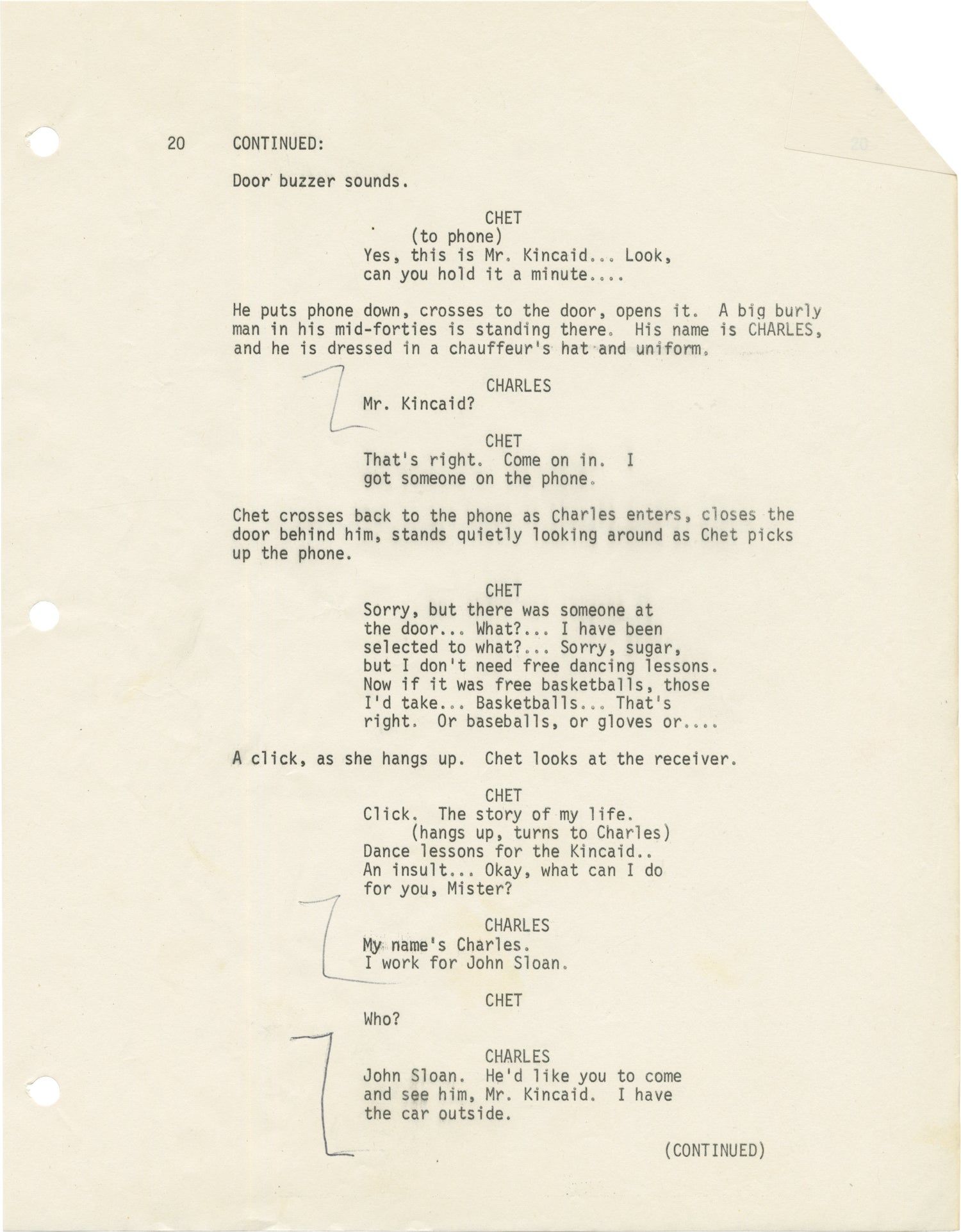 Burbank, CA: Warner Brothers, 1970. Final Draft script for Season 2 Episode 25 of the 1969-1971 television series. Copy belonging to actor Jack Naughton, with his annotations in manuscript ink on two leaves, denoting dialogue. Laid in with the script is a single-page call sheet dated September 30, 1970.