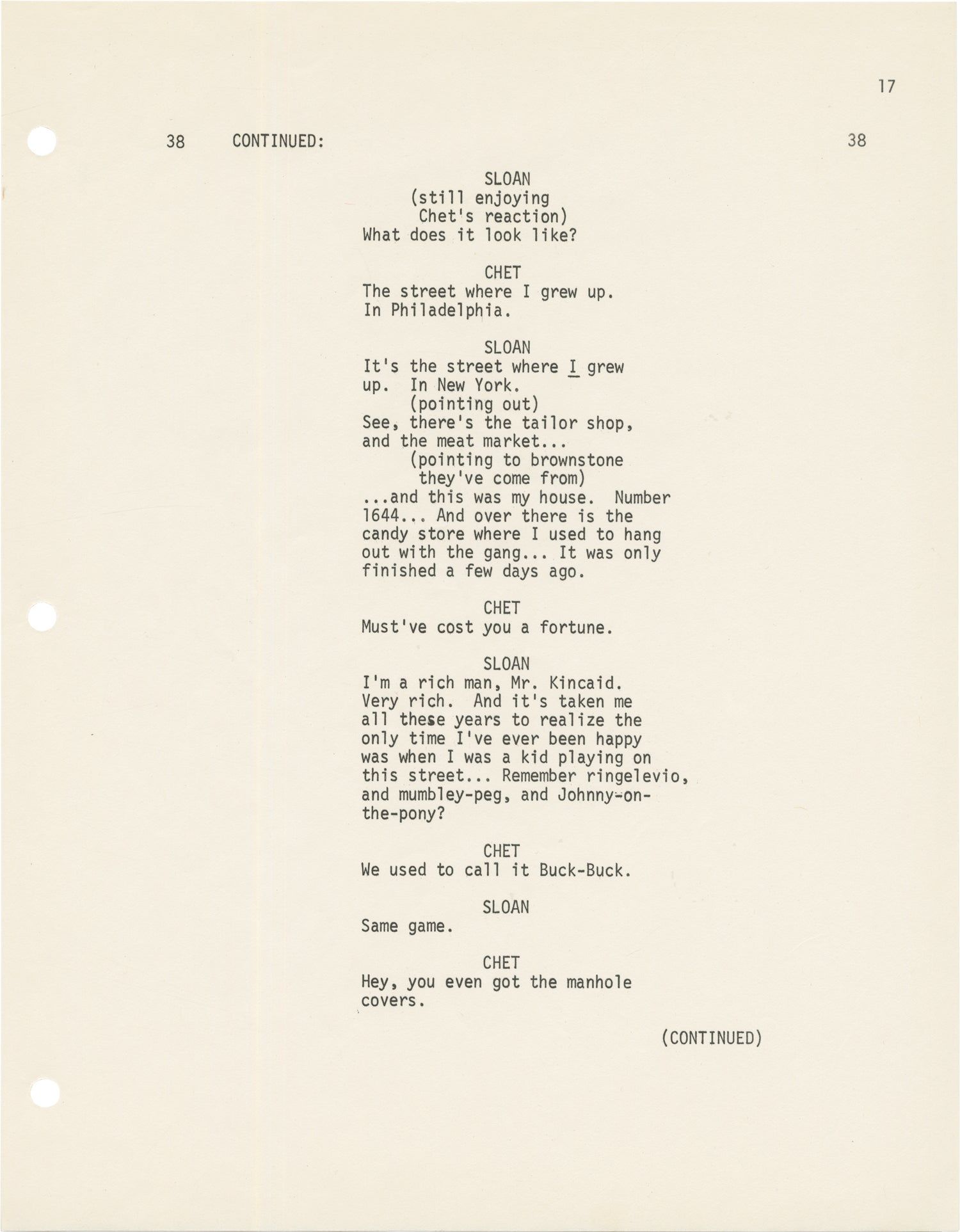 Light green titled wrappers, noted as FINAL DRAFT and production No. 17088 on the front wrapper. Title page present, dated September 23, 1970, noted as FINAL DRAFT, with credit for screenwriter Art Wallace. 37 leaves, with last page of text numbered 36. Mimeograph duplication, rectos only. Pages Fine, wrapper Near Fine, bound internally with two gold brads.