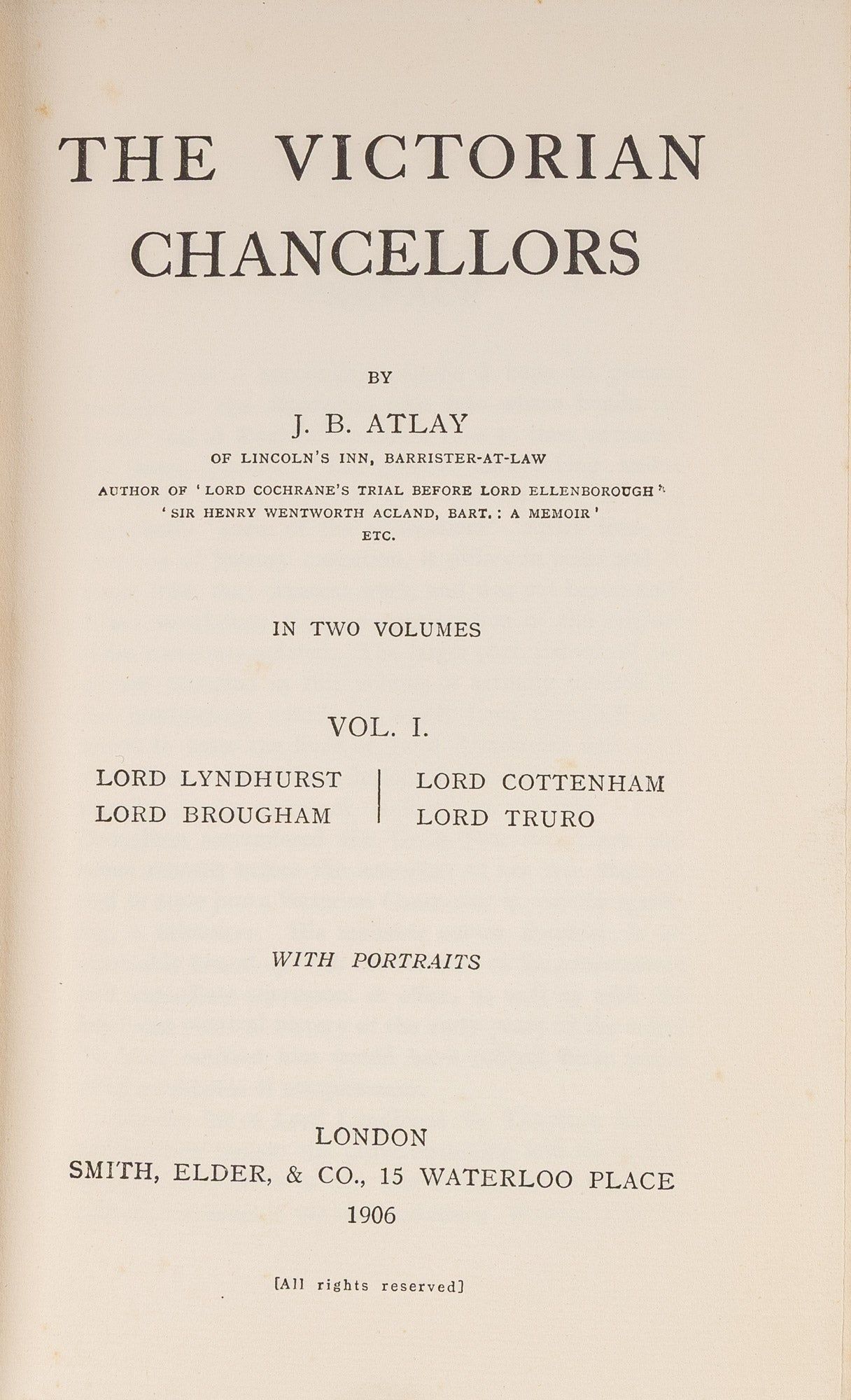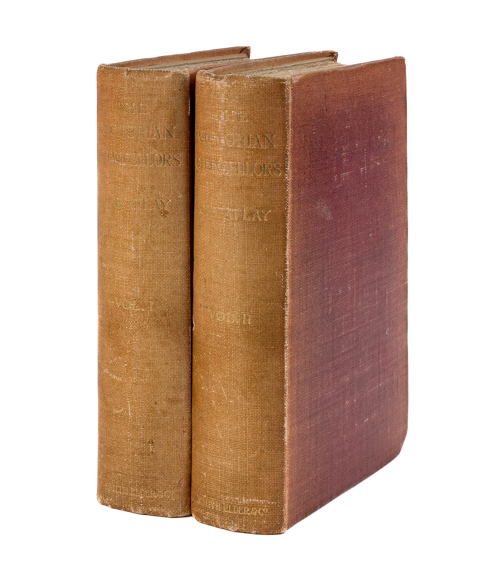 1906. From the Library of Sir Oswald Richard Arthur Simpkin [1879-1936] Atlay, J[ames] B[eresford], [1860-1912]. The Victorian Chancellors. London: Smith, Elder, & Co., 1906-1908. First edition. 2 volumes. With seven portraits. Publisher's cloth, worn with fading to spines, deckle top and fore-edges. Extremities bumped and lightly worn. Hinges cracked, but holding. One-inch gouge to rear cover of volume two. Previous owner's inscription "O.R.A. Simpkin/ from/ G.W. Russell/ 1918" to front free endpaper of volume one. Second previous owner's signatures "O.R.A. Simpkin/ A.P. Whitaker" to front free endpaper of volume two. Interiors clean. A good set with an interesting provenance. $95. * First edition. "Mr. Atlay's book will appeal to many readers. It will appeal to the student of history and political science, for those who have sat upon the Woolsack have left their impress on legislation and upon the development of constitutional government in England; it will appeal to the lover of biography, because it is an excellent example of that branch of literature, and deals with the careers of interesting and noted men; and it will appeal to lawyers, American as well as English, for they will be glad to read the lives of the men whose labors and decisions have done much to mold the development of equity.": S.H.E.F., Harvard Law Review 20 (1906-1907) 249. G[eorge] W[arren] Russell [1854-1937] was a New Zealand politician who served as Minister of Internal Affairs and Minister of Public Health in the wartime National government, and was responsible for the New Zealand government's response to the 1918 influenza epidemic. He presented this copy to lawyer Sir Oswald Richard Arthur Simpkin [1879-1936], who worked in Britain's War Trade Intelligence Department during World War I and later in life became the Warden of Winchester. "Mr. Atlay's book will appeal to many readers. It will appeal to the student of history and political science, for those who have sat upon the Woolsack have left their impress on legislation and upon the development of constitutional government in England; it will appeal to the lover of biography, because it is an excellent example of that branch of literature, and deals with the careers of interesting and noted men; and it will appeal to lawyers, American as well as English, for they will be glad to read.