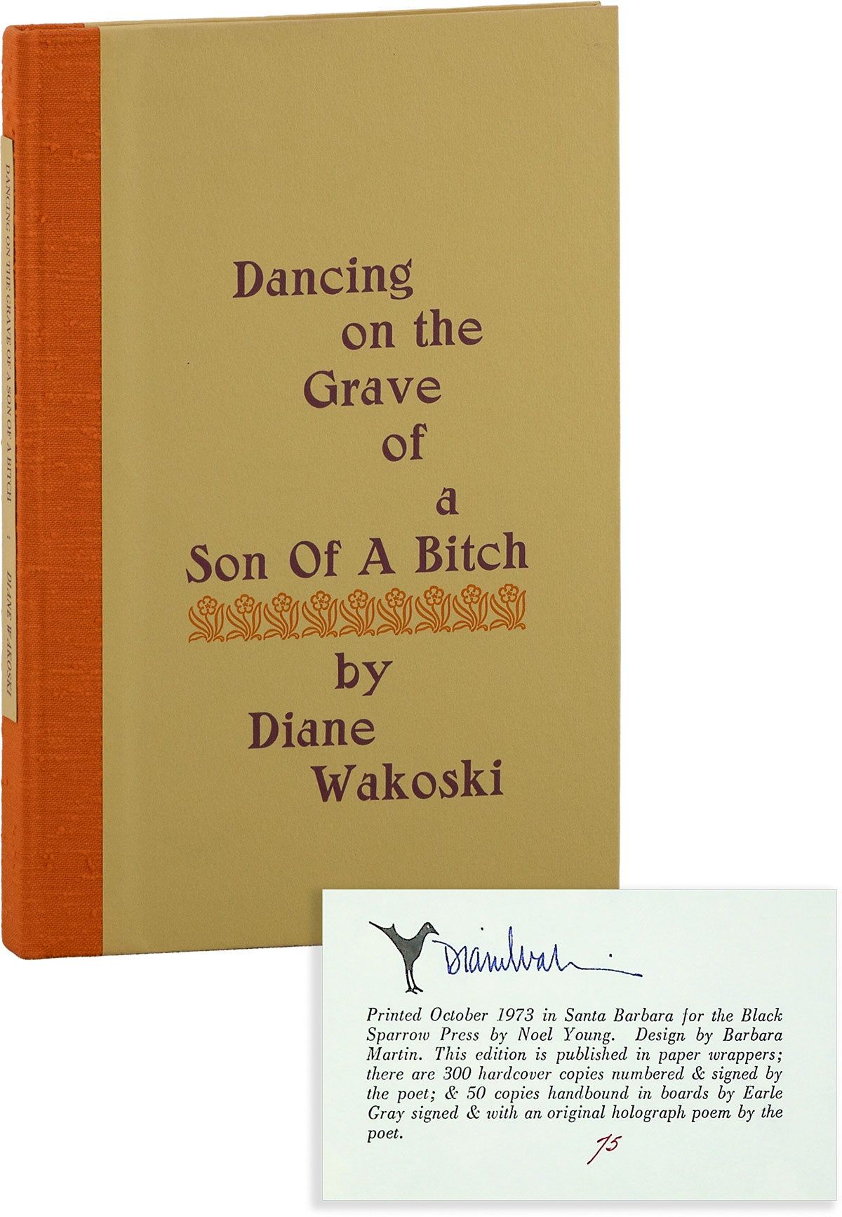 Los Angeles: Black Sparrow Press, 1973. First Edition. Limited Issue, one of 300 numbered copies specially bound and signed by the author, this being copy no.75. Octavo (24.5cm); decorative paper-covered boards and orange cloth backstrip, with title label mounted to spine; publisher's original acetate dustjacket; [12],13-137,[5]pp. Fine in a Very Good+ dustjacket, lightly rubbed, with a small chip to upper spine panel and some light curling along the upper edge. MORROW & COONEY 163b.