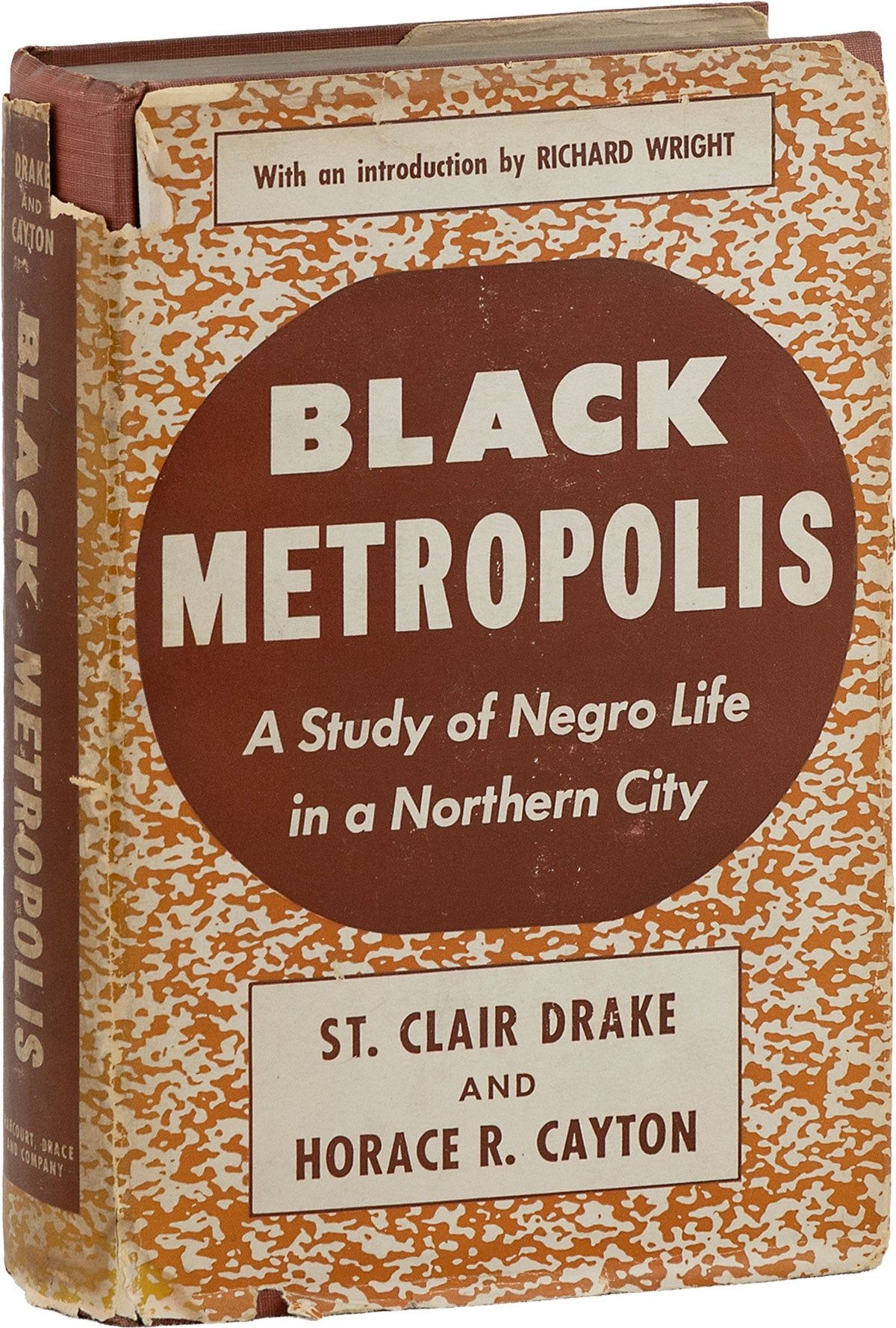 New York: Harcourt, Brace and Company, 1945. First Edition. First Printing. Octavo (22cm); russet cloth, blocked and titled in dark brown and beige on spine; dustjacket; xxxiv,[2]-809,[3]pp, with publisher's errata slip tipped onto front hinge. Some dust-soil to upper edge of textblock, spine ends nudged, upper corners gently bumped (but still sharp), with a faint dampstain to heel; contents clean; Very Good. Dustjacket is unclipped (priced $5.00), worn, spine-sunned, with losses to spine ends and corners, numerous tears and attendant creases, with a corresponding dampstain to base of spine panel; Good to Very Good. Sociological profile of the African-American population in Chicago, with particular attention paid to the South Side. With an introduction by Richard Wright. BLOCKSON 2378. 86470.