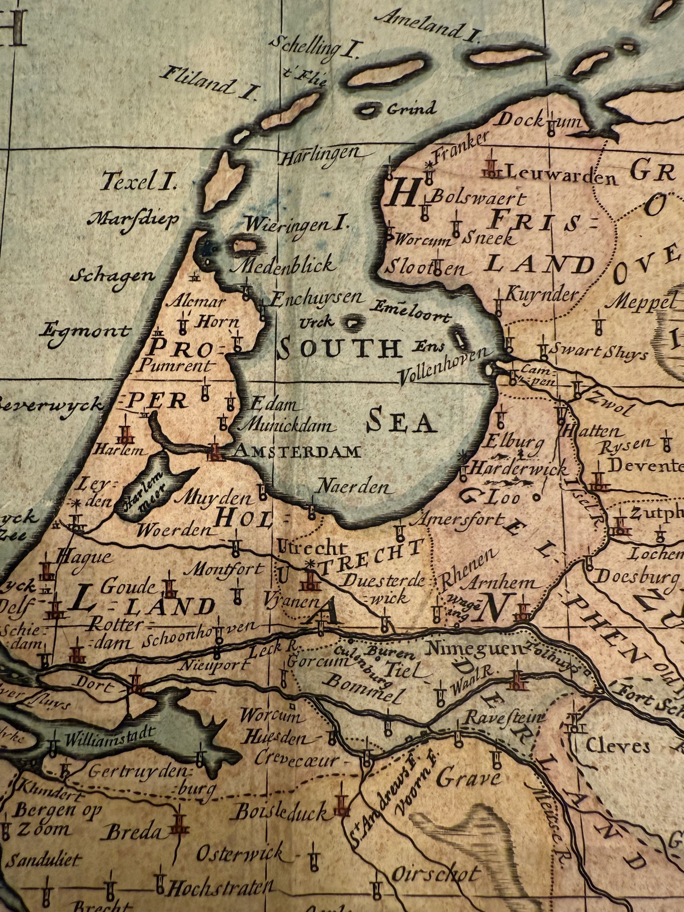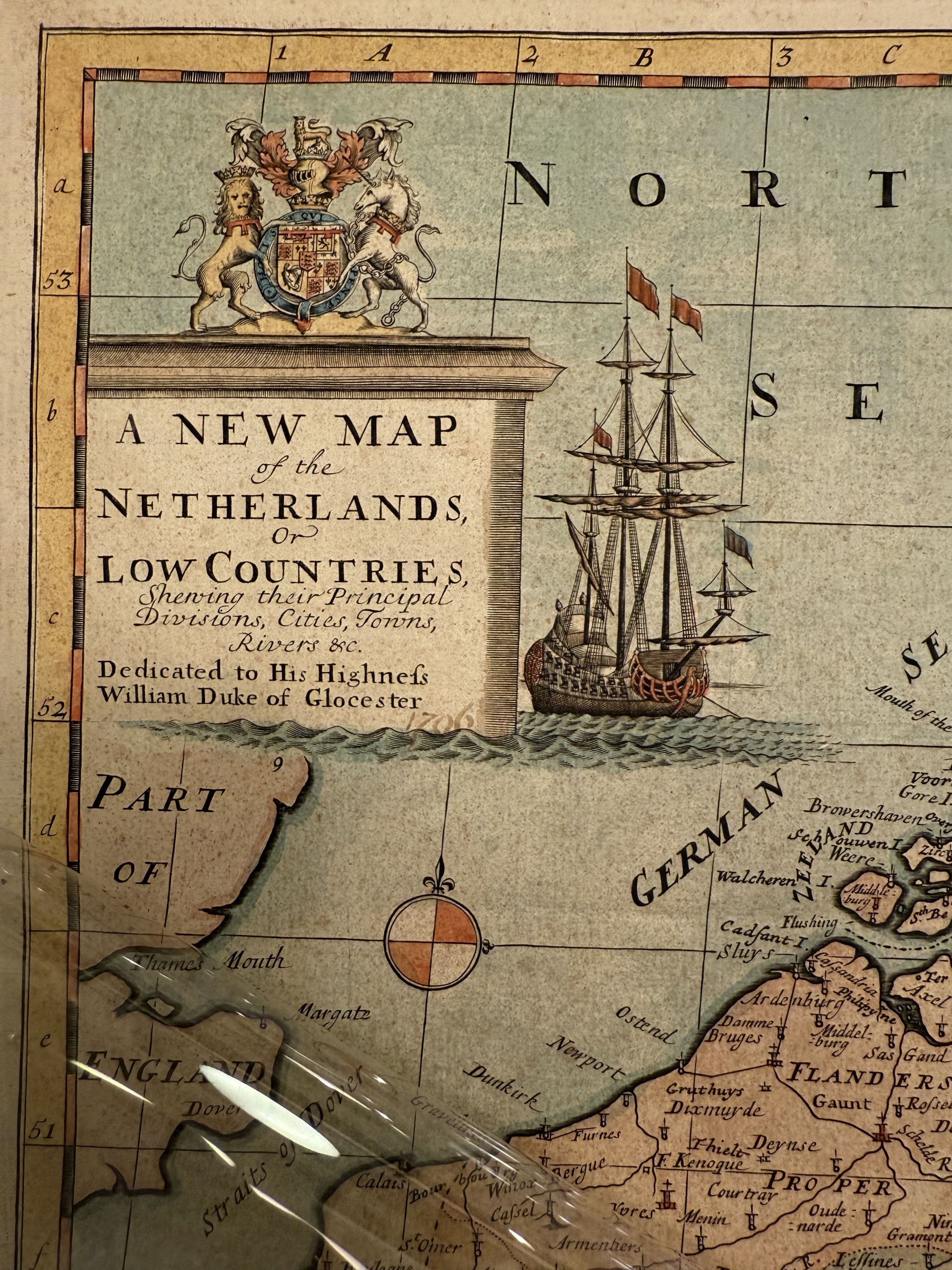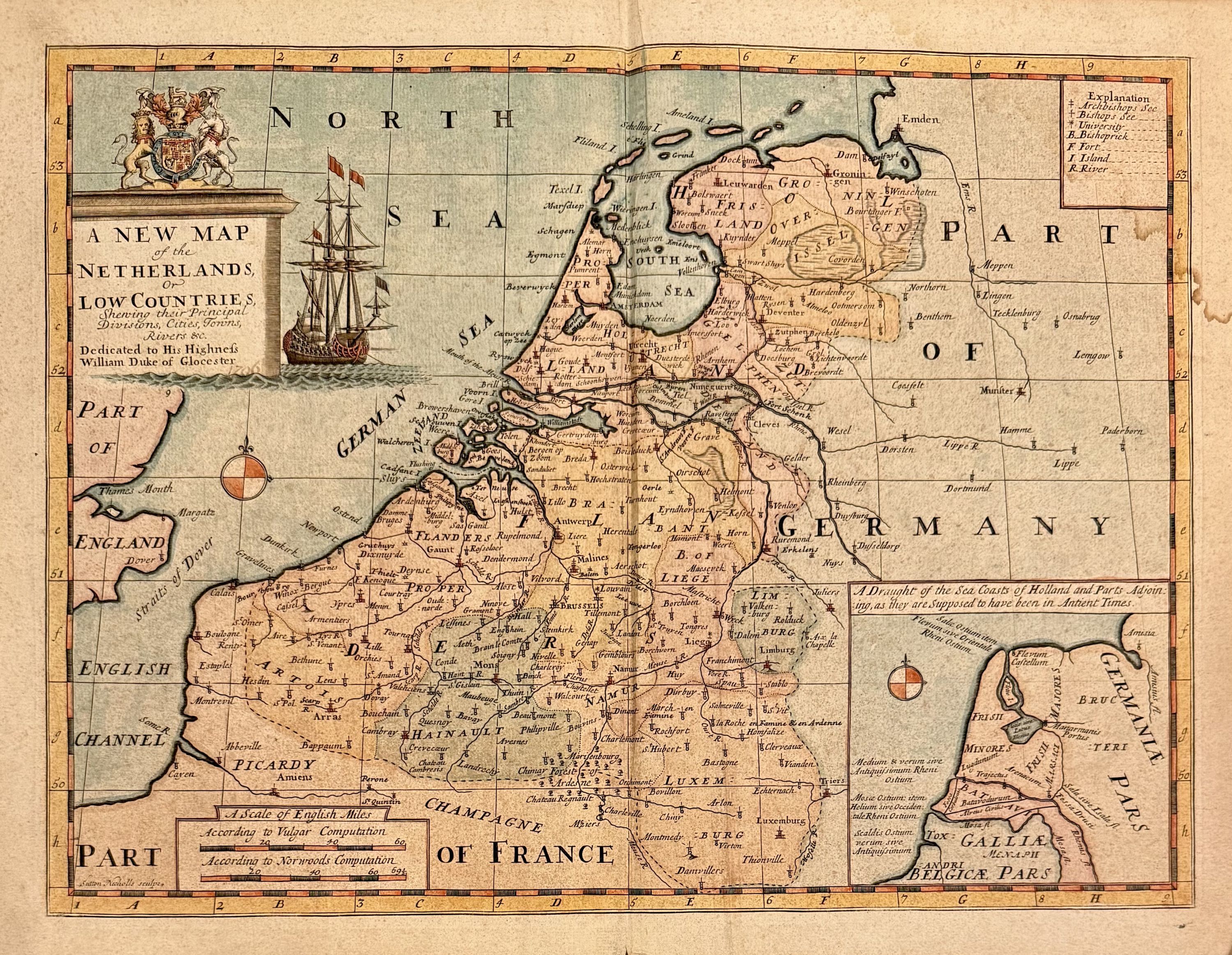 Simplified early 18th c map of the Low Countries and including Netherlands, Belgium and Luxembourg, created by Edward Wells.