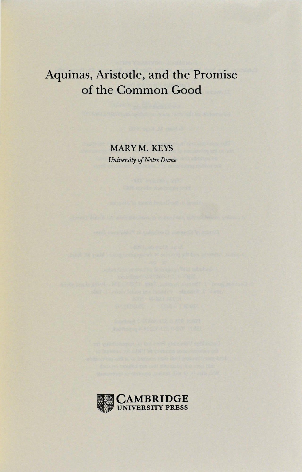 Cambridge: Cambridge University Press, 2006. Hard Cover. Near Fine binding/Very Good+ dust jacket. 8vo; in blue paper covered boards; xii, 255 pages including the Index; a bit of wear to the jacket otherwise fine.~~from the front flap “Examining the relationship between personal and common goods, and the relation of virtue and law to both, Mary M. Keys show why Aquinas should be read in addition to Aristotle on these perennial questions.”. Near Fine binding / Very Good+ dust jacket.