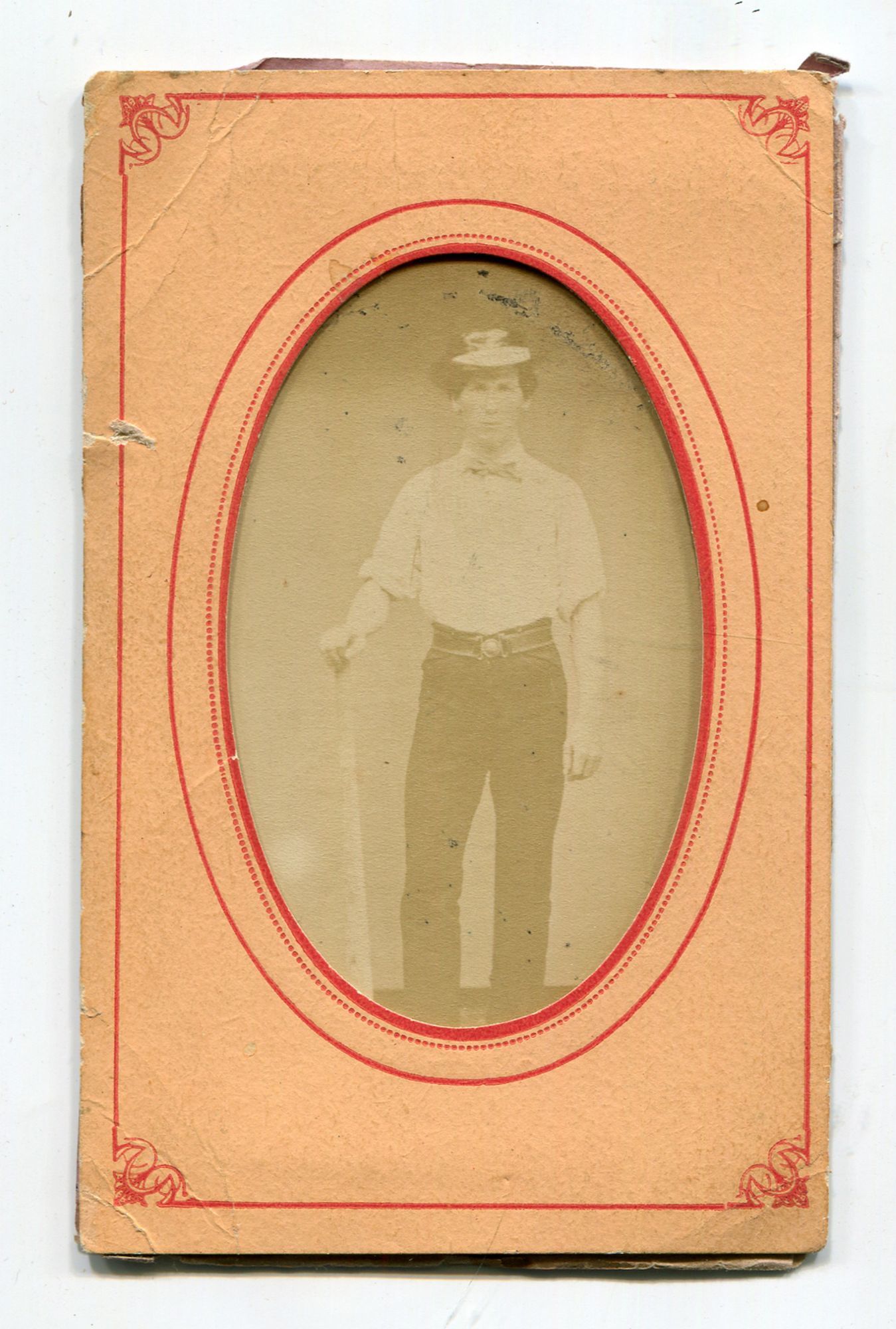 [No place: no photographer, 1866. Softcover. Near Fine. Albumen carte-de-visite photographic portrait of a baseball player. Image approximately 2.5" x 3.75" mounted on a slightly larger card, and housed in a contemporary printed orange and purple paper sleeve mount. No other identification. Slight offsetting from the sleeve else near fine. Full length standing image of a baseball player, nicely uniformed with decorative cap with a cartouche and belt, and holding a bat. Equipment indicates a date between 1866 and 1868.