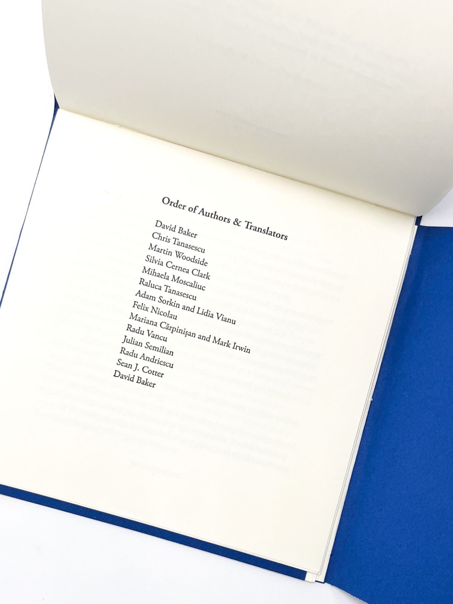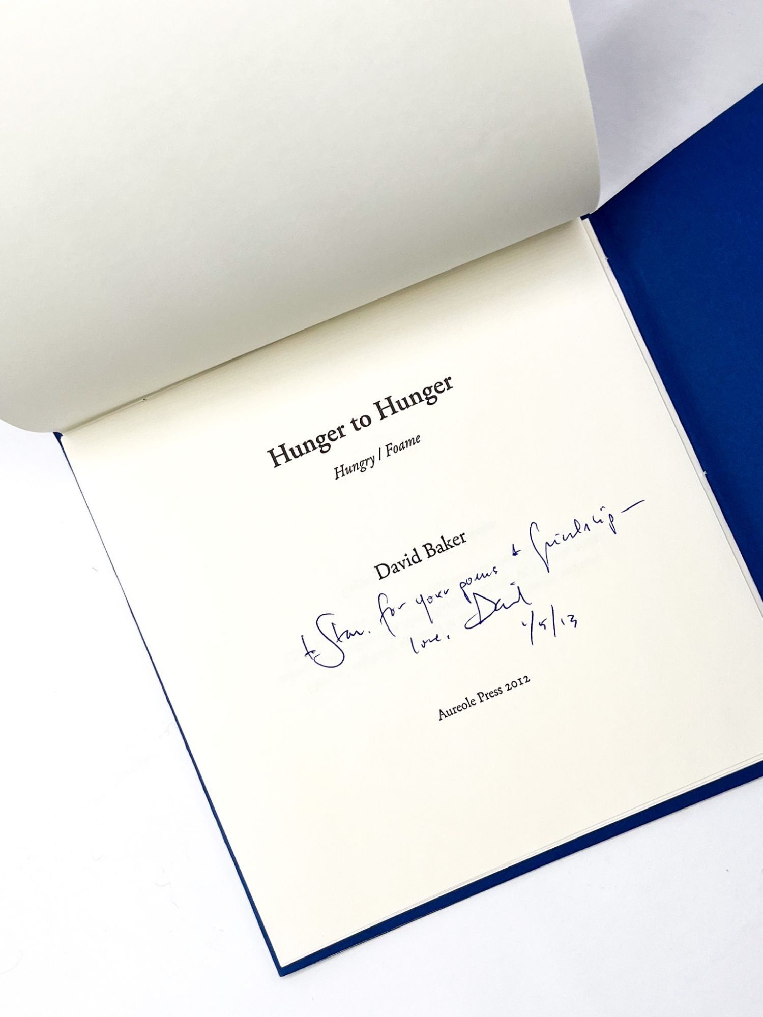 [Toledo, OH]: Aureole Press, 2012. First printing. Fine.. Inscribed limited first edition poetry chapbook, translating Baker's poem "Hunger" from English to Romanian and back in an evolving series, from the library of American poet Stanley Plumly. Translators of Baker's original poem include: Radu Andriescu, Silvia Cernea Clark, Sean Cotter, Mark Irwin, Mihaela Moscalluc, Felix Nicolau, Julian Semilian, Adam J. Sorkin, Chris Tanasescu, Raluca Tanasescu, Radu Vancu, and Martin Woodside. 7'' x 7''. Original multi-signature trifold design in blue cardstock sewn wrappers. Edition of 75 copies; this copy no. 67. Inscribed by Baker to Plumly on title page: "to Stan, for your poems & friendship - / love, David / 1/15/13." Minimal edgewear.