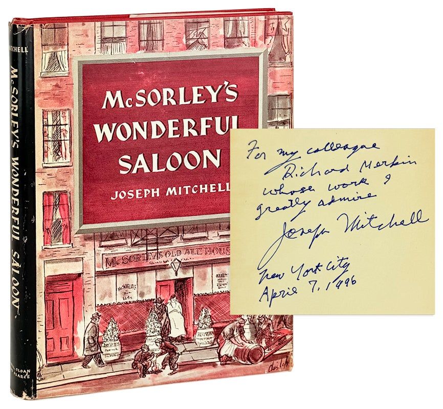 New York: Duell, Sloan and Pearce, 1943. Very Good/Very Good. New York: Duell, Sloan and Pearce, 1943. First Edition with "I" to copyright page. Signed by Joseph Mitchell with inscription to professional dandy and New Yorker illustrator Richard Merkin with inscription, "To my colleague Richard Merkin whose work I greatly admire. Joseph Mitchell New York City April 7, 1996." Octavo. 253 pages. Illustrated dust jacket with $2.50 price present. Red boards with spine lettered in black. A few chips and tears to edges of jacket, slightly heavier wear and adjacent creasing to crown; rubbing to rear panel. Boards show mild shelfwear; spine ends nudged. Binding sound and pages unmarked; Very Good. Uncommon signed and here with a wonderful association between the two New Yorker stalwarts.