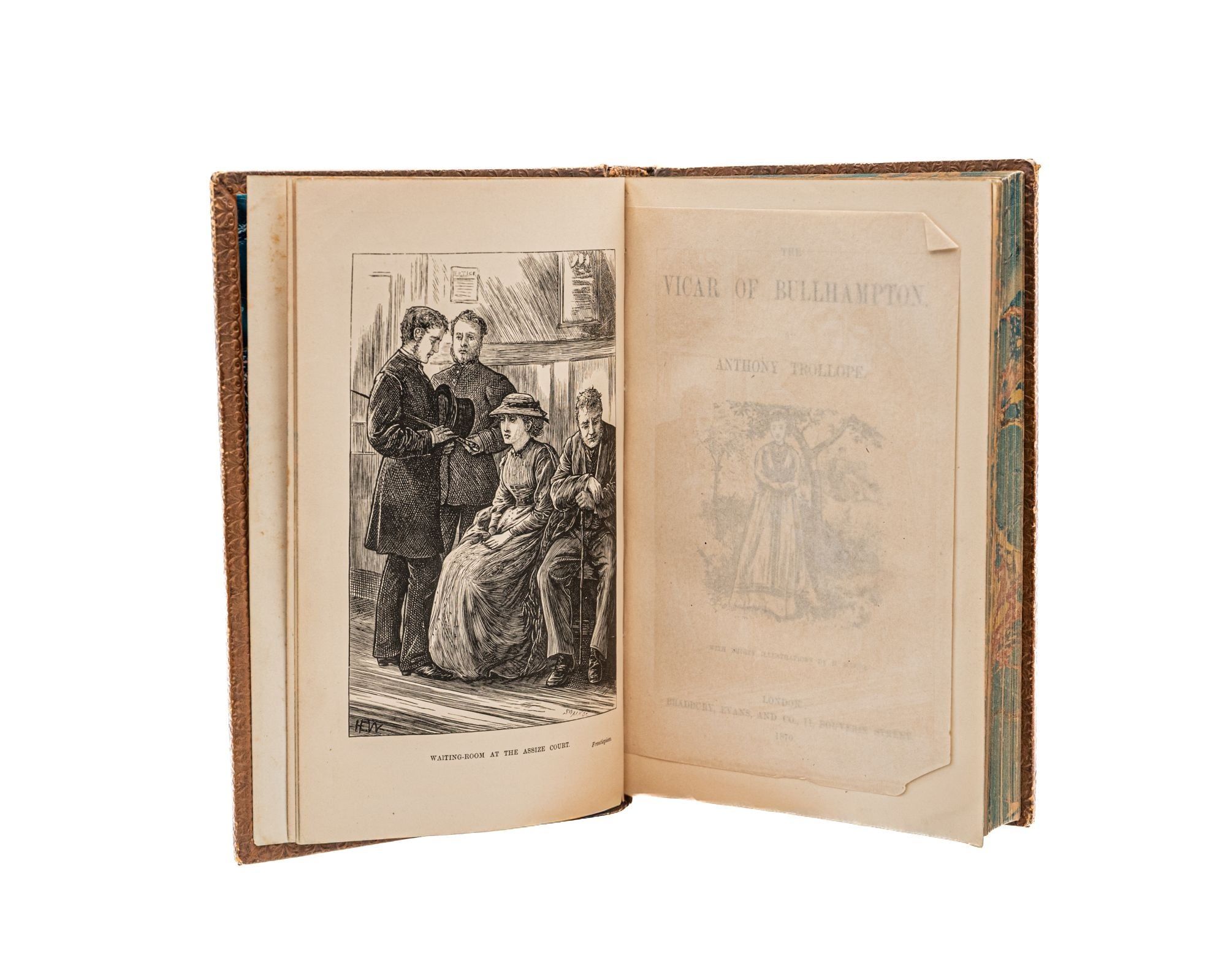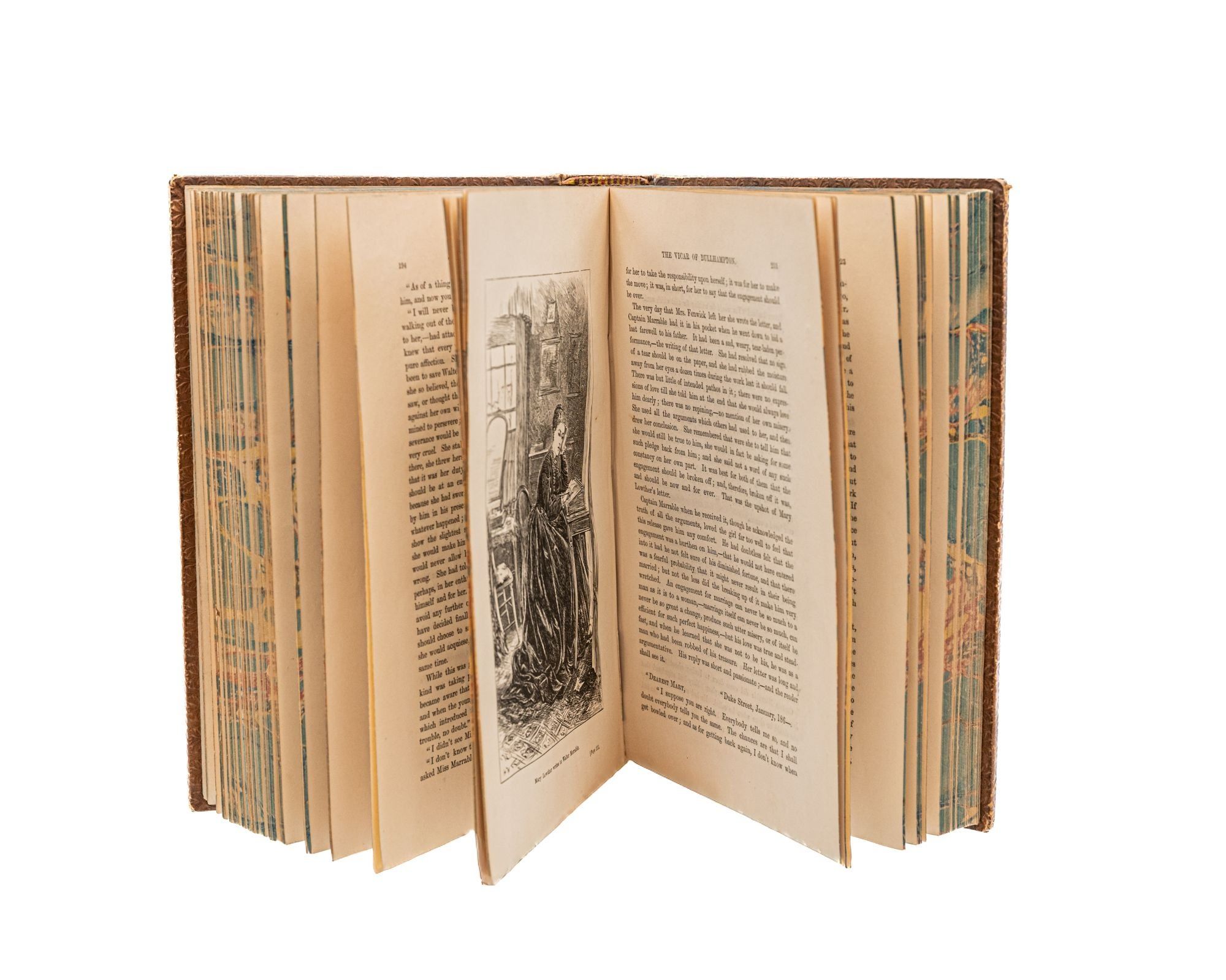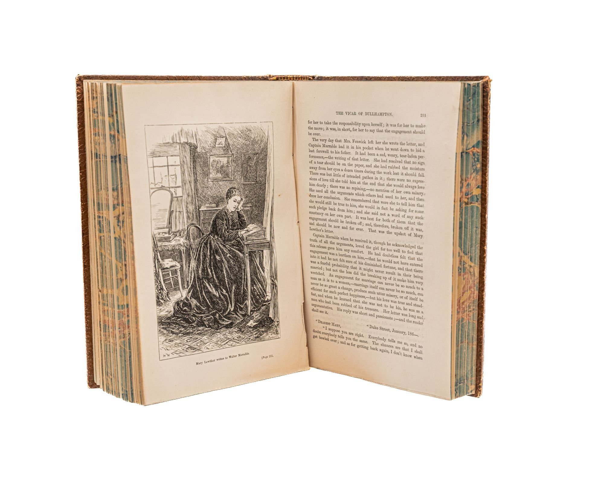 London: Bradbury, Evans, and Co, 1870. Hardcover. Very Good. Hardcover. First edition in book form. Anthony Trollope (1815-1882) was a highly successful and prolific English novelist of the Victorian era, known for his 47 novels and other works. He is particularly celebrated for his Barsetshire novels and Palliser novels, which explore themes of Victorian society, politics, and social structures. This novel originally appeared in eleven monthly parts published from July 1869-May 1970. The title page states that the book has thirty illustrations by H. Woods, but according to the Sadleir bibliography (listing #33) there were actually 35 illustrations. Twelve are vignettes and twenty-three are full-page plates. Bound in a handsome full brown leather binding with gilt rulings to the covers and five gilt decorated bands to the spine with a black leather title label. The leather is rubbed along the edges of the cover and along the spine edges. Page edges and endpapers have a blue marbled design. Light foxing to front and rear endpapers. Gutters are cracked where book was opened flat but text block is firm. About very good condition. Measures 5.5 x 8.5 inches. ix + 481 pages. LIT/080725.