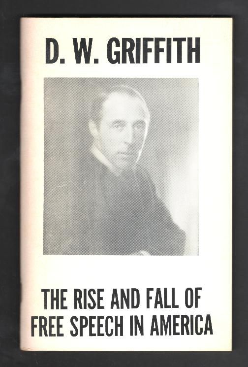 Hollywood: Larry Edmunds Book Shop. Near Fine. (c.1967). Reprint. Stapled wraps. [nice clean copy with faint handling wear only]. (Cinema Classics, No. 1) Series (cartoon illustrations) Reprint of Griffith's famous manifesto, originally published in 1916, when he was still in a high dudgeon over the various protests and censorship actions that had been taken against his film THE BIRTH OF A NATION. In it, he decries "Intolerance" as the Root of All Censorship, "a real national peril, because the day may not be far off when censors, under the shadow of the American flag of independence, will be empowered by legislative enactment to foist their individual whims, hobbies, or prejudices on the suffering public." (It's worth noting that Griffith didn't devote a single word of his screed to his upcoming super-epic, coincidentally (not) entitled INTOLERANCE -- yet when the publication originally appeared in April 1916, the film was actually mid-production. Looked at from that angle, it's hard to escape the suspicion that plastering "Intolerance" in ALL CAPS at the top of almost every other page was, whatever else it might have been, a not-very-subtle bit of pre-release publicity.) .