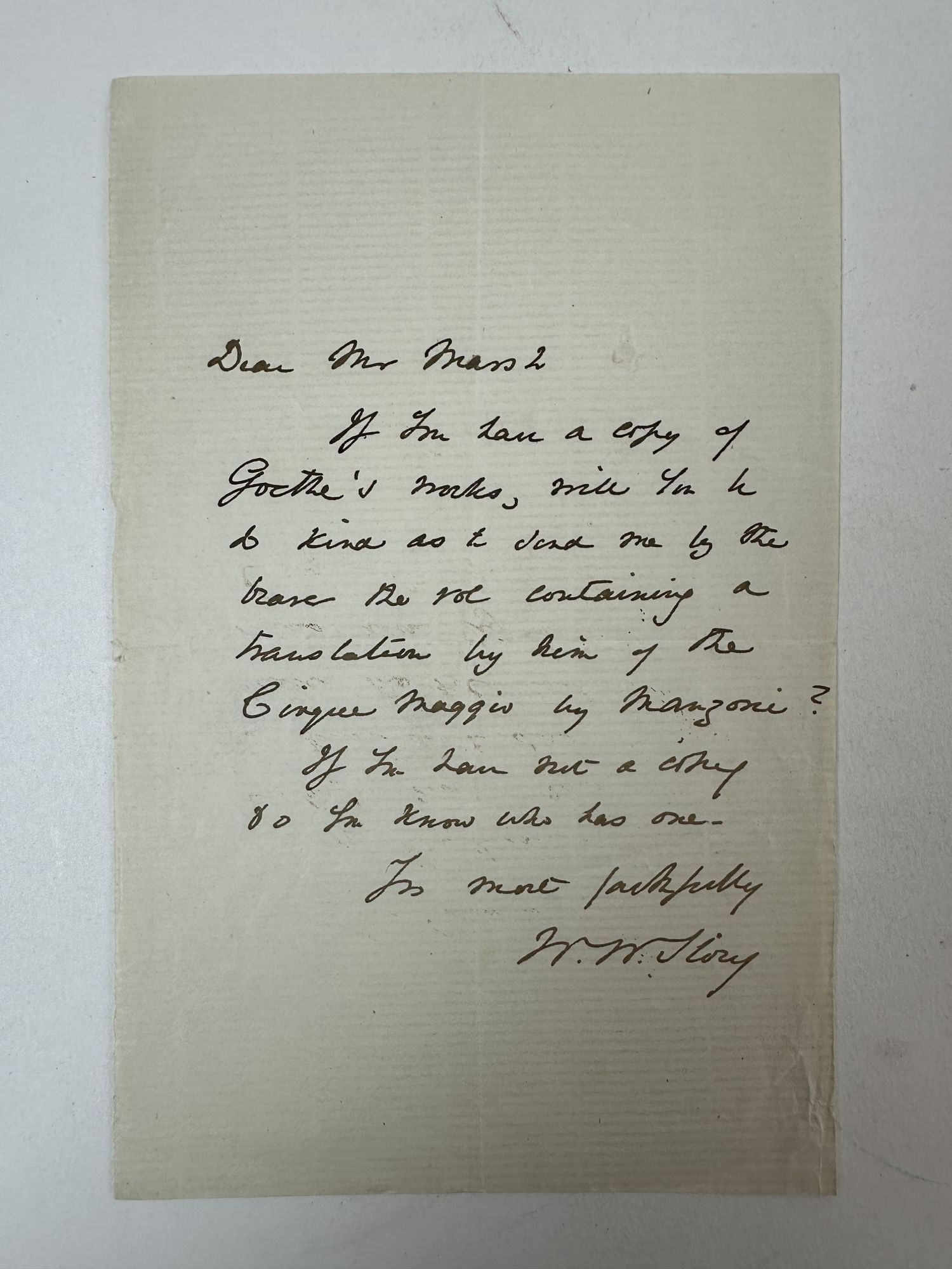 Story’s inquiry in the present letter shows both his engagement with Goethe and Manzoni (both central literary figures for European Romanticism) and his reliance on Marsh’s well-known private library. It also places the letter within the intellectual circle of American expatriates in Florence, who often used each other’s collections for reference and translation work. 1402267. Special Collections.