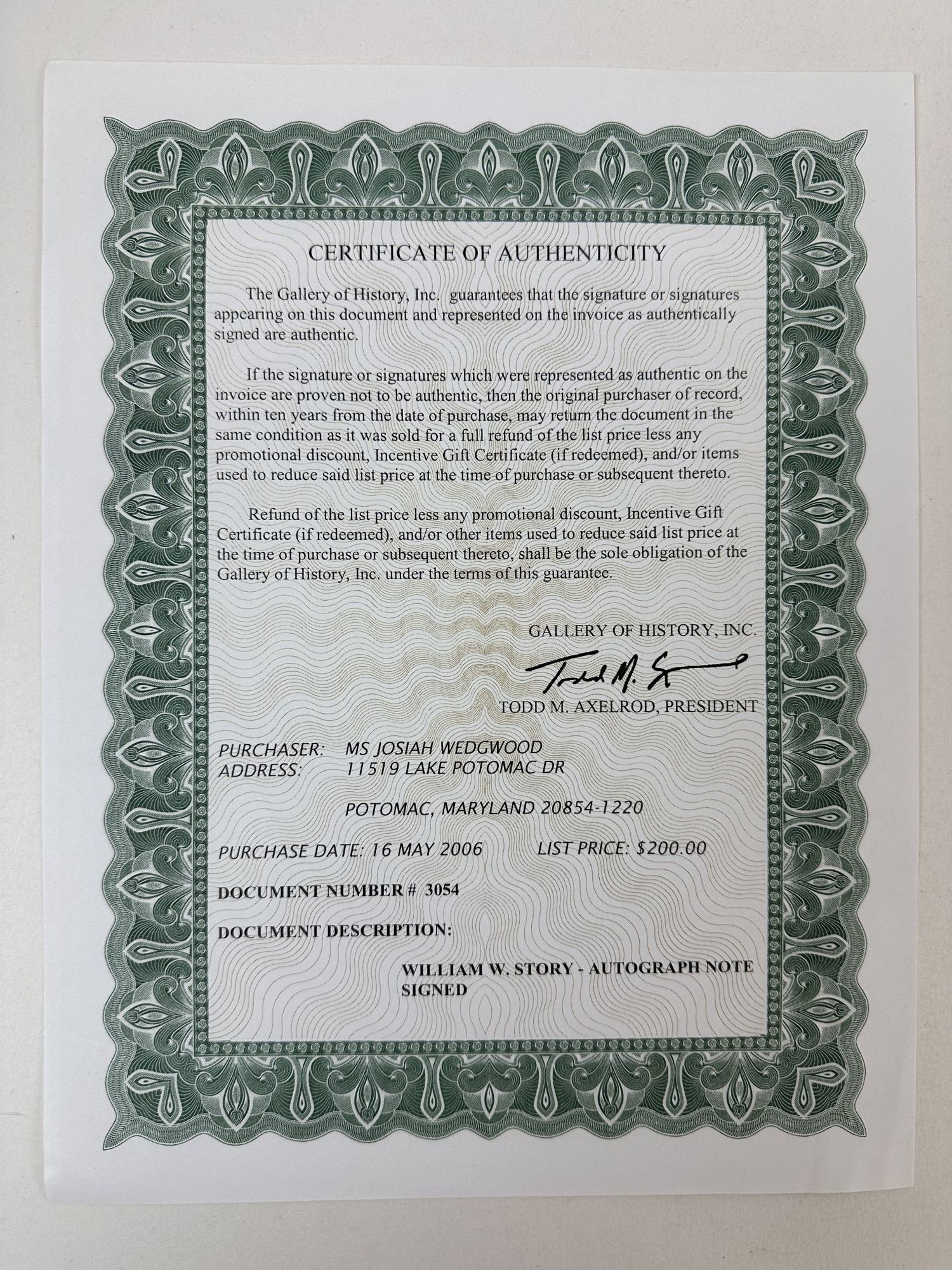 c. 1870. One-page ALS to a Mr. Mass attempting to procure a specific literary resource: "If you have a copy of Goethe’s works, will you be so kind as to send me by the bearer the volume containing a translation by him of the ‘Cinque Maggio’ by Manzoni?" Signed by Story in black ink. In Very Good condition with mild age-toning, light crease folds, and minor wear along the edges and corners. Measures 5.25" x 8.25". Accompanied by Certificate of Authenticity. RW Consignment. Shelved at Rockville, Room A, General Ephemera Part 2. William Wetmore (February 12, 1819 – October 7, 1895) Story was the son of Associate Justice Joseph Story of the U.S. Supreme Court. He earned his undergraduate degree from Harvard in 1838 and two years later received a law degree. Story practiced law for about five years and was the author of several legal textbooks, also writing poetry and a biography of his father. Although art was a hobby, he never received formal art instruction. Nonetheless, Story was commissioned to design a memorial statue of his father after his death in 1846. To prepare himself for this project, Story went to Italy to study sculpture.