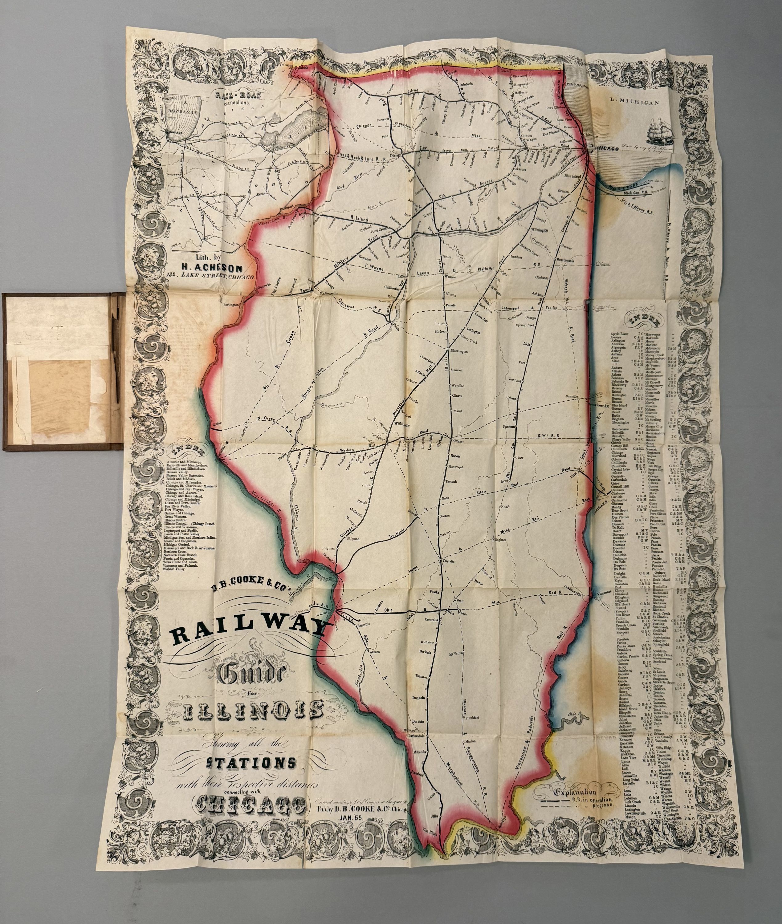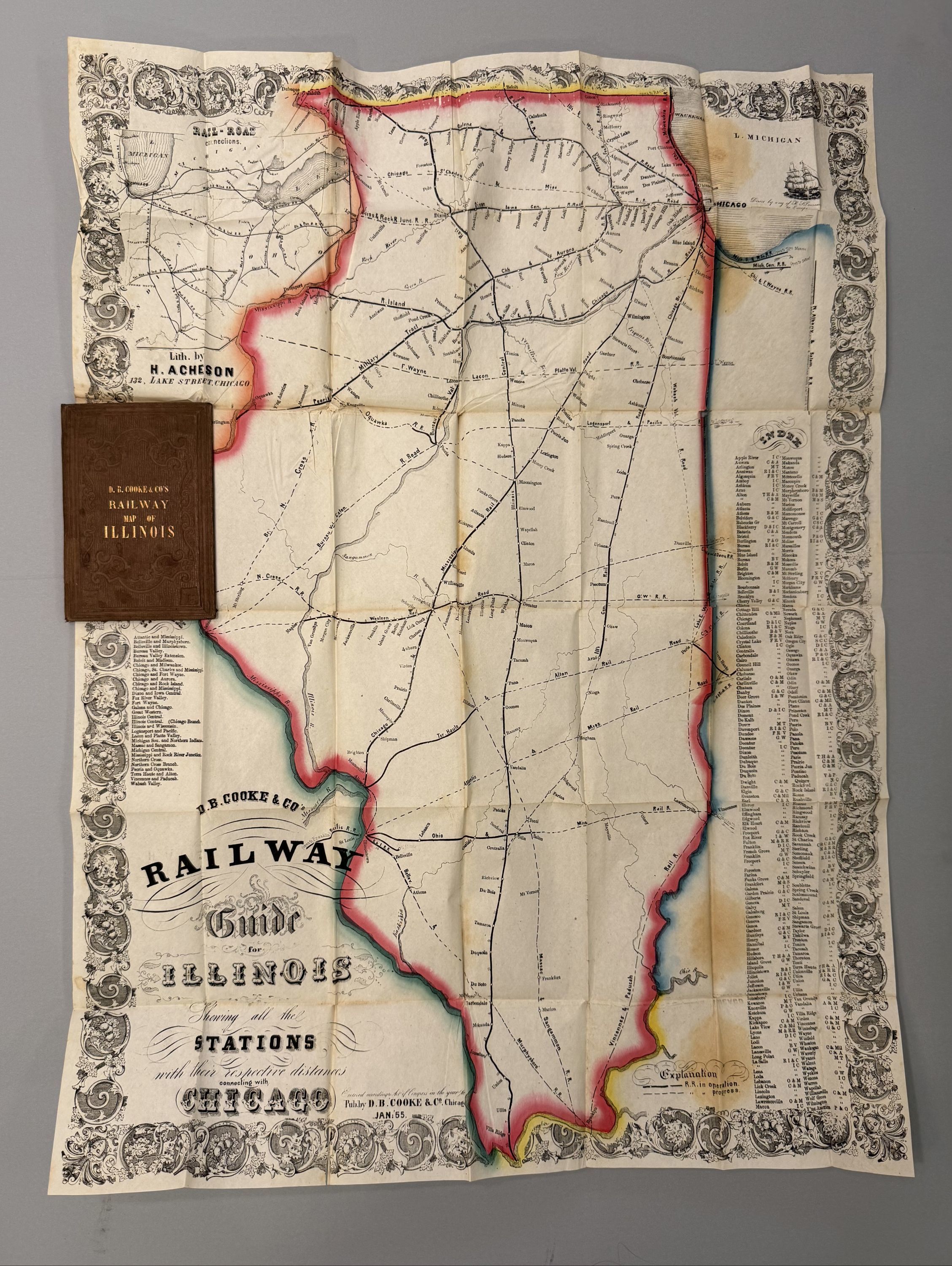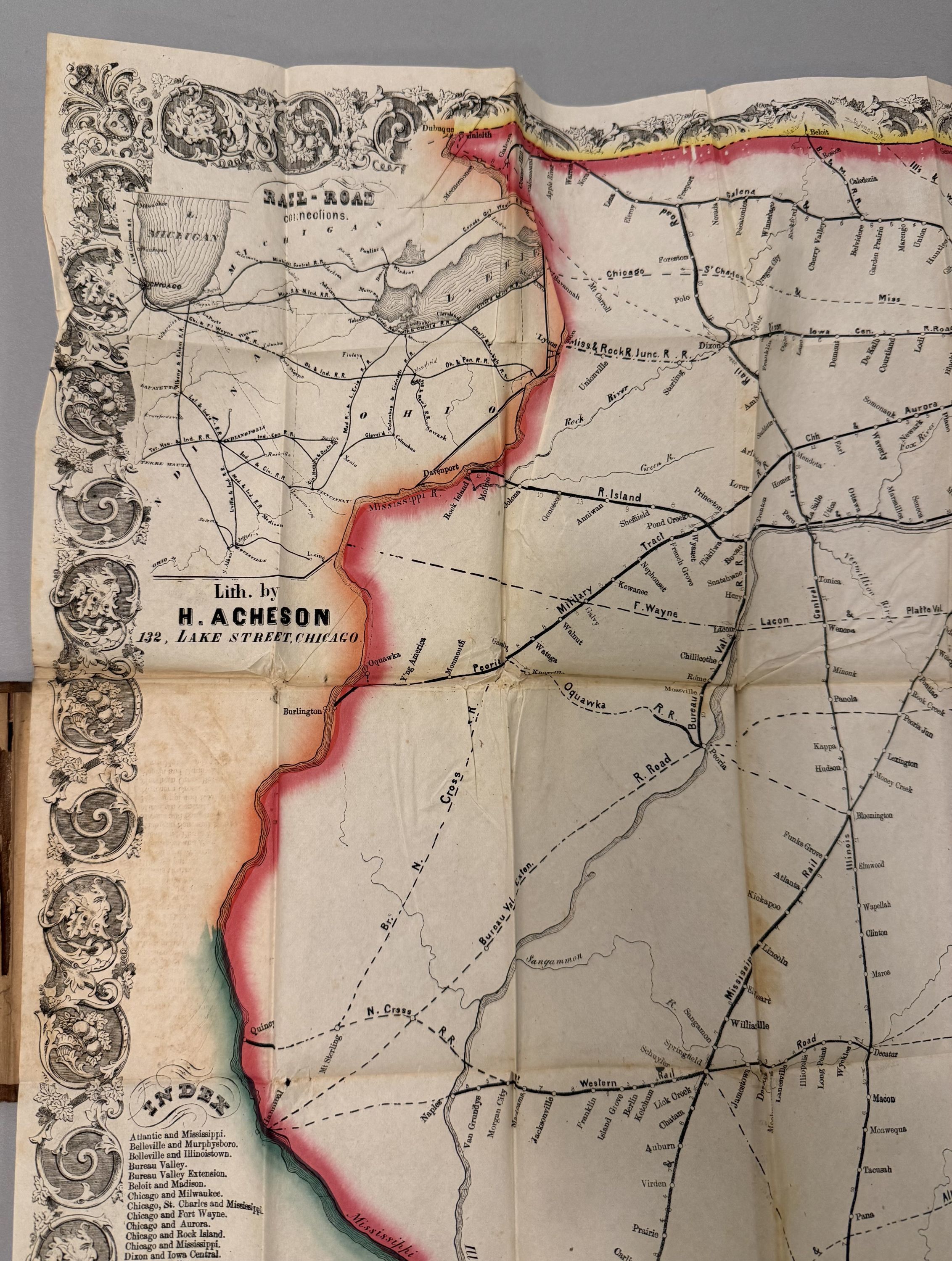 Chicago: D. B. Cooke, 1855. Map. Hand painted lithograph. 27 3/4 x 21", stains and some creases, otherwise in very good condition. Folding into publisher's 12mo format gilt and blind stamped brown cloth case. Chicago: H. Acheson, 1855.
