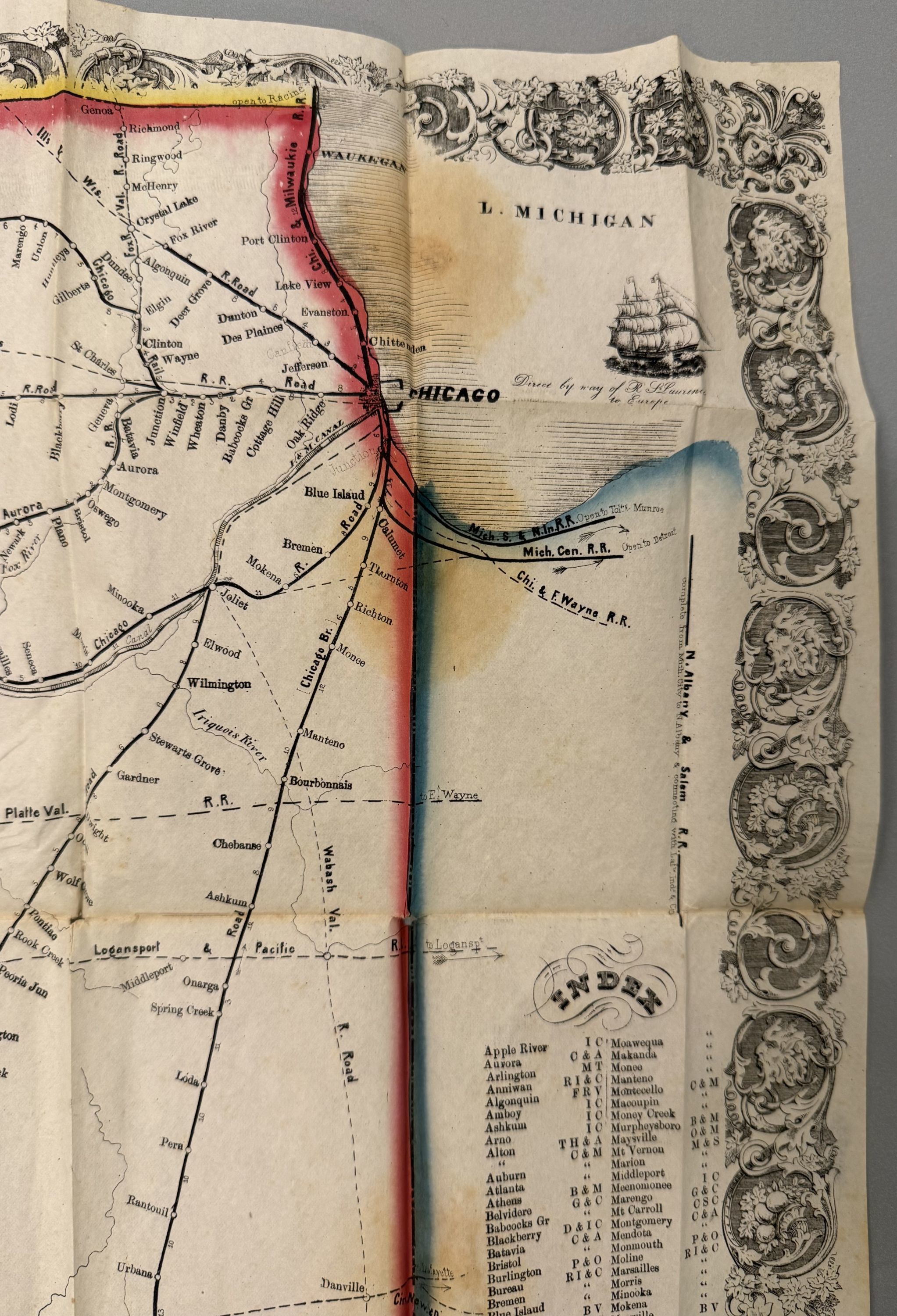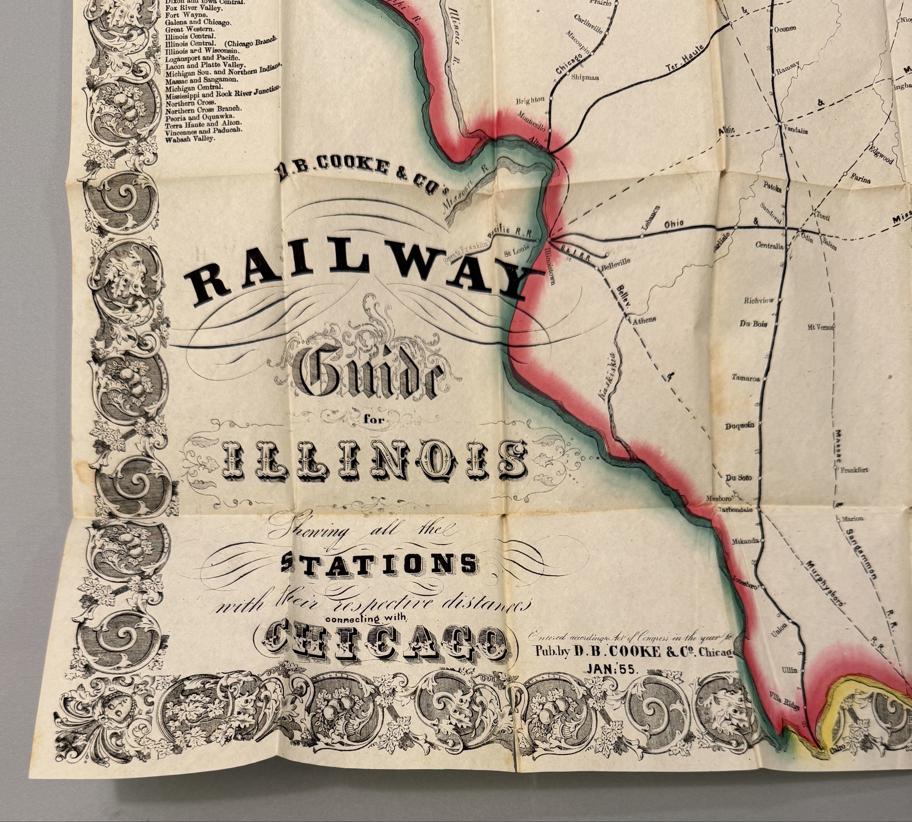 Large pocket map of Illinois showing Railroad lines in operation and those in progress. A corresponding steam engine index and table included with towns and railroads listed. Floating steam locomotive trains complete the fabulous design. David B. Cooke & Company began in Chicago with a store containing school, law, and medical books and stationery as well as maps. This map is a good example of his work