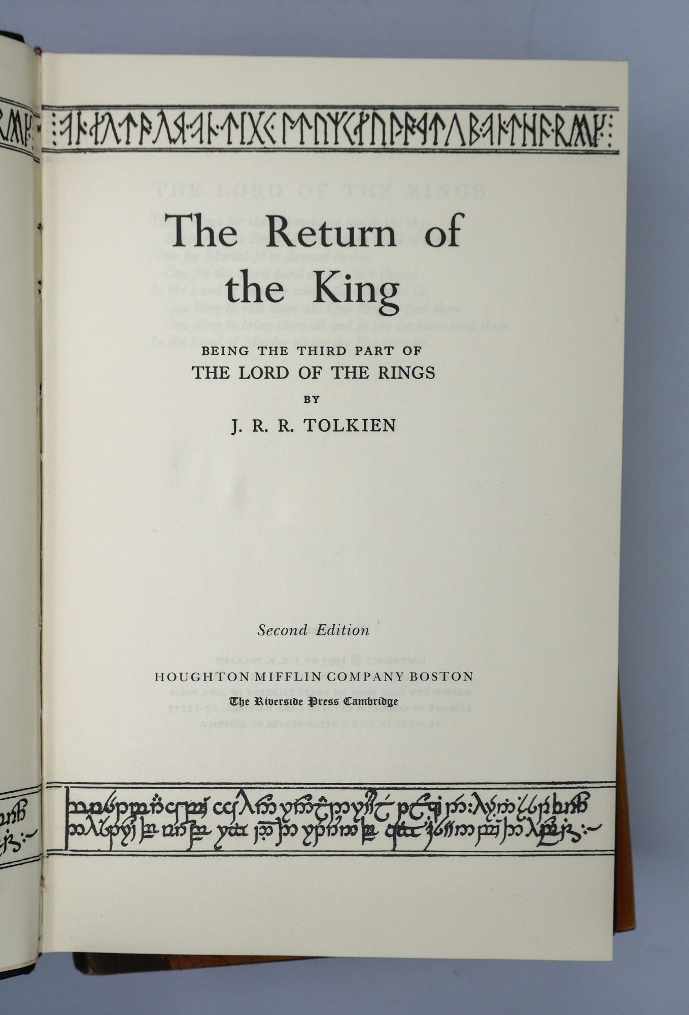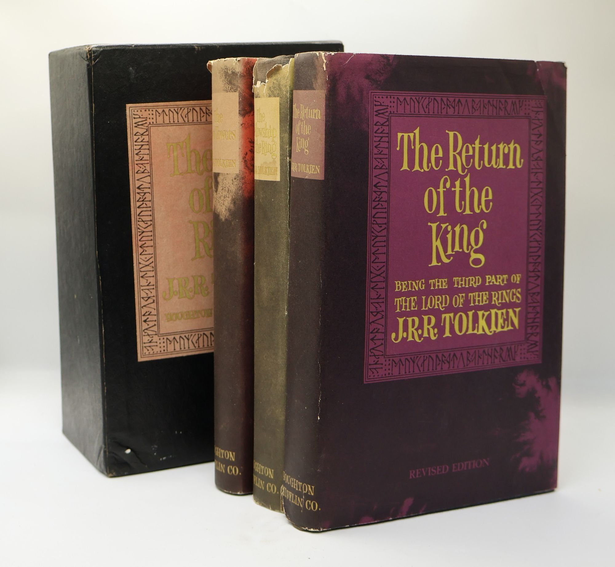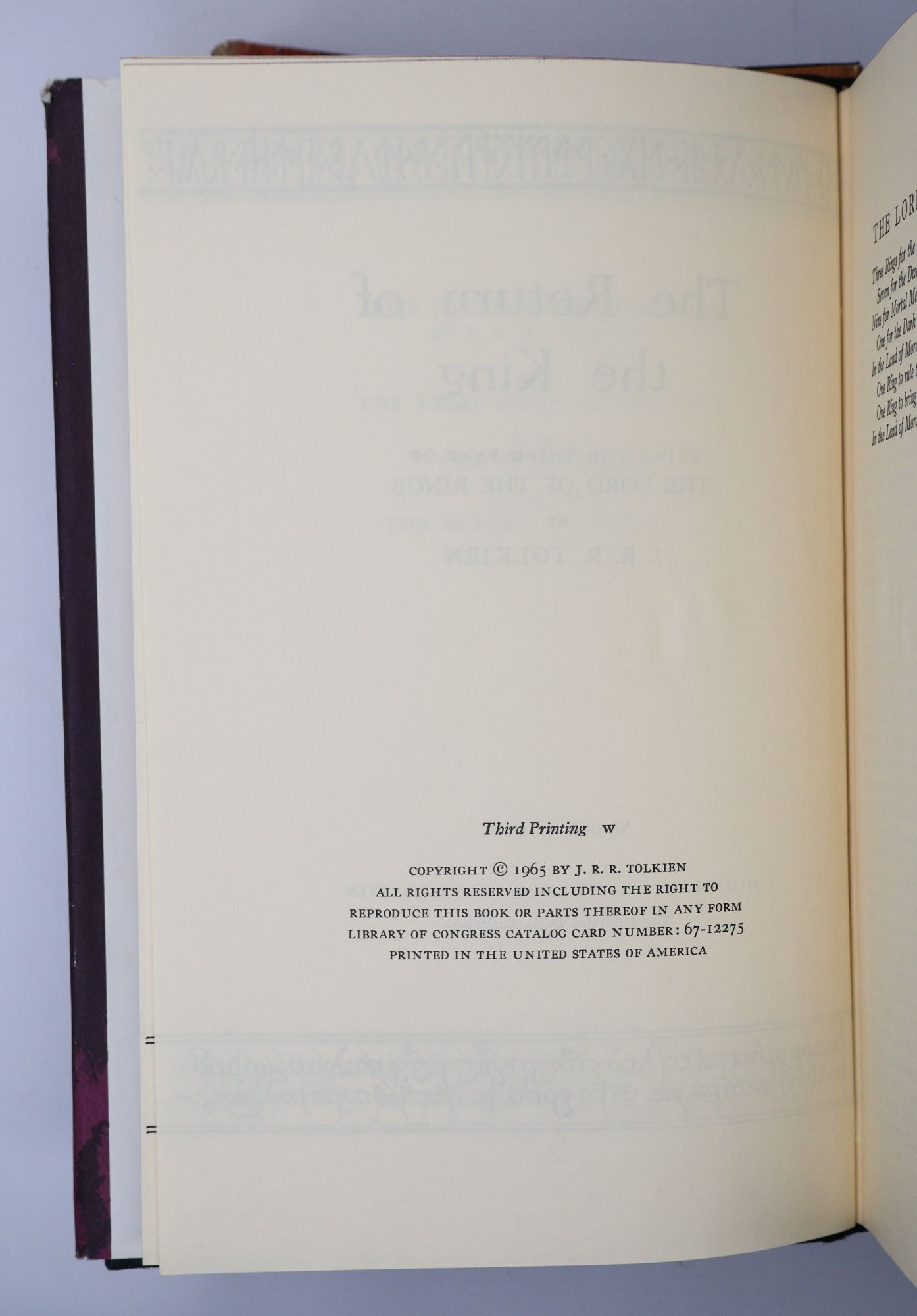 “The Fellowship of the Ring” states fourth printing. “The Two Towers” and “The Return of the King” state third printings. All dust jackets have a price of “$6.50”. 1402299. Shelved Dupont Bookstore.