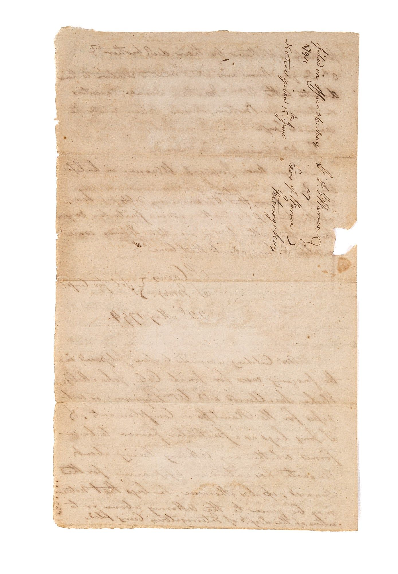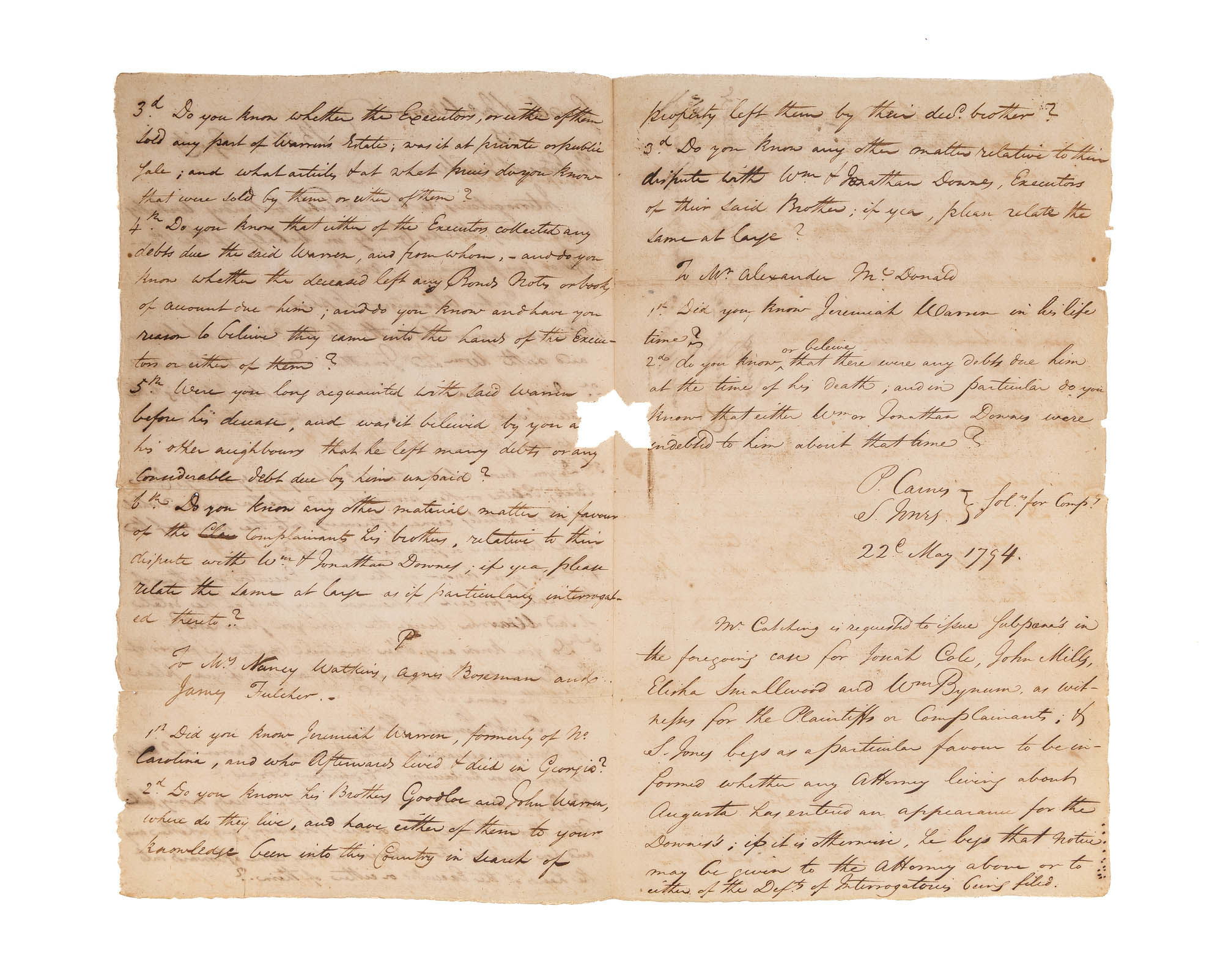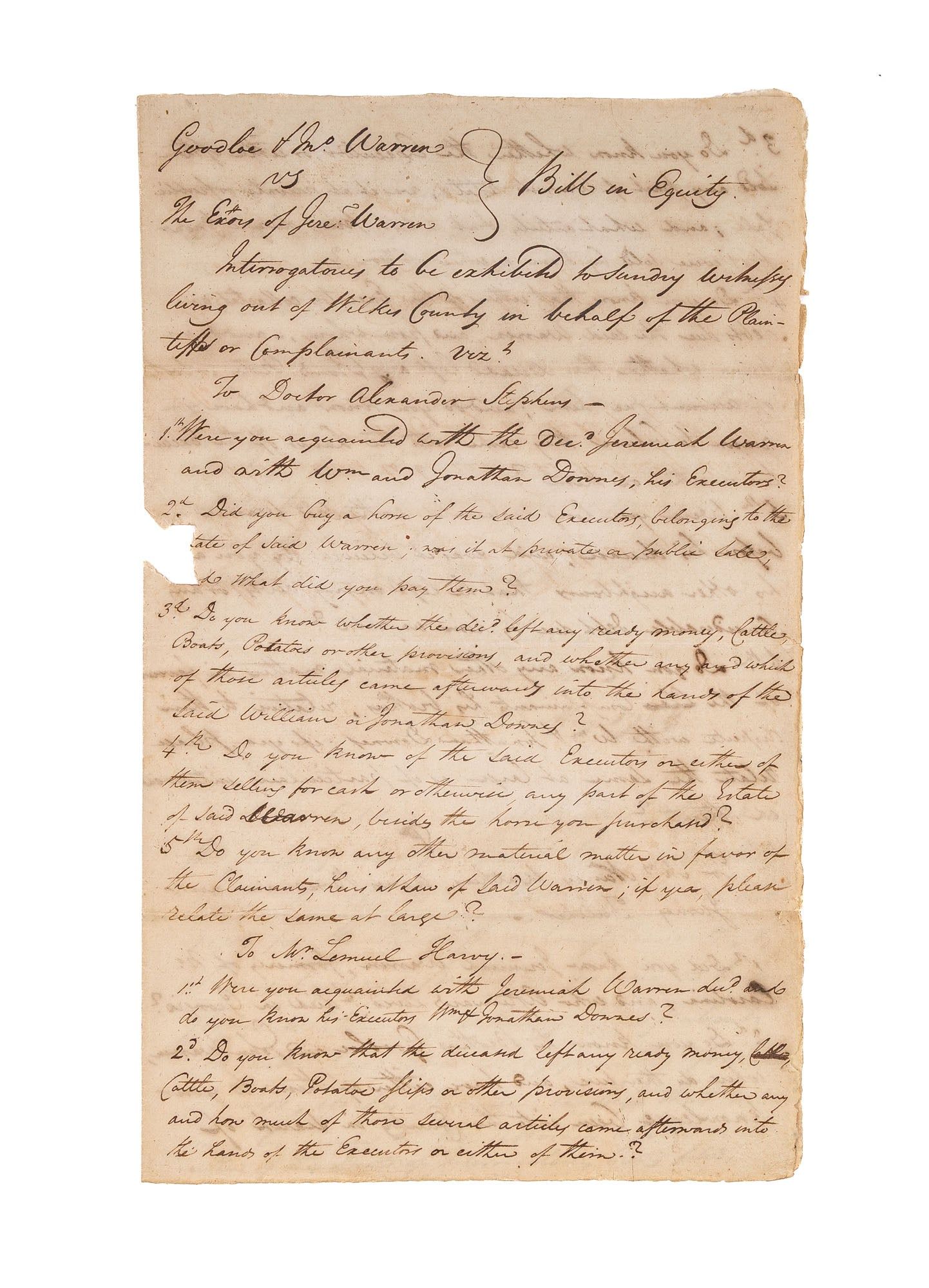 1794. Interrogating Witnesses to a Disputed Estate [Manuscript]. [North Carolina]. Goodloe & Jno. Warren vs The Executors of Jere: Warren } Bill in Equity. Interrogatories to be Exhibited to Sundry Witnesses Living Out of Wilkes County in Behalf of the Plaintiffs or Complainants. [Chatham County, GA?], May 22, 1794. 3 pp. 12-1/4" x 7-1/2" (31.5 x 19 cm) bifolium, manuscript text in single neat hand, docket to verso. Moderate toning, horizontal fold lines from filing, tear to left edge with minor loss to text. $450. * This document deals with a complaint brought by Goodloe and John Warren against William and Jonathan Downes, the executors of Jeremiah Warren's estate. Goodloe [1738-1835] and John [c.1742-c.1813] were Jeremiah's brothers and alleged that the estate had been mismanaged, with items that rightfully belonged to them either kept by the executors or sold to others. Our document lists witnesses to be interrogated by the Warrens' attorneys, Peter Carnes [1749-1794] and Seaborn Jones [1759-1813], and the questions the attorneys intended to ask. Both men were high-profile Augusta lawyers; Carnes is also remembered as an aviation pioneer for his successful experiments with ballooning. The witnesses were all from Wilkes County, North Carolina, where Warren lived before moving to Georgia where his will was filed in 1788 and where he died. Carnes and Jones planned to ask about purchases made from the executors, whether the witnesses knew about the contents of Warren's will and whether Warren left unpaid debts. For more on the case, see Family Puzzlers Issues 1080-1106, pp. 2-3.