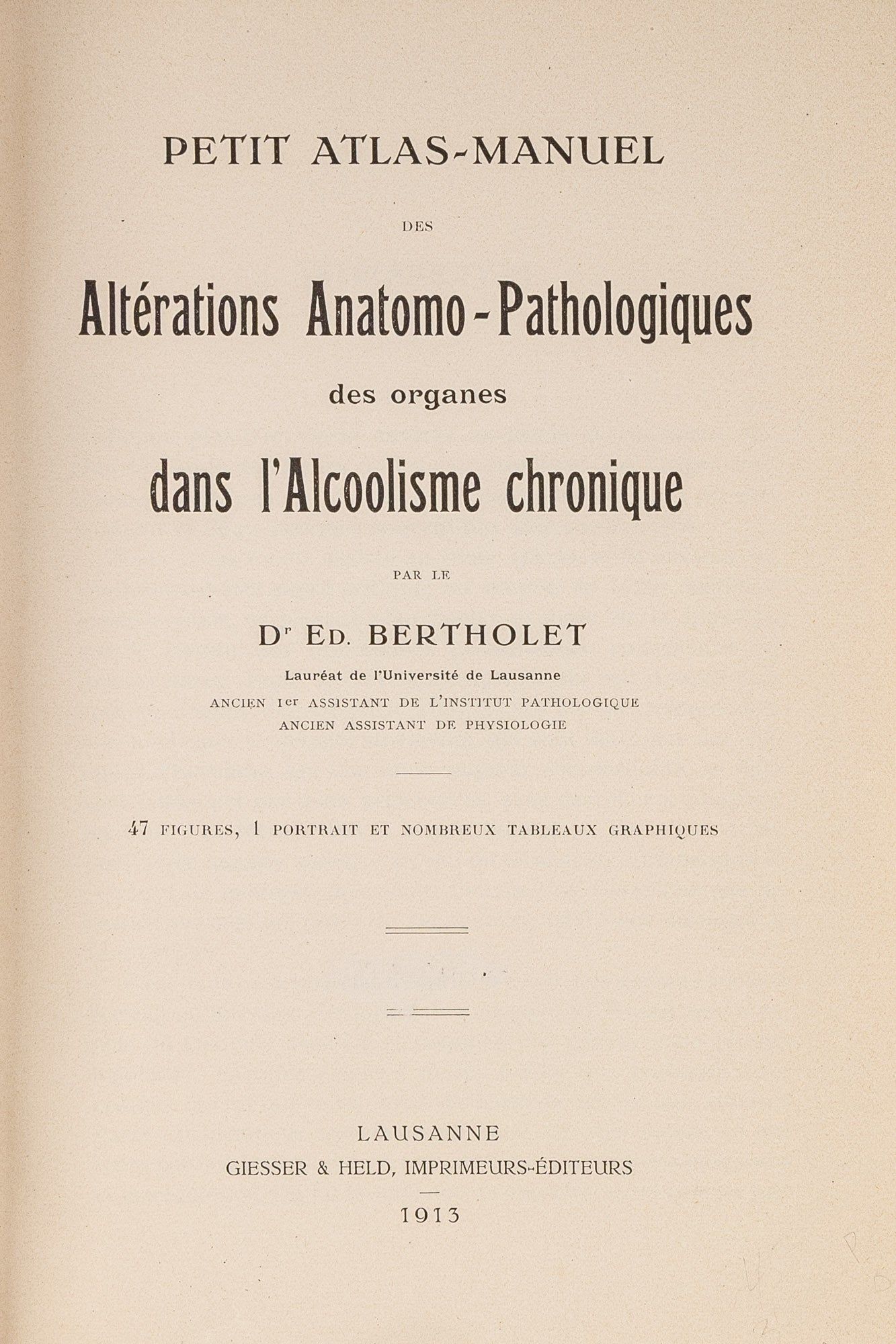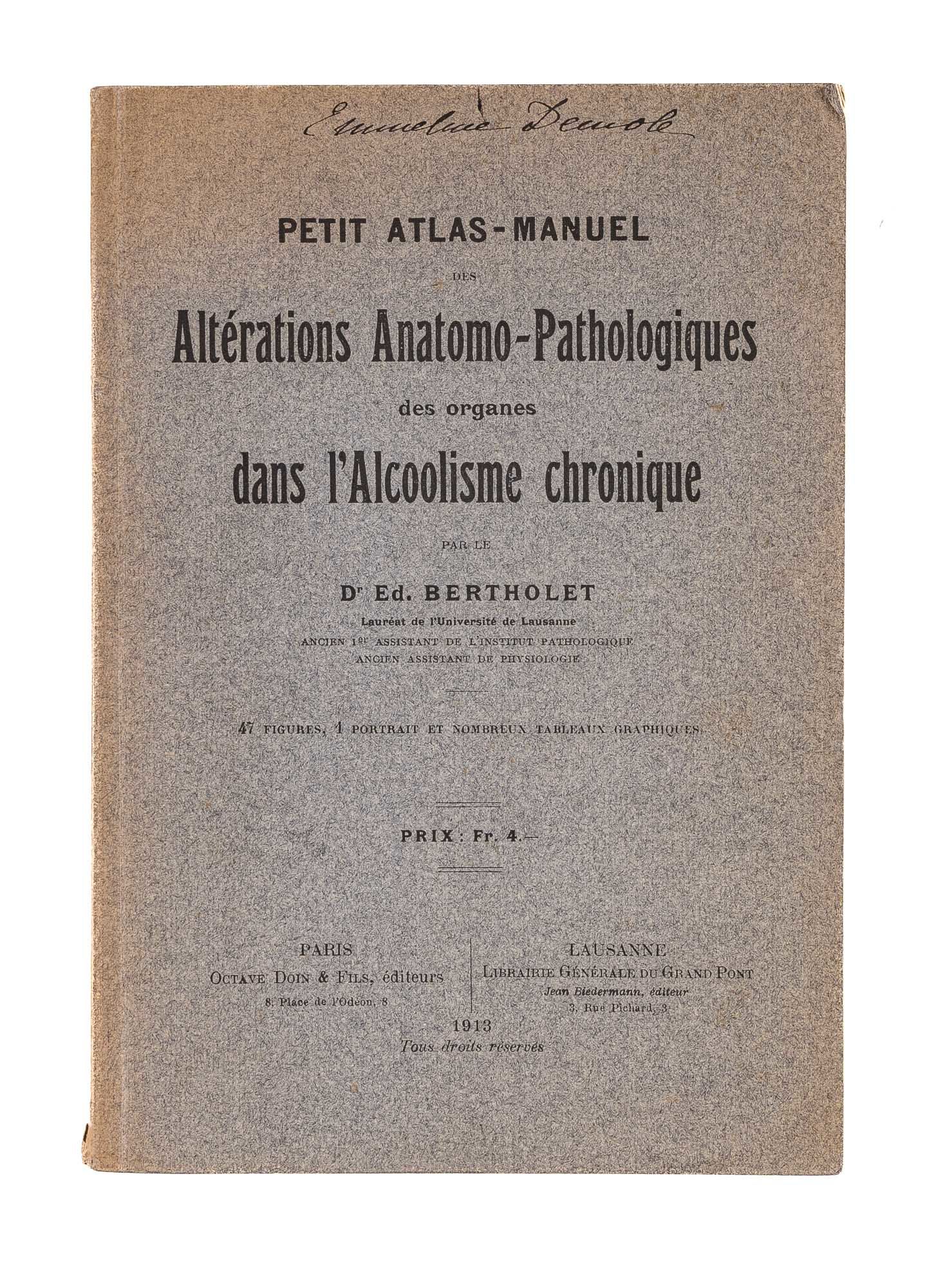 1913. Bertholet, Edouard. Petit Atlas - Manuel des Alte'rations Anatomo-pathologiques des Organes dans L'Alcoolisme Chronique. Lausanne, [Fr.]:Giesser & Held, 1913. 110 pp. Illustrations. Sewn printed wrappers. Moderately worn with some fading to spine and covers. Pen annotations to spine. Previous owner's signature to front cover and front free endpaper, otherwise internally clean. A good copy. $25. * An atlas and manual detailing the anatomical and pathological changes in human organs caused by chronic alcoholism which focused on the physical effects of long-term alcohol abuse on the body's internal systems. It explores the specific pathological alterations that occur in various organs as a result of chronic alcoholism and presents a small atlas and manual, including illustrations to visually document these anatomical changes for medical study and reference. This work serves as a guide for understanding and identifying the physical consequences of alcohol abuse, which was a significant subject of medical and social study in the early 20th century when it was published.