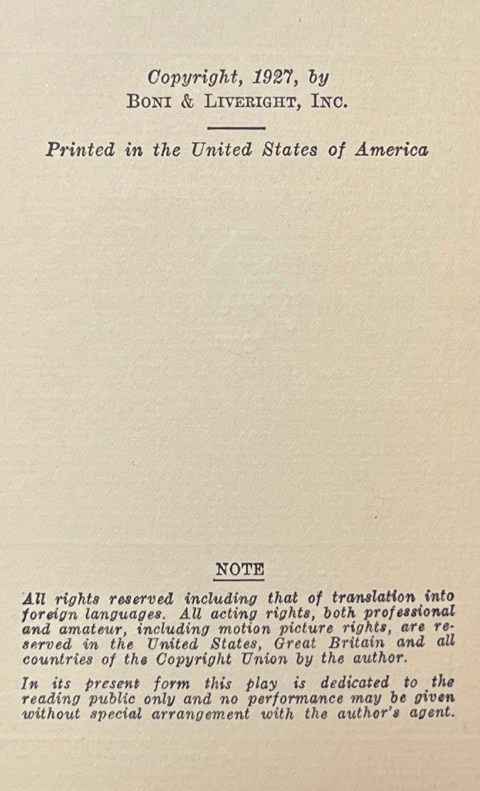New York: Horace Liveright, 1927. First Edition. Hardcover. Very Good/Very Good. Very Good in a Very Good jacket, unclipped ($2.50), generally toned and soiled, some chips at the edges. Blue cloth on the boards, unevenly faded, with gilt lettering and a blue ink wave design. Firmly bound with a slight forward lean and a dark topstain, owner's name on the front endpaper, clean otherwse. Part of the uniform edition of O'Neill's works, the first of his works to be published in book form before the stage premier.