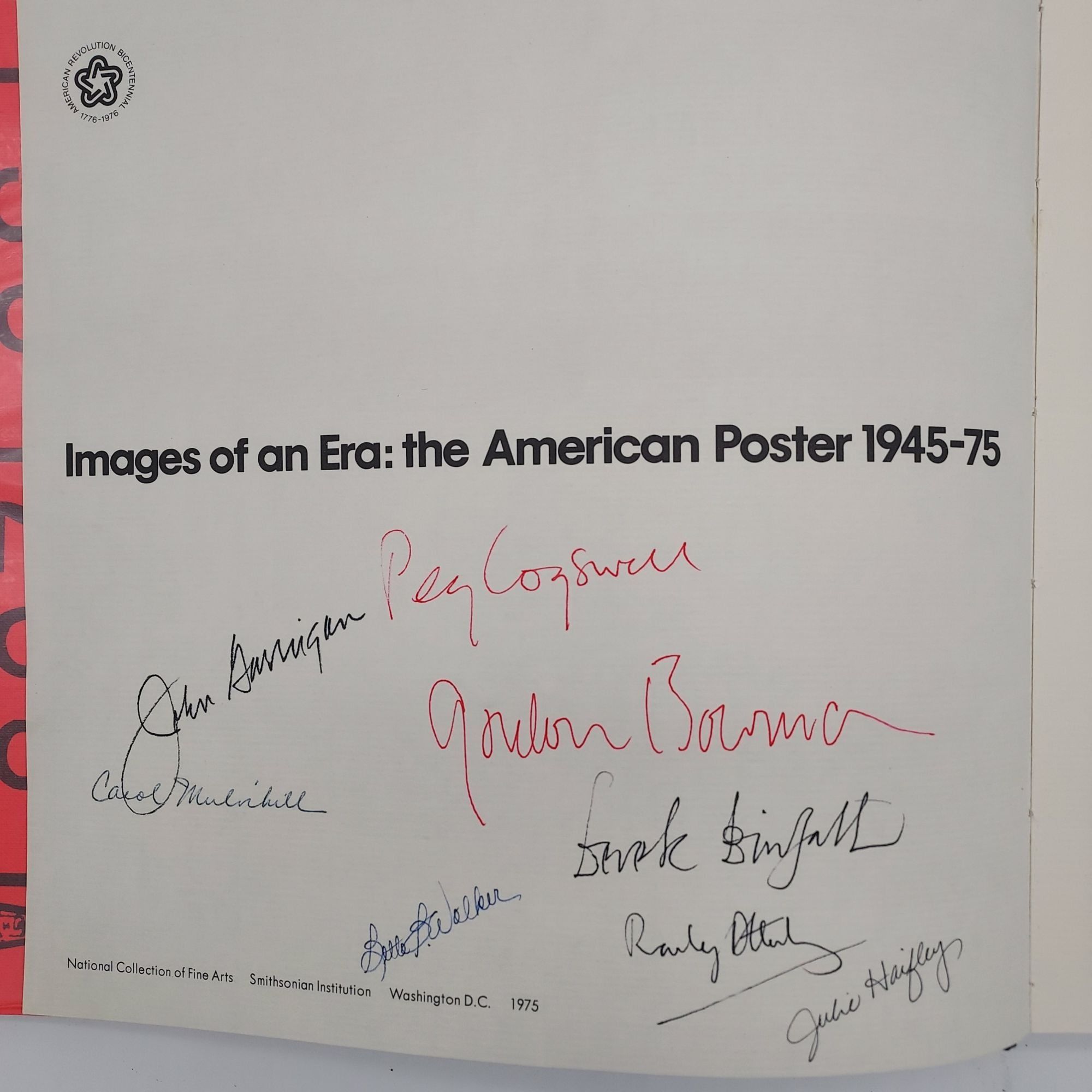 This copy is signed by eight of the organizers, including John Garrigan and Margaret Cogswell, on the title page. Catalog designer Derek Birdsall, researchers Carol Mulvihill and Bette Walker, and Gordon Bowman (Creative Programs, Mobile Oil Corporation) are also included among those who have signed.