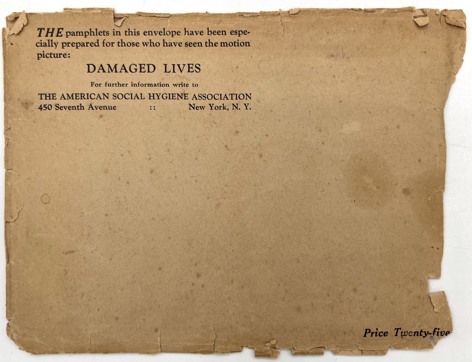 New York, New York: The American Social Hygiene Association, 1937. Very good. Envelope toned and chipped.. A set of educational ephemera published to accompany the 1933 Canadian-American film "Damaged Lives", directed by Edgar G. Ulmer. The film, considered by some to be an early form of sexploitation film, was spun by the studio's marketing team as a sex education film to broaden its audience and skirt any moral objections. To support this spin, the studio screened it alongside a filmed lecture, and issued it with educational materials. This set of materials was mailed after the 1937 showing in New York supported by The American Social Hygiene Association. In total there are six (6) items, housed in the original printed mailing envelope. They include: