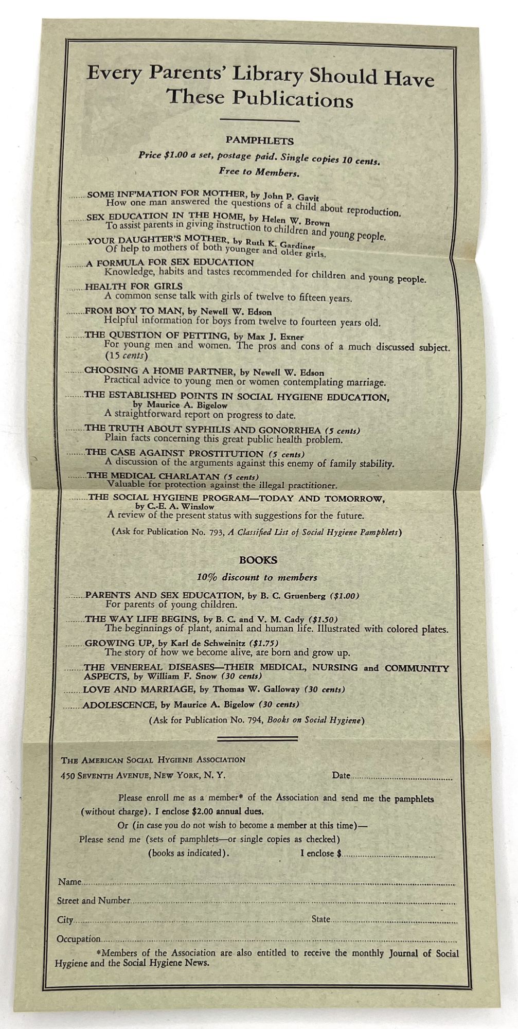 "For Your Home Library: Publications for Parents". New York, c.1937. 13" by 6" printed mail-order form requesting sex education materials from the Association.