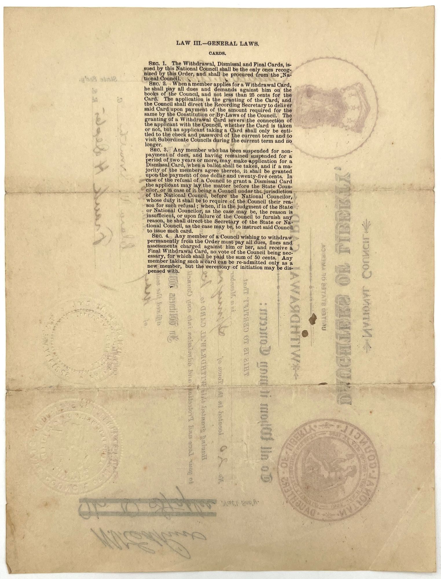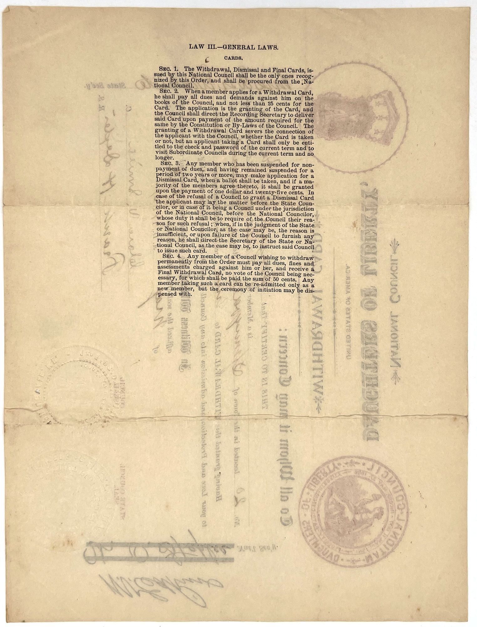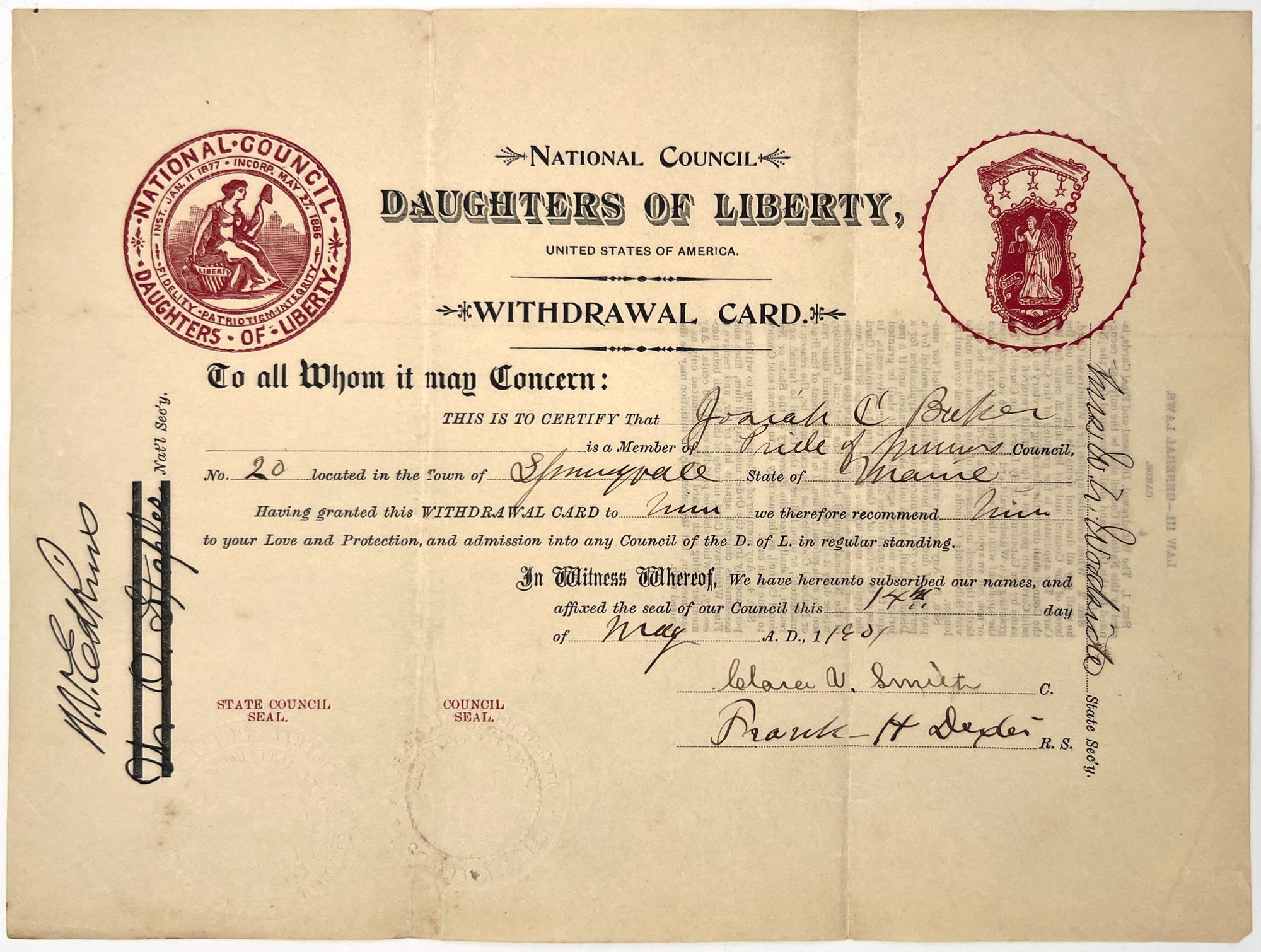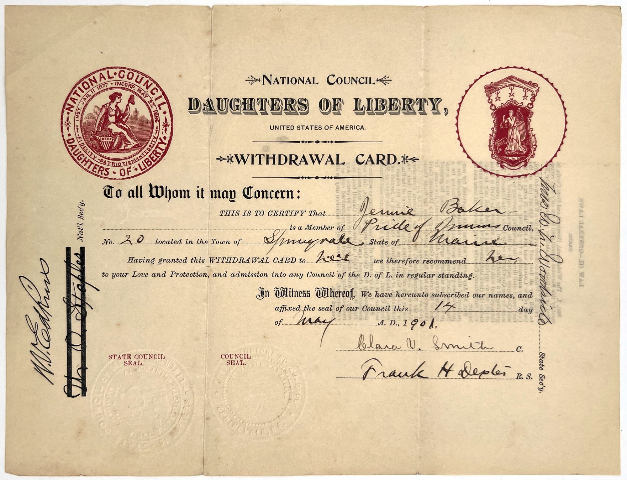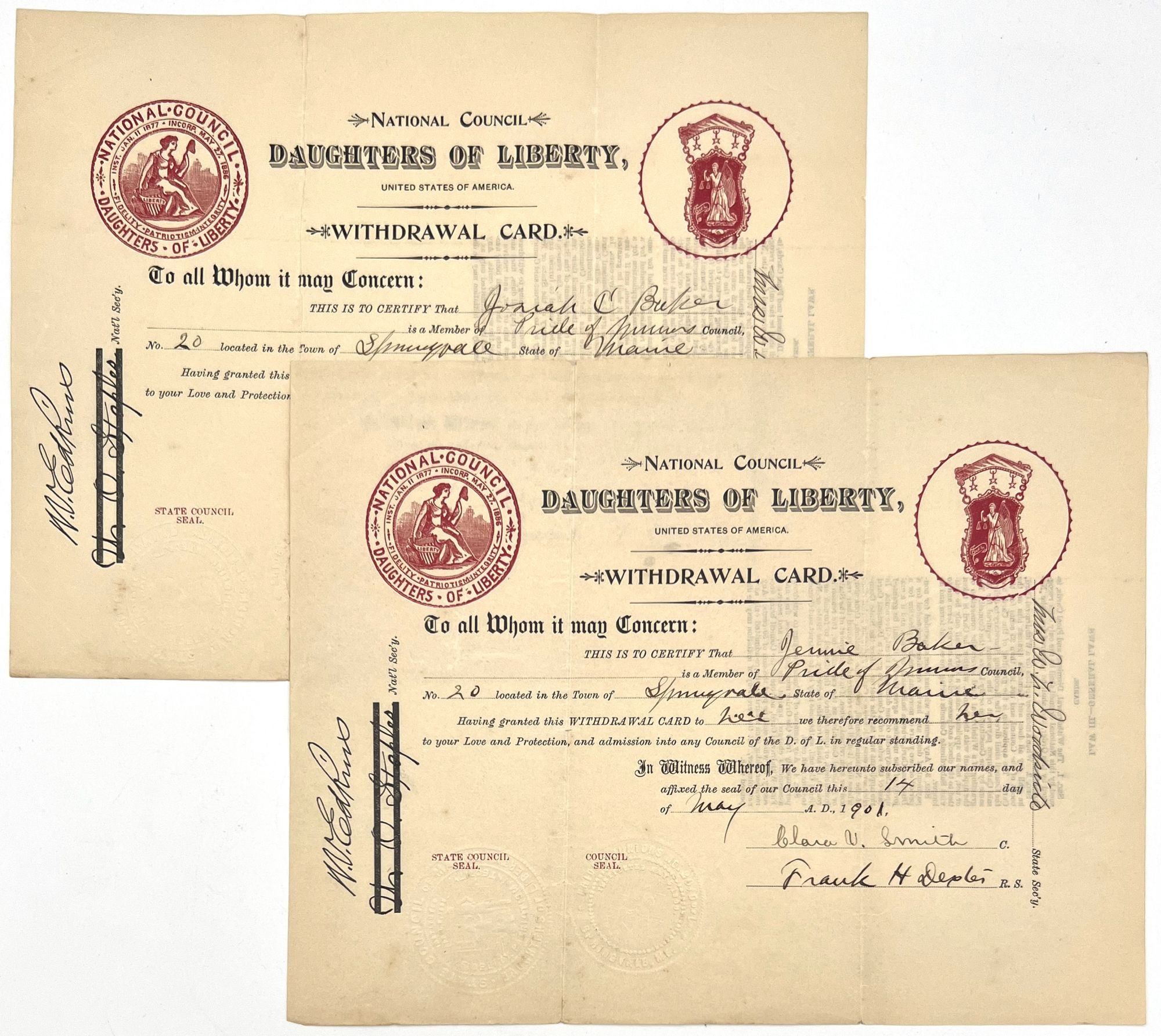 Springvale, Maine: Daughters of Liberty, 1901. Very good. Toned with letter folds, short tears.. Two (2) certified Withdrawal Cards (i.e. membership cards) held by members of Daughters of Liberty in 1901. The Daughters of Liberty was a female auxiliary of the Order of United American Mechanics, a Nativist organization organized in the 19th century that opposed immigration. Its core belief was that cheap immigrant labor was putting native-born Americans out of work (sound familiar?) and that immigration should be stopped to protect the integrity of the "real" America. An ugly chapter in an ongoing battle over who gets to claim the label "American". It goes without saying that only White women were allowed to join the Daughters of Liberty. Eventually, the Nativist core of the group subsided and it became largely devoted to insurance for workers. These particular membership certificates are finished in ink and were granted to Jennie and [?] Baker of Springvale, Maine, in May of 1901. Each is blind stamped with the society's seals and signed by three of the group's officers. Each measures approx. 8.25" by 10.75", with by laws printed on versos.