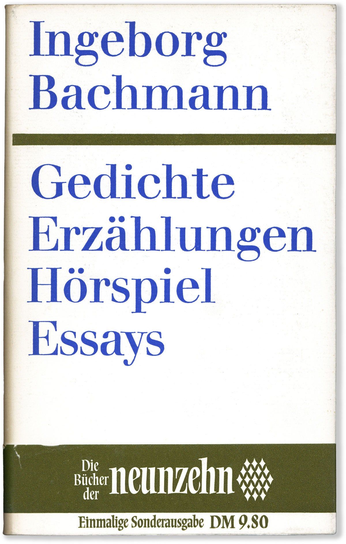 München, Germany: R. Piper & Co, 1964. Octavo (20.5cm); blue cloth-covered boards with grey title label on spine; dustjacket; [10],11-346,[6]pp. Text in German. Slight scratch to upper edge of textblock (causing slight impressions to upper margins of several pages); Very Good+. Dustwrapper, spine-toned, with trace shelf-soil and foxing; Very Good. Dustwrapper's removable green ban lightly tanned with tiny tears. Collection of verse, short stories, and radio plays, including "Ausfahrt", "Ein Wildermuth", and "Der gute Gott von Manhattan". [86854].