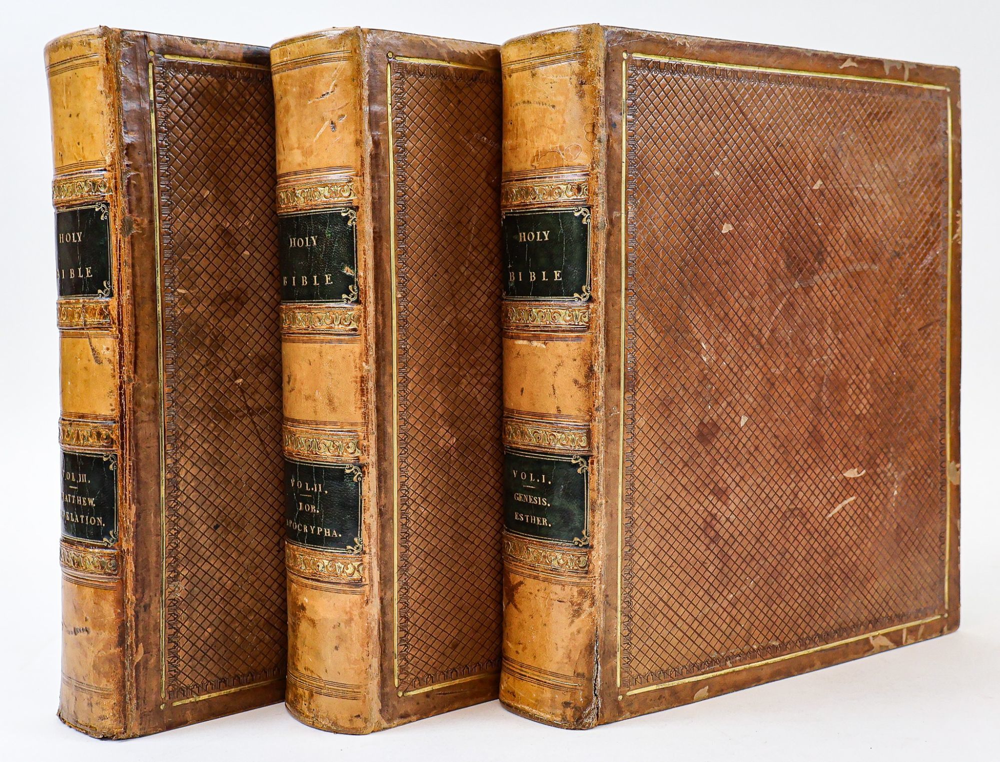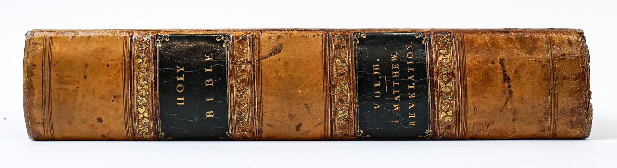CONTENTS: Vol. I (Introductions to the Bible and the Old Testament, Genesis [through] Esther); Vol. II (Job [through] Malachi [with] The Apocryphal Books); Vol. III "Vol. II, Part II" (Introduction to the New Testament, Matthew [through] Revelation [with] Indexes, Tables, List of Authors). All volumes unpaginated with numerous maps and illustrated plates.