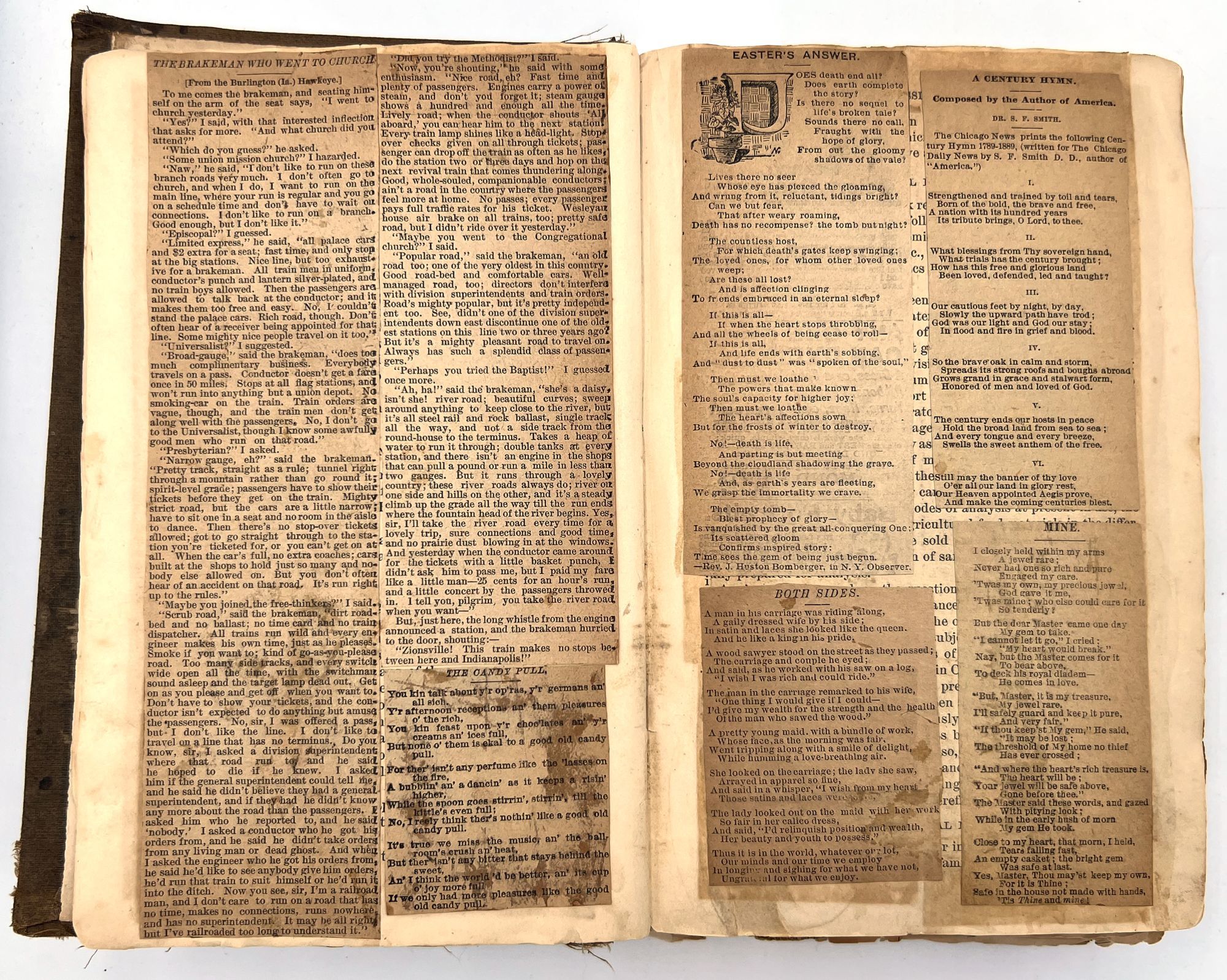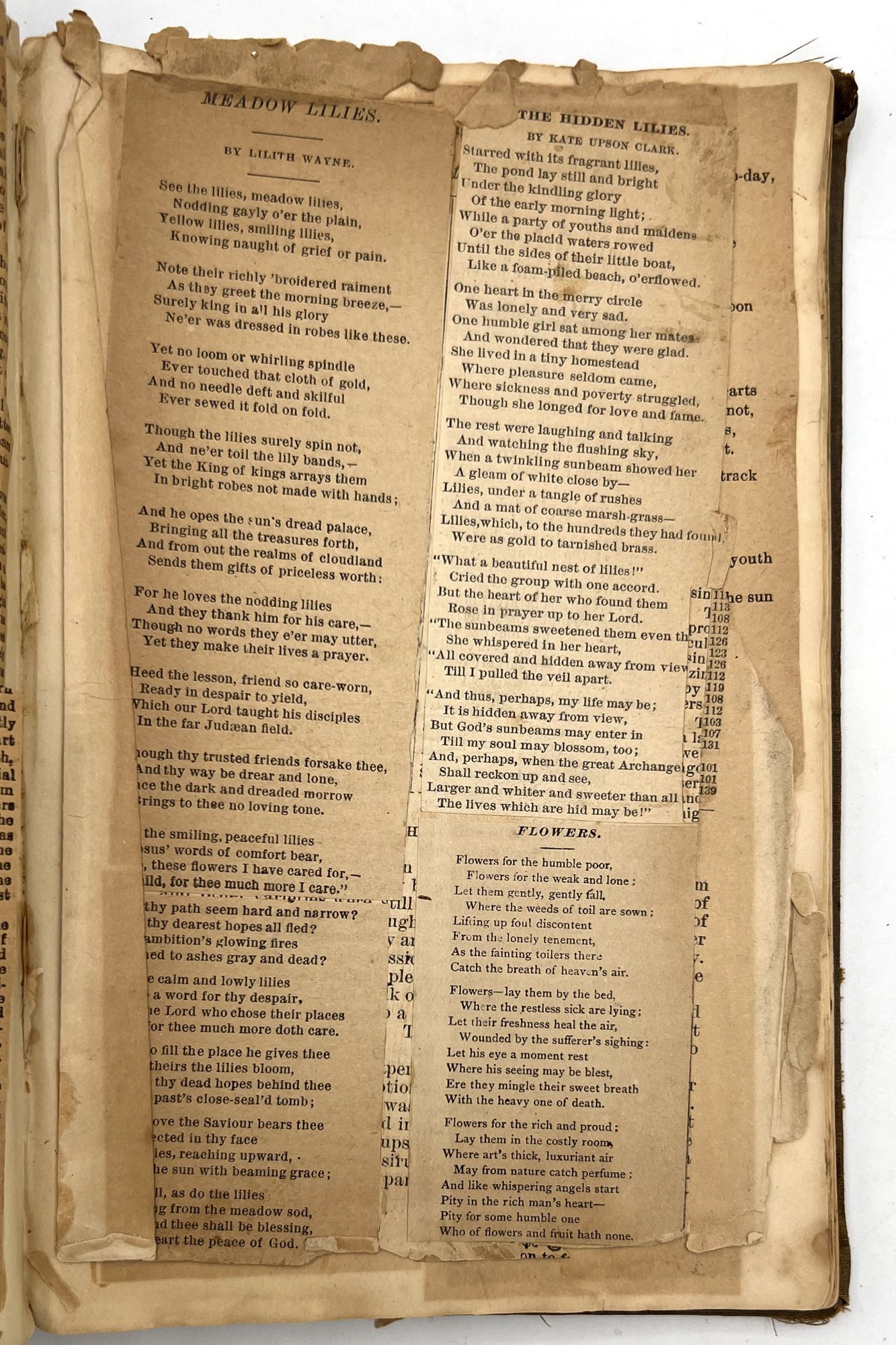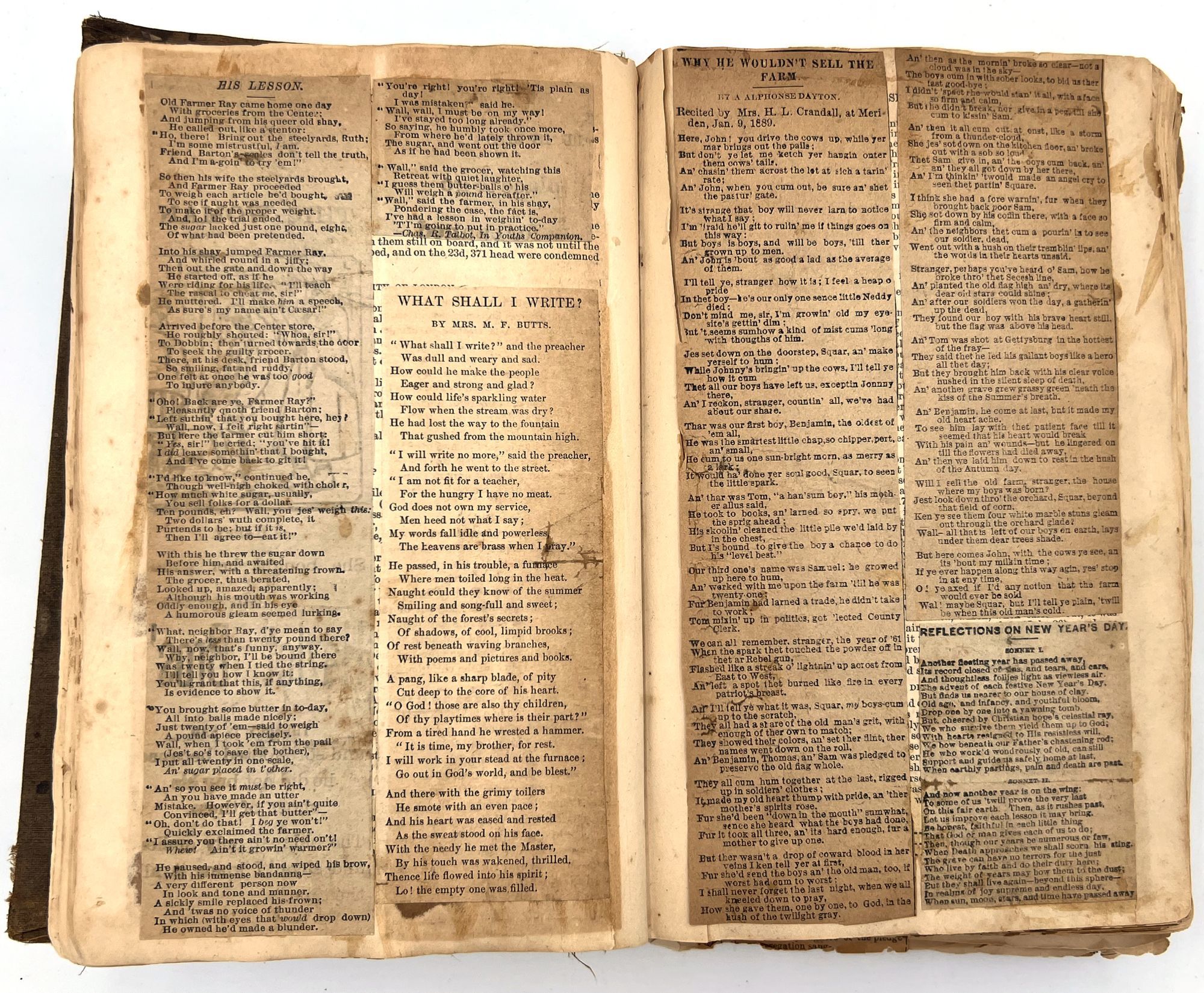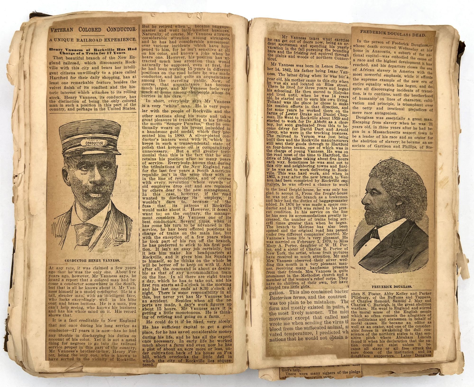 Vernon, Connecticut, 1880. Poor to fair. Binding worn with cracked hinges, toning inside with staining, the occasional short tear or loose clipping.. An album of newspaper clippings compiled by what appears to be one individual in Connecticut (most likely Vernon or Tolland) in the 1880s. Each of the clippings has been pasted onto the pages of a bound "Report of the Commissioner of Agriculture" dated 1881. The clippings range in subject, but paint a distinct picture of the compiler and show consistent threads of thought and theme. Clippings are mostly poetry with following themes: love and friendship; holiday (e.g. Easter or Christmas tidings); mourning; patriotism and American pride (e.g. ode to General Grant); humor; religion and morality; domesticity and family; rural and farm life; marriage (i.e. how to keep a marriage strong); and women's interest. Includes a couple brief obituaries gesturing towards the compiler's social network (in Vernon and environs). Notable figures quoted in the clippings are William Cullen Bryant, Walt Whitman, Harriet Beecher Stowe, and John Greenleaf Whittier. Includes brief biographies of Frederick Douglass and Conductor Henry Vanness (the only Black train conductor in the country at the time). Nearly every single page is filled with clippings, providing rich fodder for those interested in the internal life of who we presume was a young woman living in Vernon, Connecticut in the 1880s. Single vol. (9.25" by 5.75"), approx. 700 pp., nearly all filled with clippings, in contemporary cloth binding.