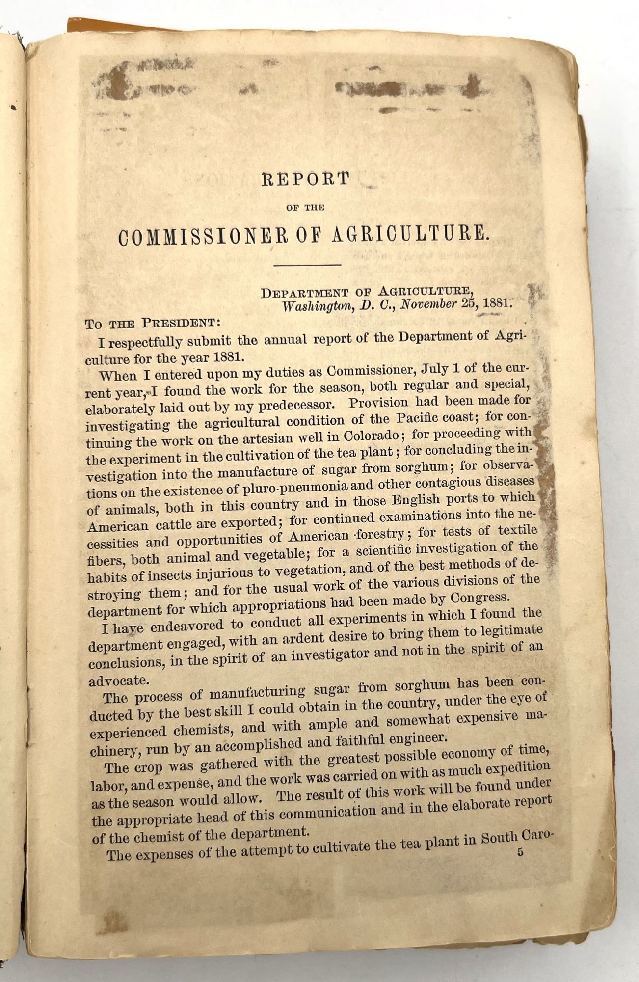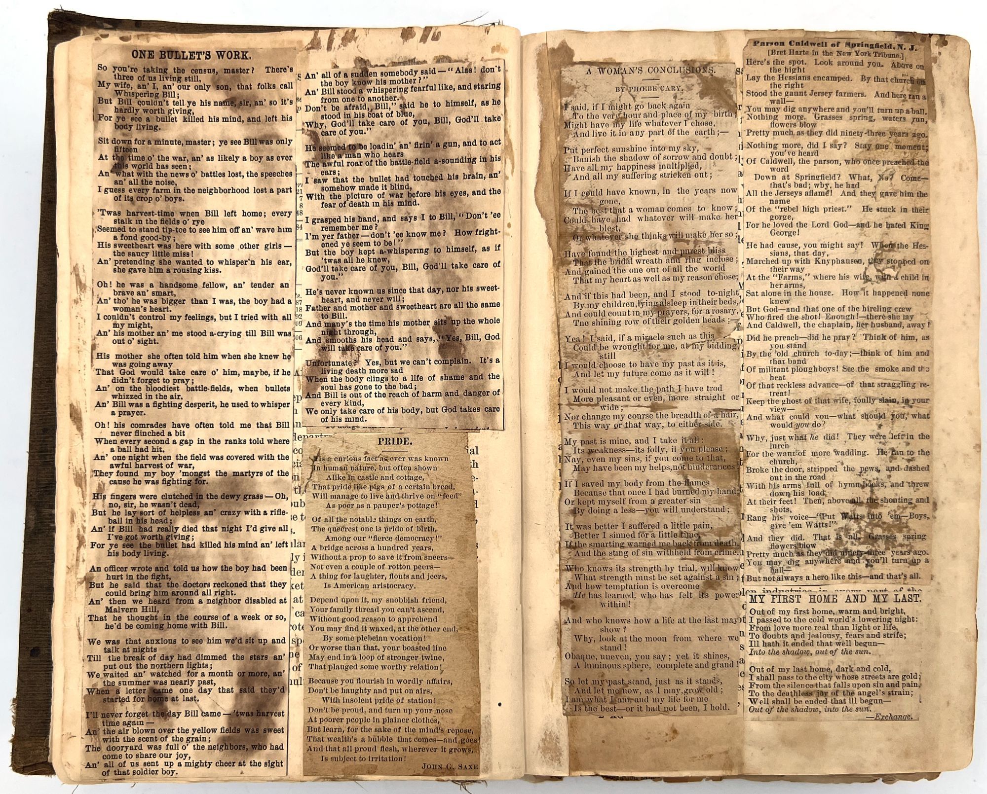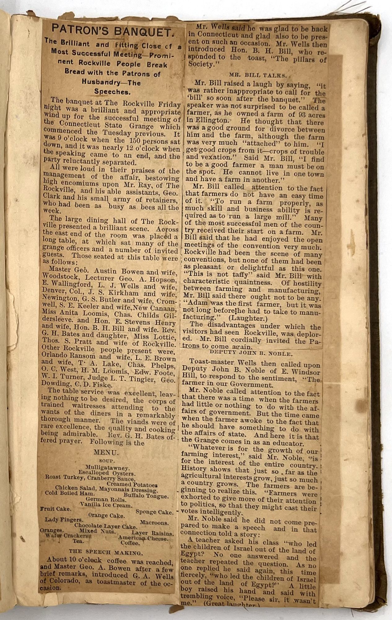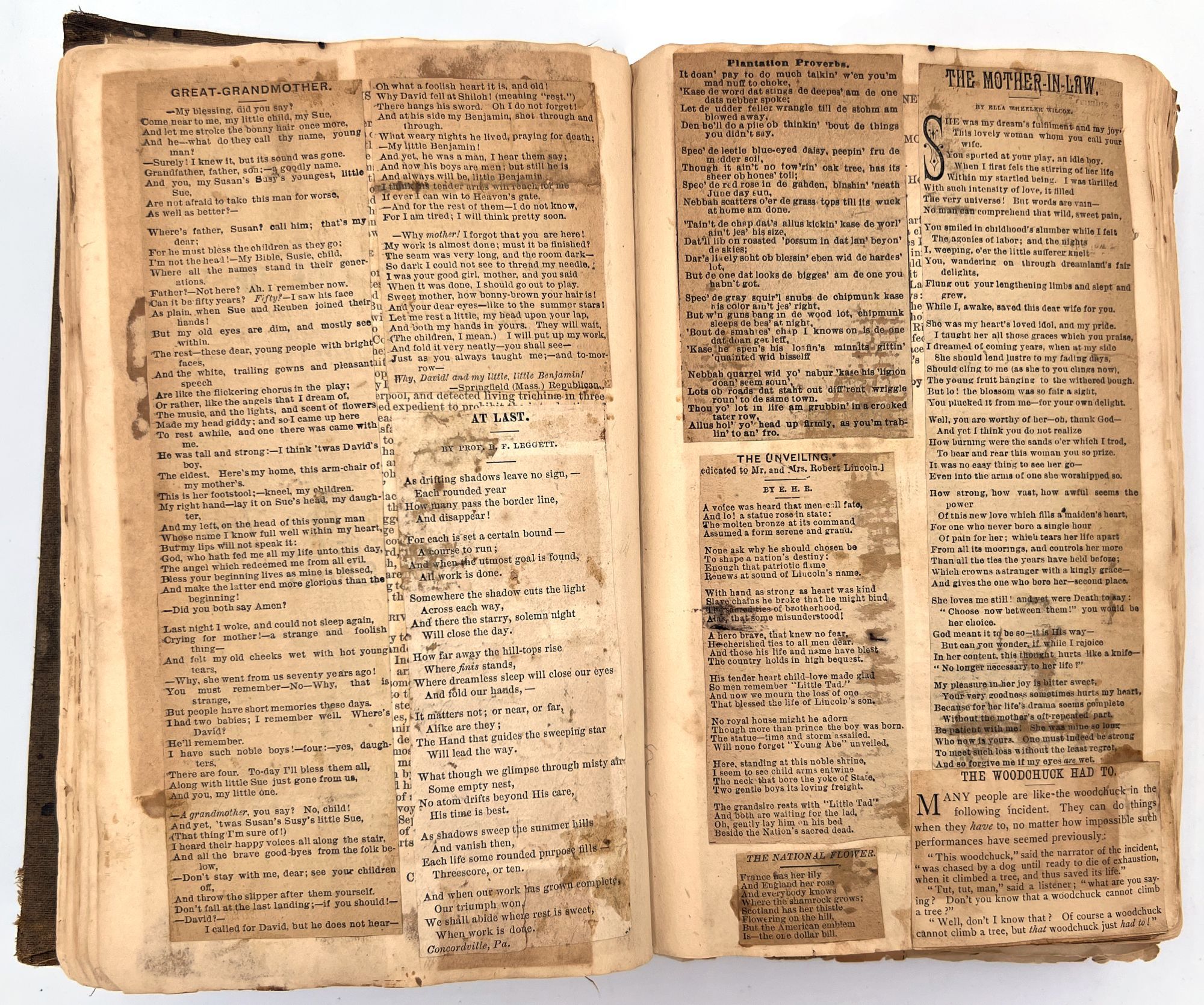 Vernon, Connecticut, 1880. Poor to fair. Binding worn with cracked hinges, toning inside with staining, the occasional short tear or loose clipping.. An album of newspaper clippings compiled by what appears to be one individual in Connecticut (most likely Vernon or Tolland) in the 1880s. Each of the clippings has been pasted onto the pages of a bound "Report of the Commissioner of Agriculture" dated 1881. The clippings range in subject, but paint a distinct picture of the compiler and show consistent threads of thought and theme. Clippings are mostly poetry with following themes: love and friendship; holiday (e.g. Easter or Christmas tidings); mourning; patriotism and American pride (e.g. ode to General Grant); humor; religion and morality; domesticity and family; rural and farm life; marriage (i.e. how to keep a marriage strong); and women's interest. Includes a couple brief obituaries gesturing towards the compiler's social network (in Vernon and environs). Notable figures quoted in the clippings are William Cullen Bryant, Walt Whitman, Harriet Beecher Stowe, and John Greenleaf Whittier. Includes brief biographies of Frederick Douglass and Conductor Henry Vanness (the only Black train conductor in the country at the time). Nearly every single page is filled with clippings, providing rich fodder for those interested in the internal life of who we presume was a young woman living in Vernon, Connecticut in the 1880s. Single vol. (9.25" by 5.75"), approx. 700 pp., nearly all filled with clippings, in contemporary cloth binding.