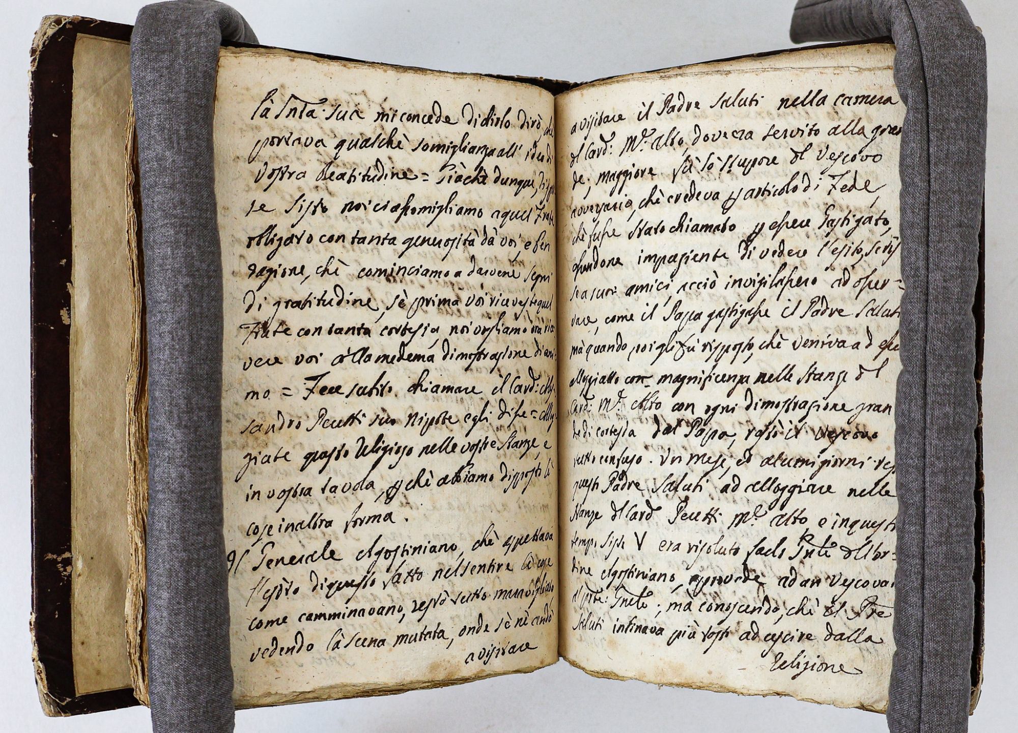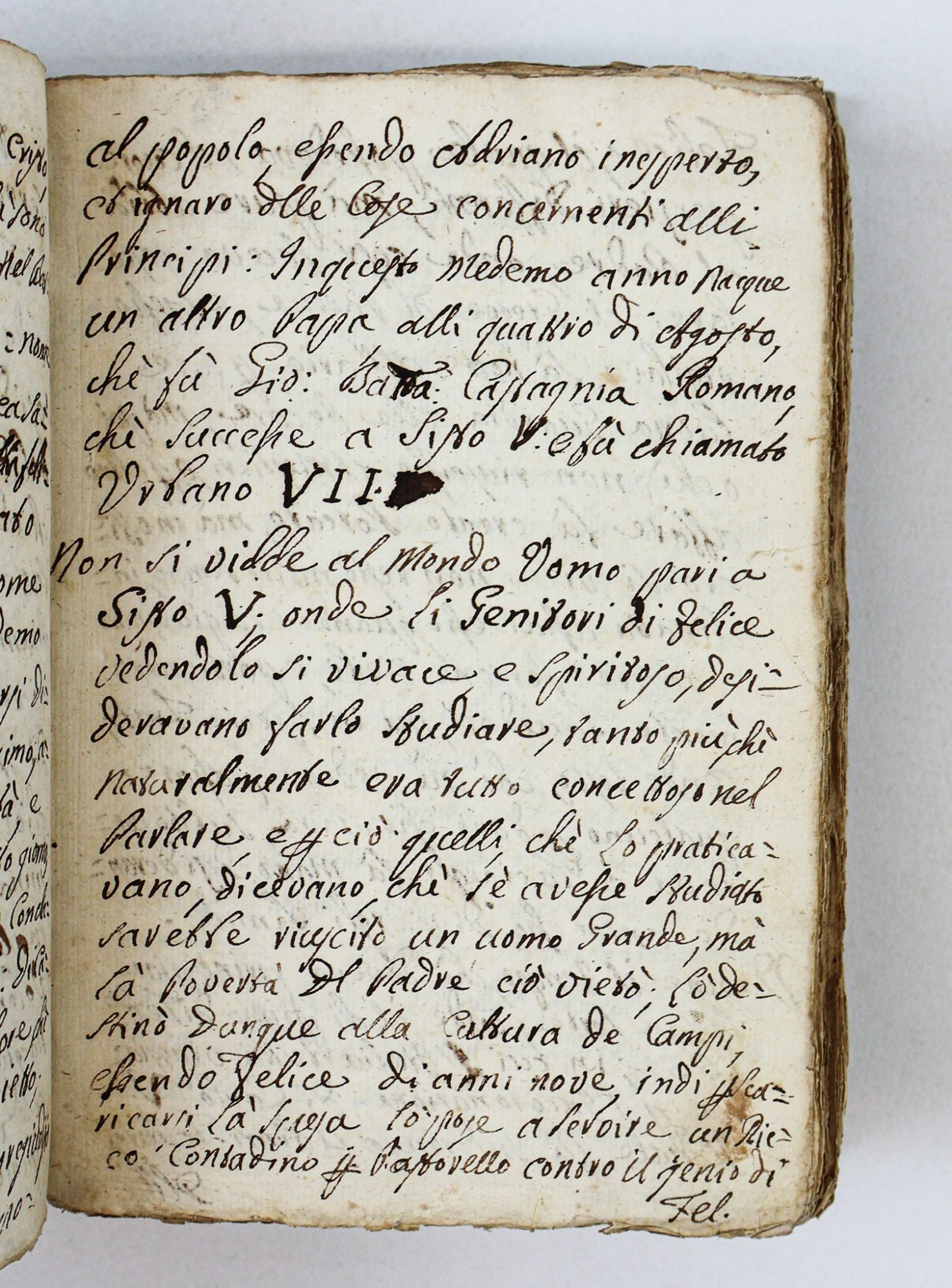 The manuscript preserves a full-scale vernacular biography of Pope Sixtus V (Felice Peretti, 1521–1590) in four parts (parte) further subdivided into chapters (capitolo). This comprises the bulk of the codex (pp. 1–594). This vita belongs to the long-form narrative tradition also represented in Vatican Barberini Lat. 4971 and related codices, marked by its opening formula (“Nacque Sisto V nella Marca, cioè nel Castello delle Grotte…”) and by the inclusion of contemporary anecdotes, satirical pasquinate, and popular commentary. The copyist has added a distinctive opening homage (“Non si vidde né tempi passati né si vedrà in futuro Istoria che l’eguagli…”) not found in other witnesses.