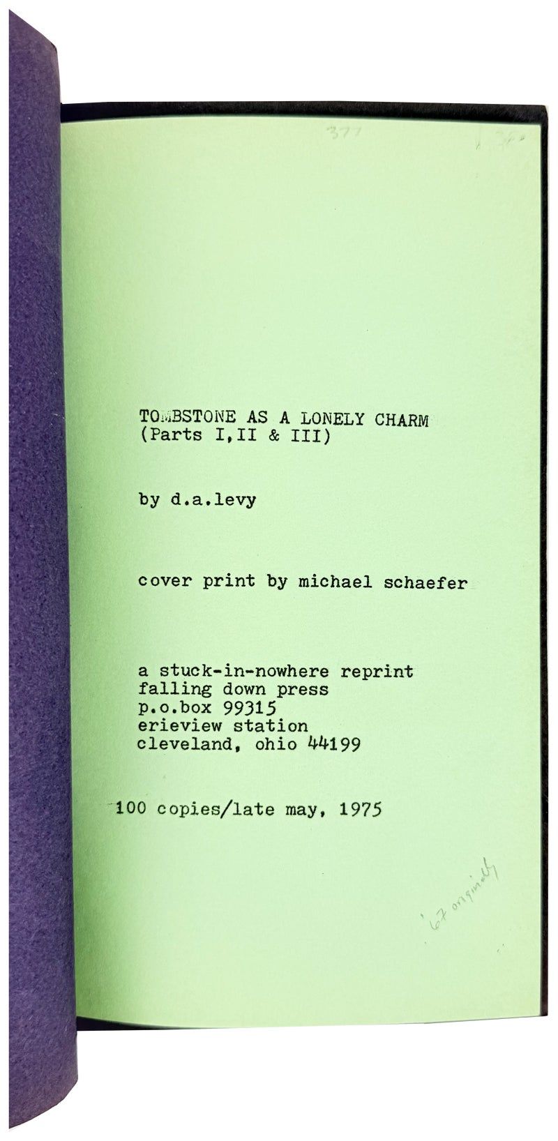 Cleveland, OH: Falling Down Press, 1975. Very Good +. Cleveland, OH: Falling Down Press, 1968. A Stuck-in-Nowhere Reprint Limited to 100 copies. Octavo (23cm); publisher's blue-black card wrappers, upper cover adorned with a skeleton print by Michael Schaefer, rear cover with small collage of two yellow paper strips, "D.A. Levy" printed in red; [12]ll. printed mimeograph from typescript on rectos only; final leaf adorned with an original collage with rubber-stamp "Dead Fish Productions" along bottom edge. Collage glue a bit darkened, else a Very Good to Near Fine example.