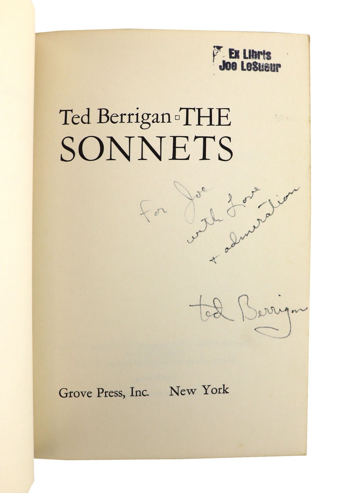 New York: Grove Press, Inc, 1967. Near Fine. New York: Grove Press Inc., 1964. Stated First Printing of first trade edition. Slim octavo (20cm); 72pp. Stiff staple-bound printed wraps retaining $1.50 price. Wraps lightly bumped and scuffed; verso toned at edges. Binding sound. Textblock and endsheets show some foxing and toning; interior pages remain clean. Former owner and inscription dedicatee’s personal ex-libris stamp at full title page. Very Good or better. Signed and inscribed by the author on full title page: “for Joe / with love / + admiration / Ted Berrigan.”