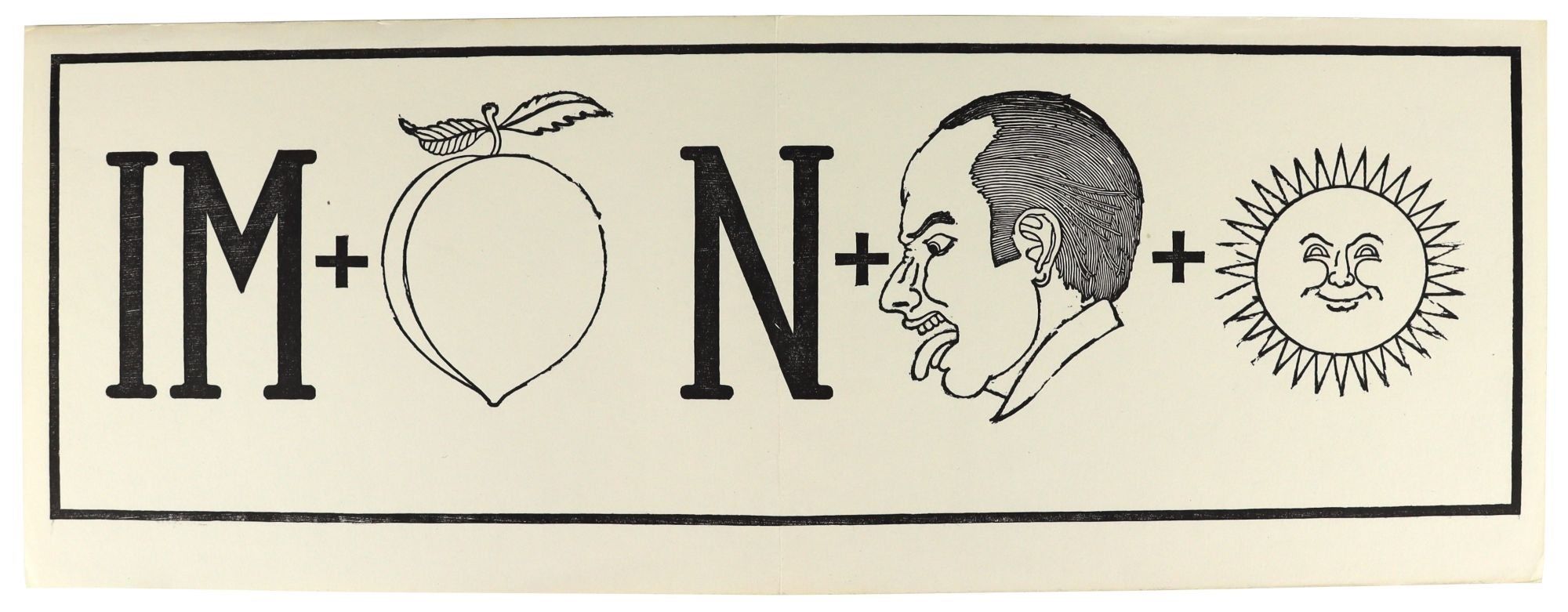 Iconic Impeach Nixon rebus ("Im + [peach] N+[ick] + [sun]") issued by the activist/artist collective Zephyrus Image run by Michael Myers and Holbrook Teter. The rebus also made a popular bumpersticker. Activist Eileen Callahan described handing out the rebus all over the Senate Office Building in Washington, DC, "I gave one to Hubert Humphrey, and, to his credit, he stopped and read it. After a few seconds, his face registered what could only be called 'extreme mirth" (Zephyrus Image, p. 54).