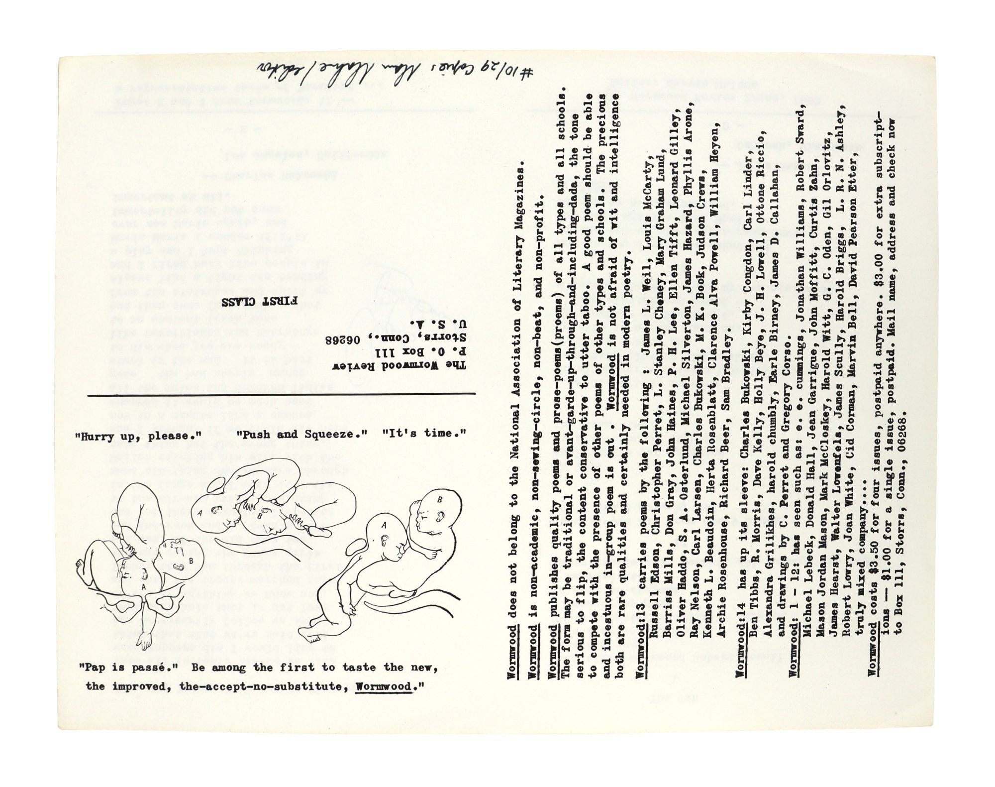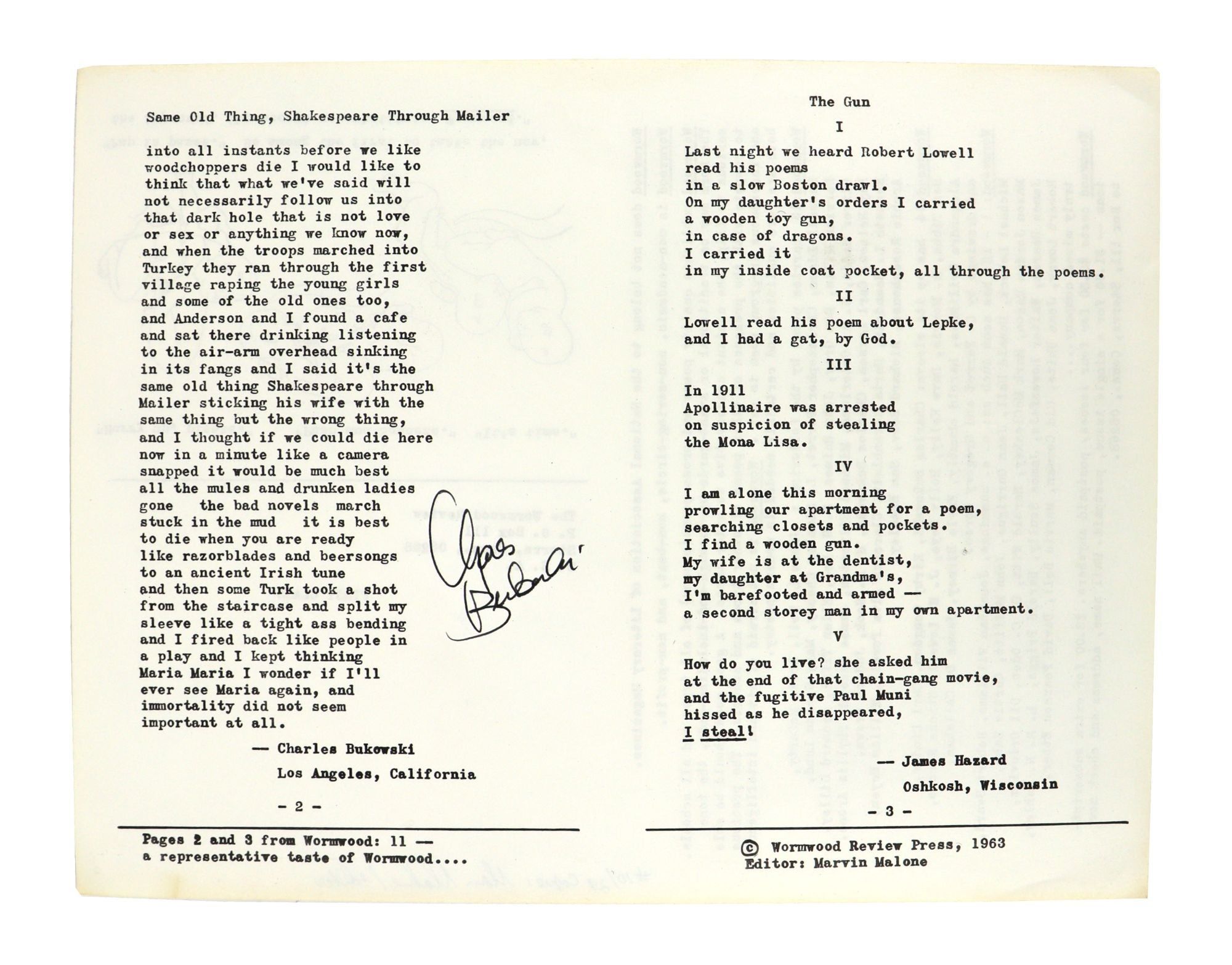 Scarce promotion for the Wormwood Review, here sold as "non-academic, non-sewing-circle, non-beat, and non-profit," and including pages 3 and 4 from Wormwood issue 11. Signed by Charles Bukowski beside his poem "Same Old Thing, Shakespeare Through Mailer." We locate two holdings in OCLC, at Emory and Brown.