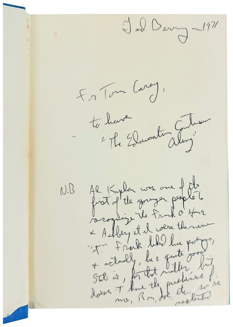 Inscribed by Ted Berrigan to fellow poet Tom Carey on front free endpaper with added nota bene, "Al Kaplan was one of the first of the younger people to recognize that Frank O'Hara & Ashbery et al were the new 'it.' Frank liked his poems + actually, he's quite good. Still is, for that matter, but doesn't have the pushiness of me, Ron, Joe etc, so is neglected." A notable copy for the context shared by Berrigan regarding the New York School poets.