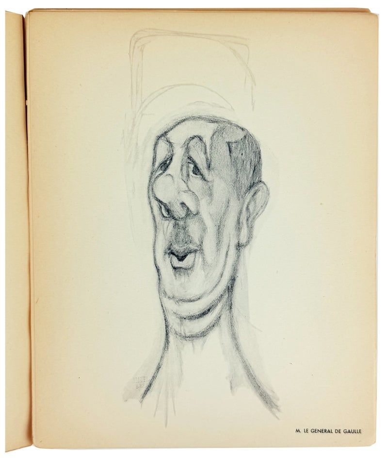 Collection of thirty-two caricatures of French political dignitaries by the Polish-born Jewish-French illustrator Louis Mitelberg (1919-2002), who often published under the pseudonym "Tim." A member of the French Resistance working from London during World War II, Mitelberg was naturalized in France after the war and built a career around making fun of the new, post-Vichy class of French politician, especially "le Grand Charles" de Gaulle, whose long sad face appears in this collection.