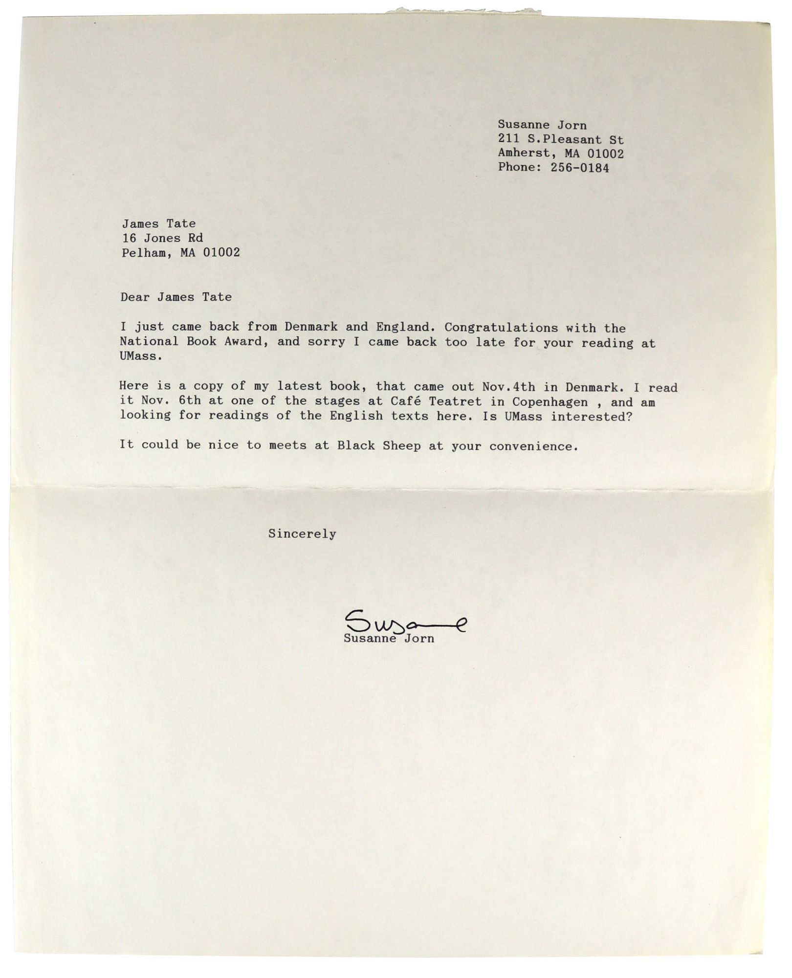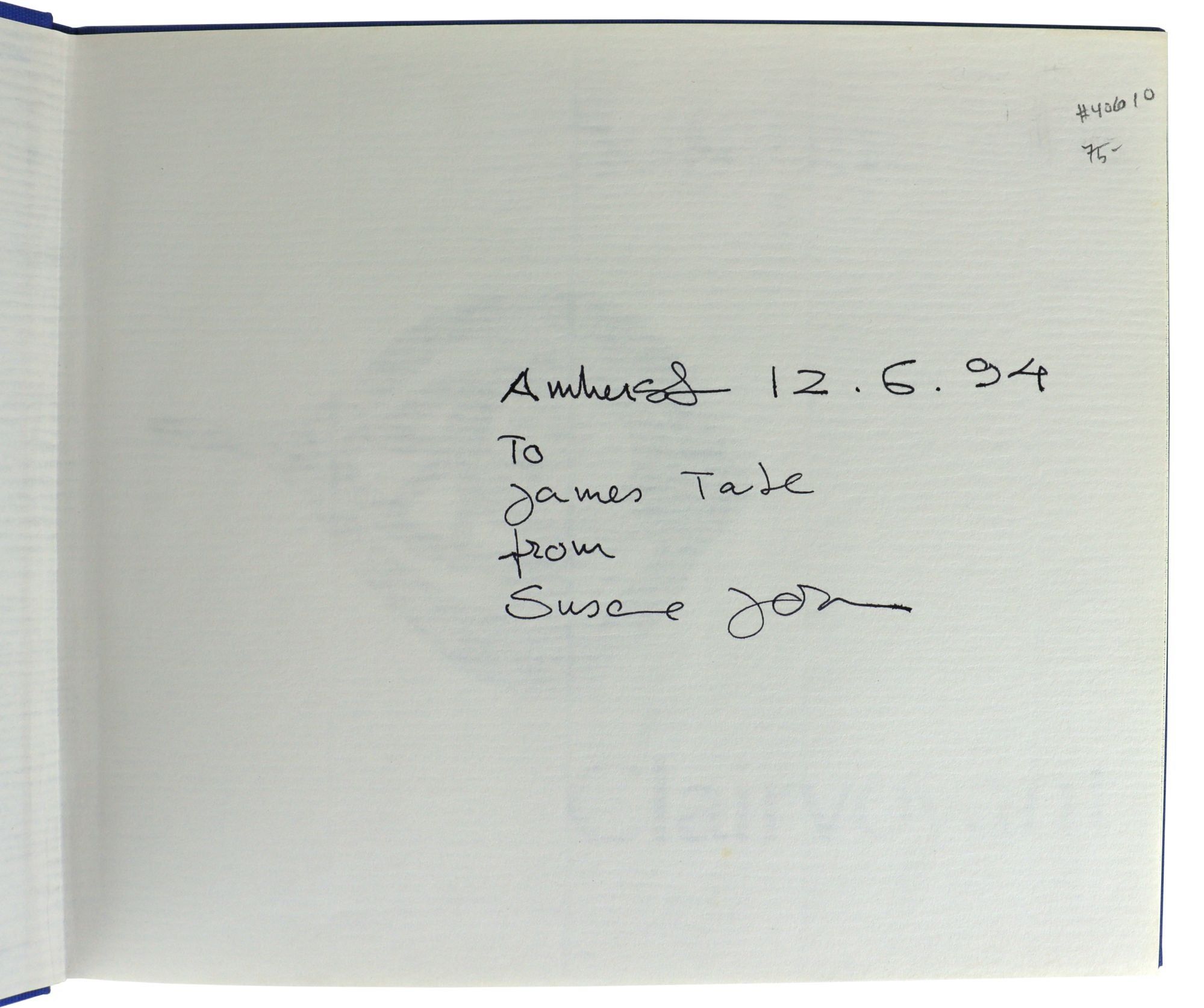 Inscribed and signed on front free endpaper, "Amherst 12.6.94 / To James Tate / from / Susanne Jorn." Offered with a short typed note signed by Jorn to Tate congratulating him on his National Book Award and apologizing for missing his reading at UMass.