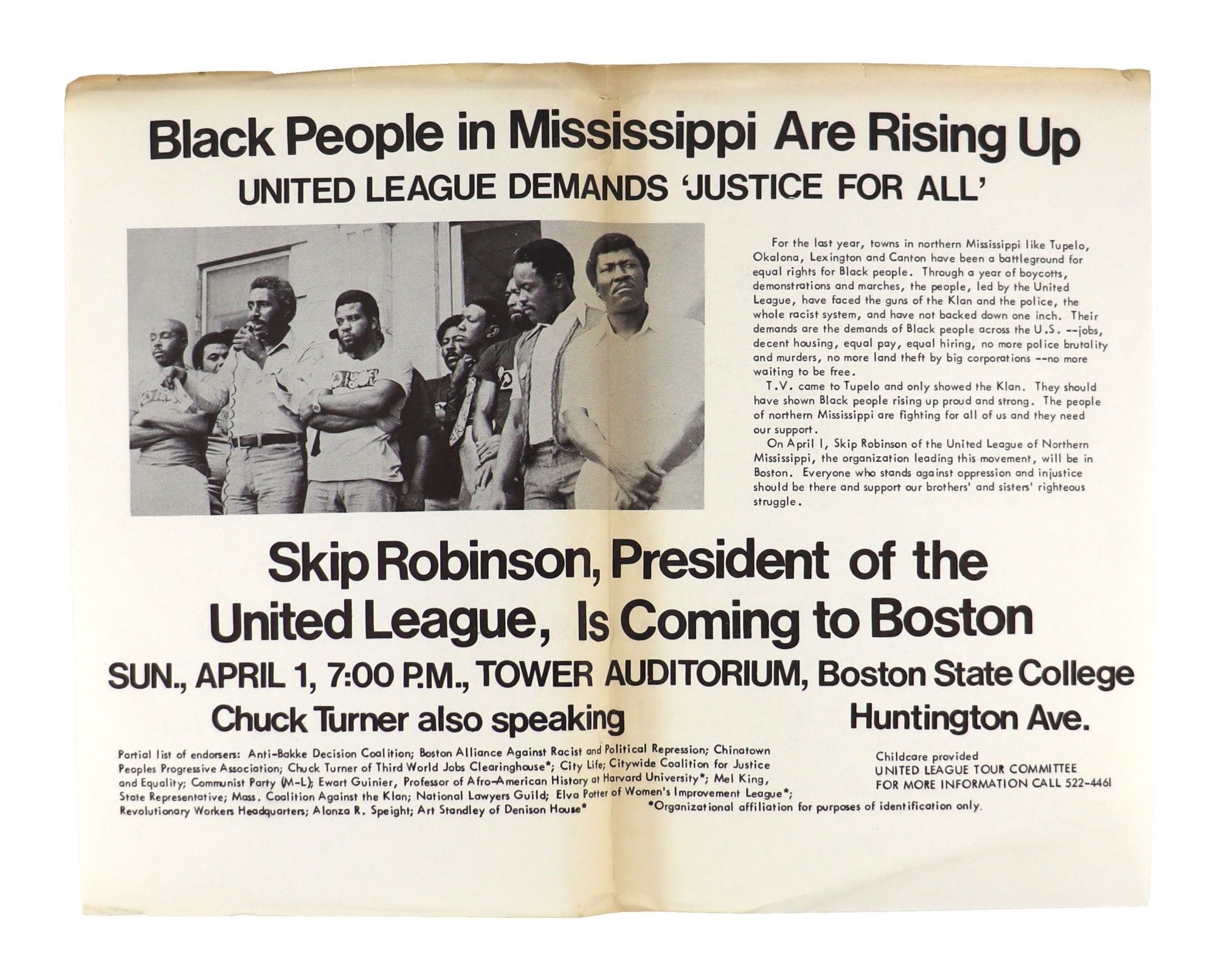 Laid-in at front is a folded one page flyer announcing an appearance by Skip Robinson, President of the United League of Northern Mississippi, in Boston with additional speaker Chuck Turner. Flyer creased, toned, and lightly worn. Good or better.