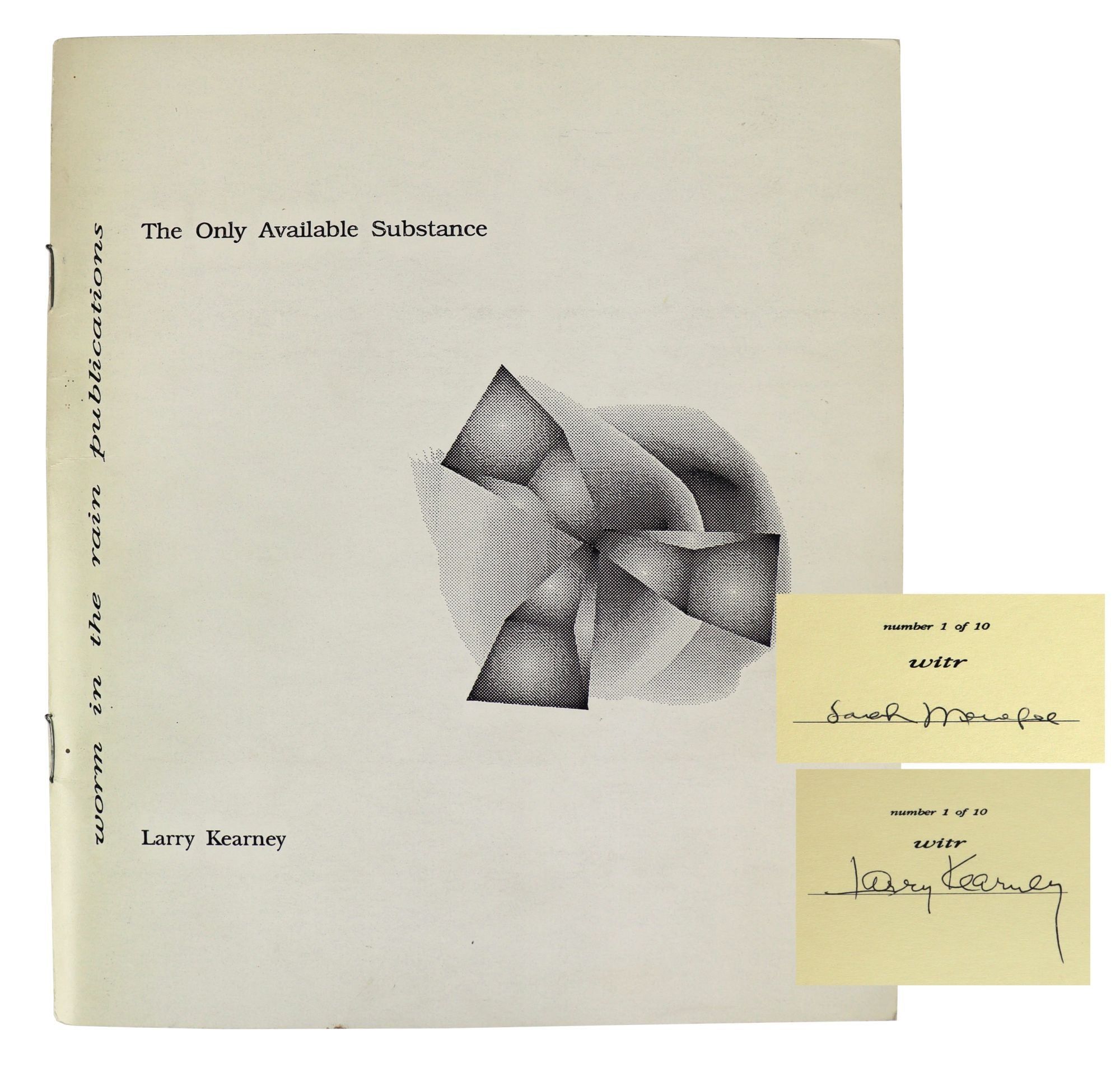 N.p.: Worm in the Rain Publications, 1991. Very Good. N.p.: Worm in the Rain Publications, 1991. First Edition, Limited to 10 copies. Small, slim quarto (21cm); publisher's white pictorial staplebound wrappers; unpaginated. Two poetry chapbooks bound dos-a-dos, signed by both authors on limitation page at head of each title. OCLC locates two copies as of October, 2025, at SUNY Buffalo and Berkeley.