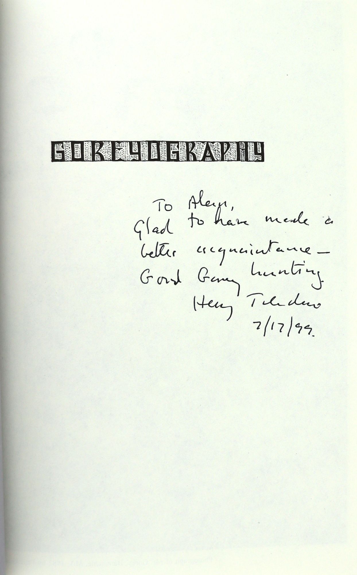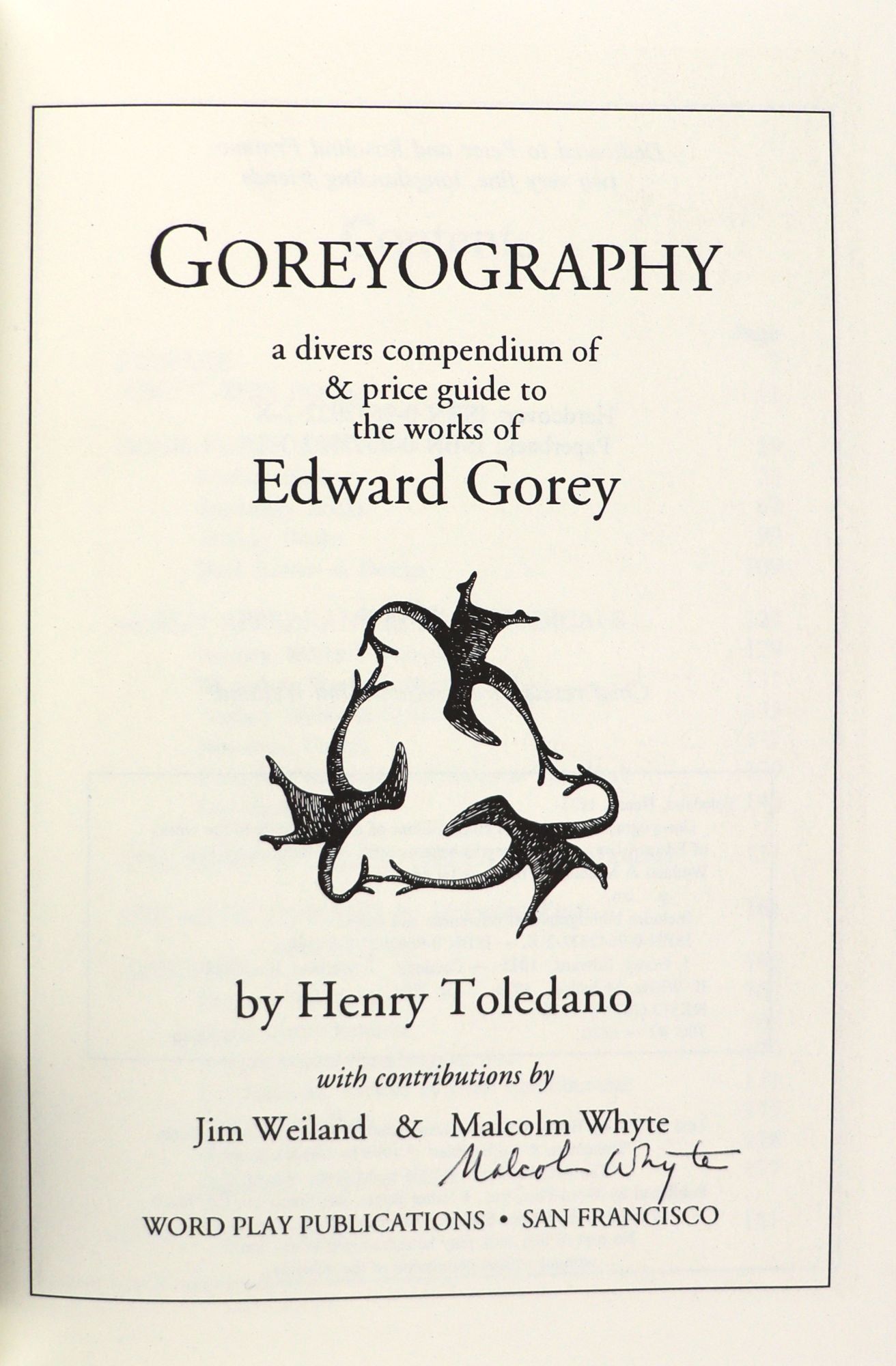 Signed by Toledano on half title with inscription "To Alex, Glad to have made a better acquaintance — Good Gorey Hunting. Henry Toledano, 7/17/99." Additionally signed without inscription by contributor Malcolm Whyte on full title. Standard bibliographic reference to Gorey's works.