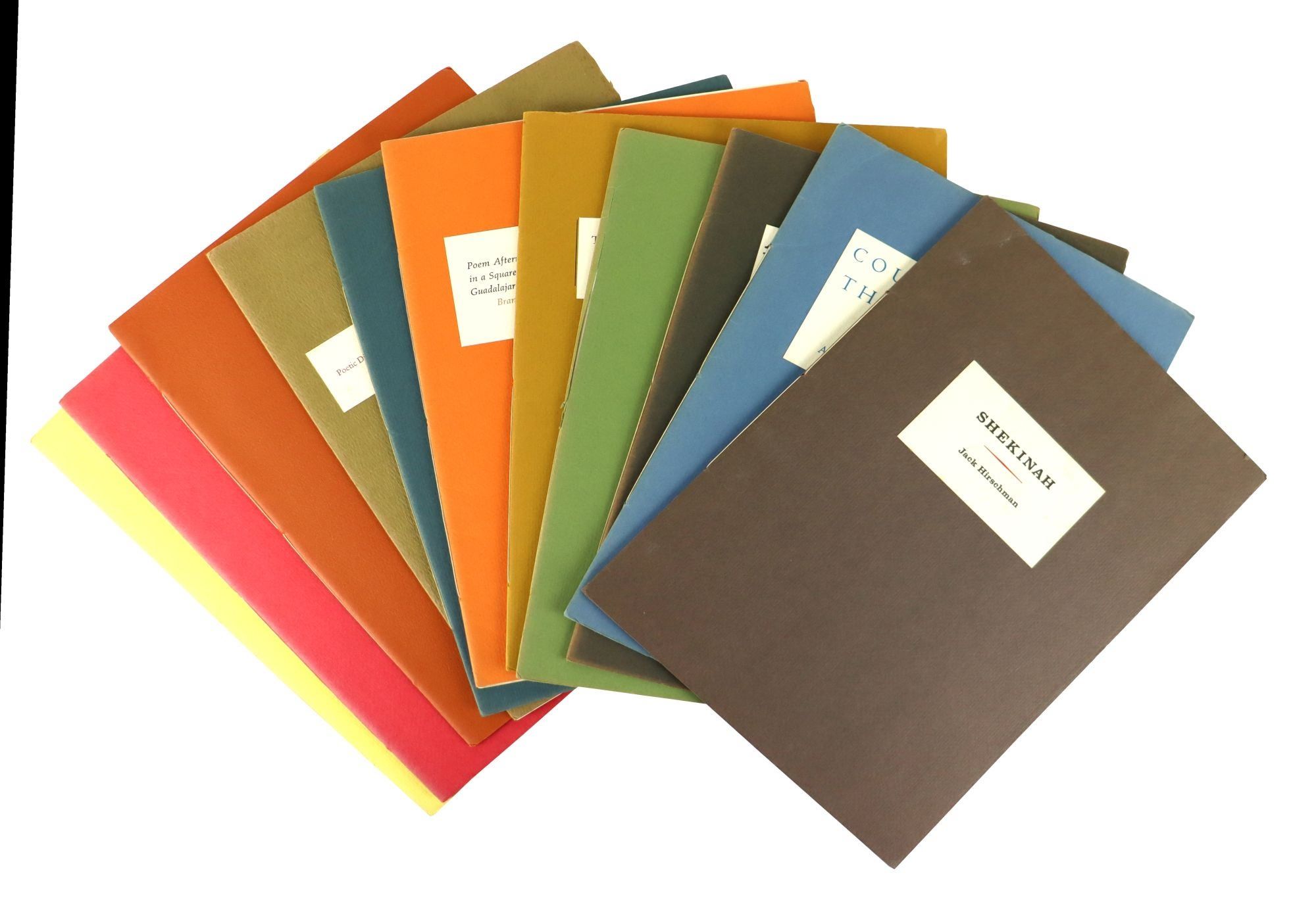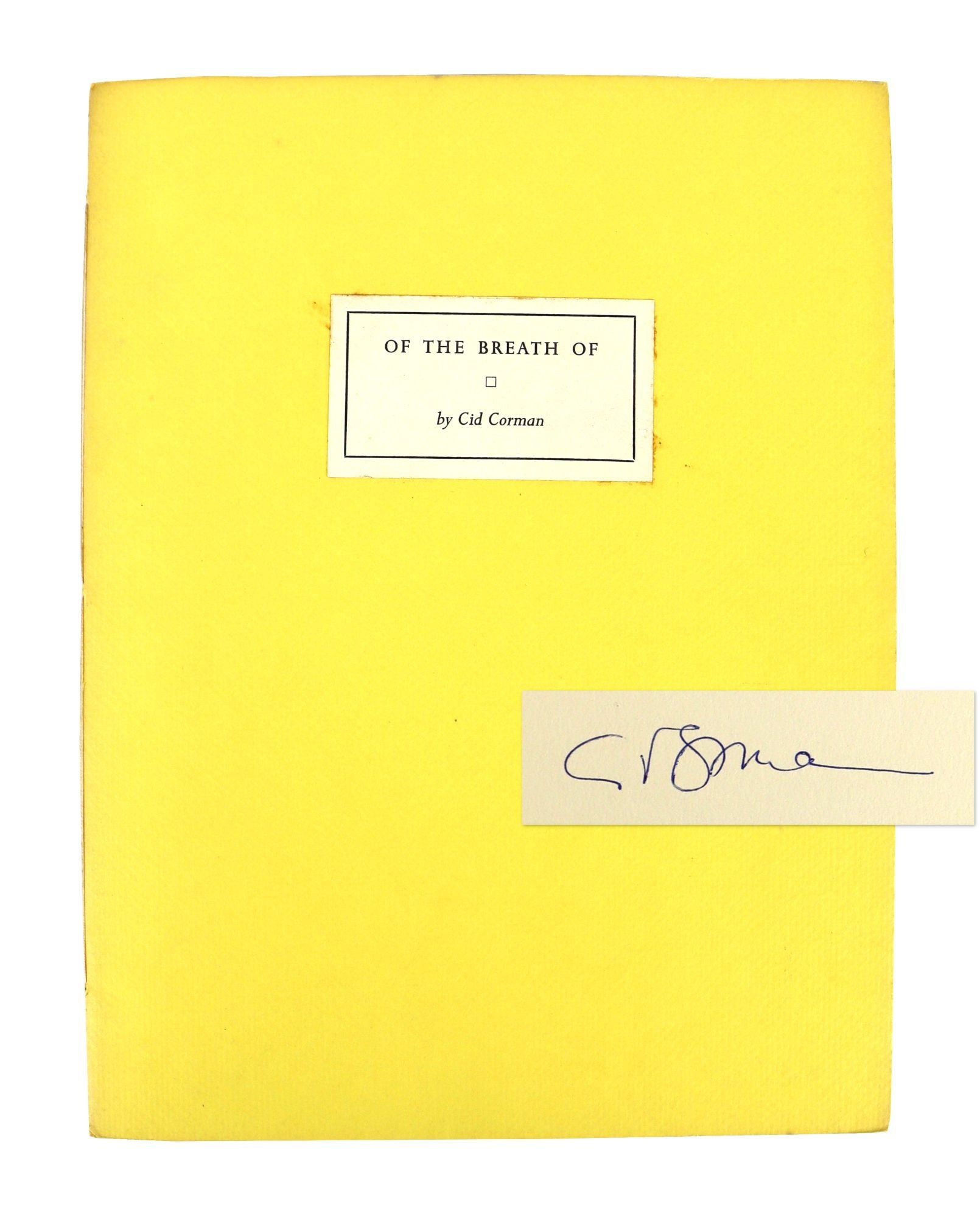 San Francisco, CA: Maya Quarto / Cranium Press, 1969. Very Good. [San Francisco, CA]: Maya Quarto / Cranium Press, 1969-1970. First Editions, all limited to 300 copies. Large, slim octavos (25.5cm); publisher's variously colored stitched card wrappers, printed paper paste-ons to upper covers; illus. Light wear to wrapper margins, a few spine edges sunned, the upper wrapper of David Meltzer's "From Eden Book" has four-inch slice along spine edge (probably from a box cutter) as well as small white paint splatter, else a Very Good, bright and sound collection accompanied by the distributor Serendipity Books's prospectus. Jack Hirschman's "Shekinah" inscribed and signed by the author on p. [2]; Cid Corman's "Of the Breath of" is one of fifty copies signed on colophon in rear.