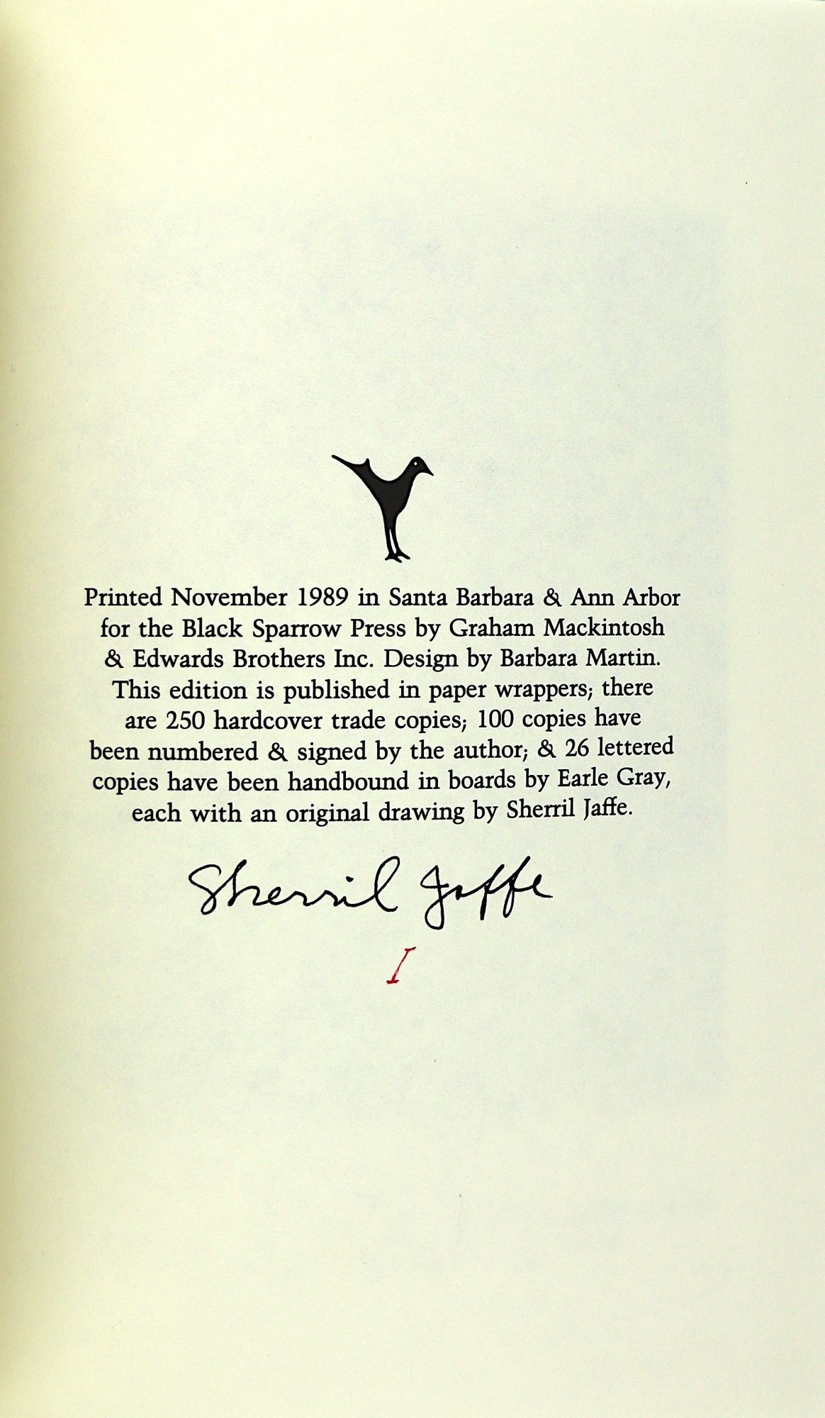 Santa Rosa: Black Sparrow Press, 1975. Very Good/Very Good. Santa Rosa: Black Sparrow Press, 1975. Deluxe Limited Edition of 26 lettered copies with an original drawing tipped-in, of which this is letter I. Octavo (23.5cm); publisher's acetate jacket over printed paper-covered boards; 179pp. Acetate jacket crisp with a bit of dust-soiling. Boards sturdy and square. Binding sound and pages unmarked.