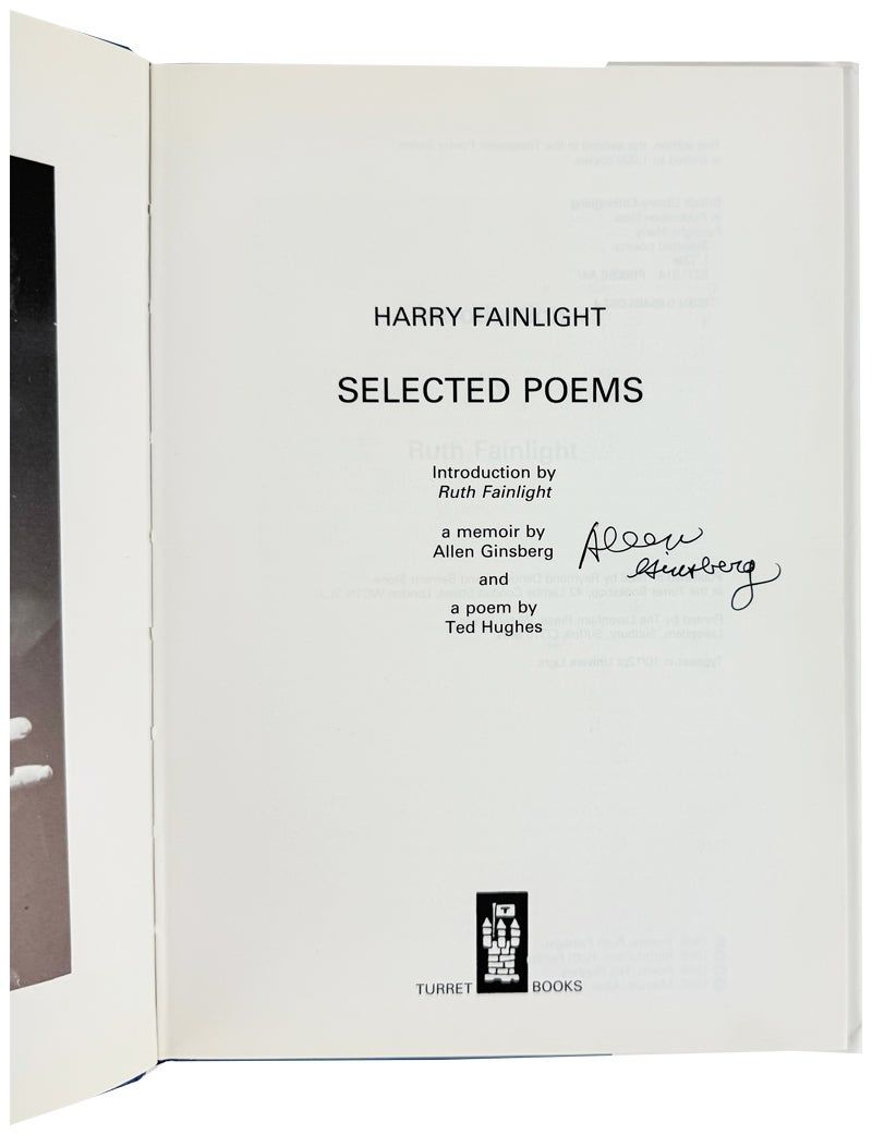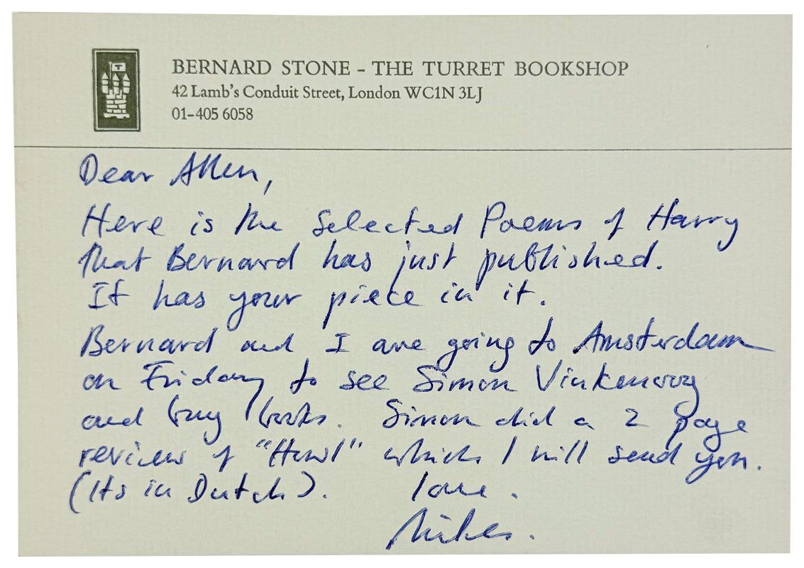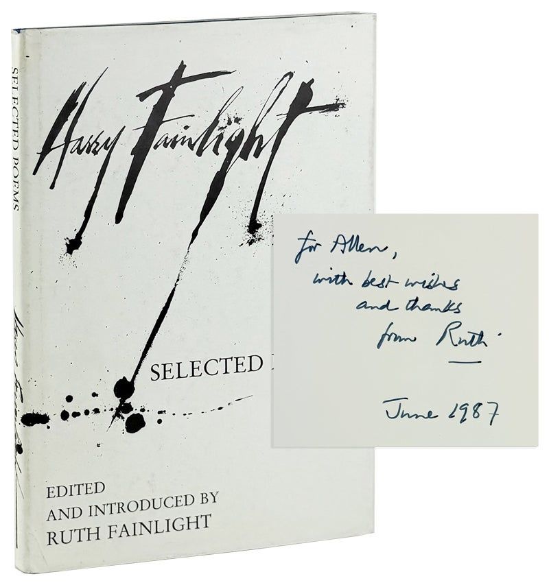 Allen Ginsberg's copy signed by him on title page and inscribed to him by Ruth Fainlight on front free endpaper, "For Allen, with best wishes and thanks from Ruth. June 1987." Laid in is an autograph note on publisher Bernard Stone's postcard letterhead, "Dear Allen, Here is the Selected Poems of Harry that Bernard has just published. It has your piece in it. Bernard and I are going to Amsterdam on Friday to see [Dutch spoken word poet] Simon Vinkenoog and buy books. Simon did a 2 page review of 'Howl' which I will send you (It's in Dutch). Love, Miles [?].