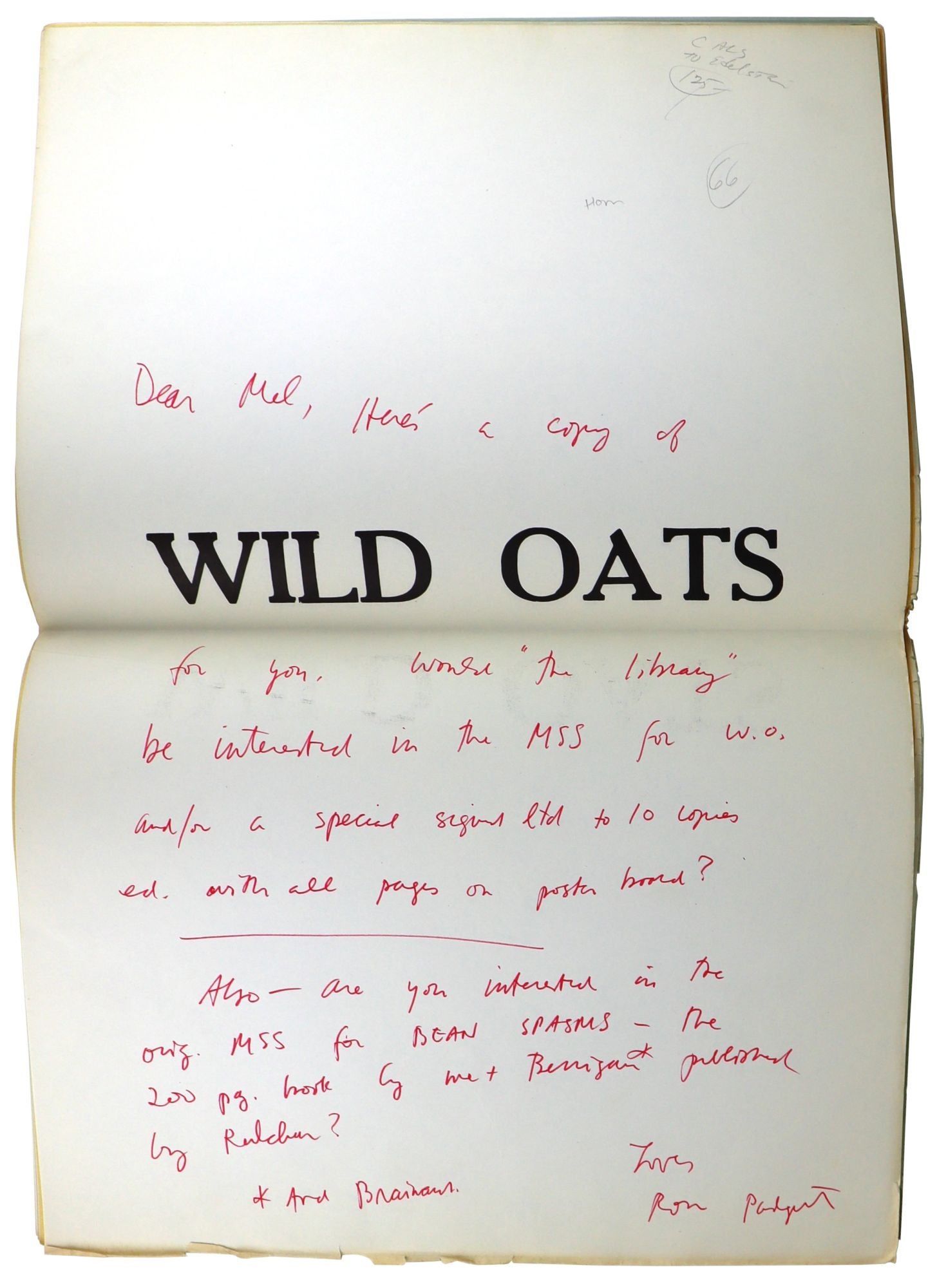 Accompanied by an added title page on which contributor Ron Padgett has written an inscription in red marker, "Dear Mel, Here's a copy of [Wild Oats] for you. Would 'the library' be interested in the MSS for w.o. and/or a special signed ltd to 10 copies ed. with all pages on poster board? Also--are you interested in the orig. MSS for BEAN SPASMS--the 200 pg. book by me + Berrigan [and Brainard] published by Kulchur? Love, Ron Padgett." Previous bookseller lists the inscribee as the late collector and bibliographer Mel Edelstein.