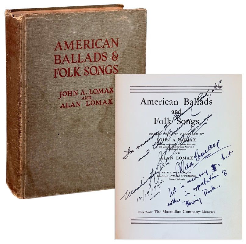 New York: The MacMillan Company, 1935. Very Good -. New York: The MacMillan Company, 1935. Third Printing. Signed by both John A. Lomax and Alan Lomax with brief inscriptions at title page referencing Blowing Rock, North Carolina. Small quarto; 625pp. Gray cloth stamped in red; no dust jacket. Boards worn with chipping and fraying to edges; heavier at spine ends; spotting and scuffing. Binding gives a little but overall sound. Previous owners' inscriptions to endpapers; a few pencil notes and smudges to text; Good to Very Good.