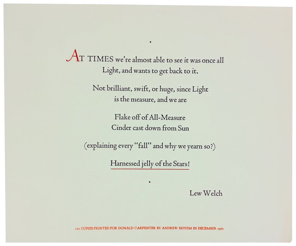 N.p.: Andrew Hoyem, 1965. Fine. N.p.: Printed for Donald Carpenter by Andrew Hoyem, 1965. First Edition, Limited to 125 copies. Bifolium printed in black and red on cream stock, text printed on upper panel only. A Fine example of this early poetry chapbook, printed by Hoyem in December of 1965. Fewer than ten examples in OCLC as of October, 2025.