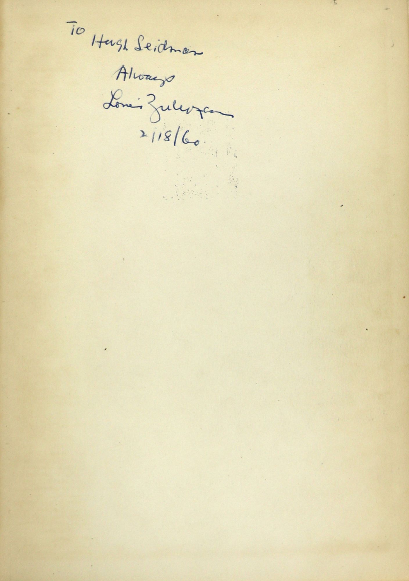 Inscribed and signed on front free endpaper, "To Hugh Seidman / Always, Louis Zukofsky / 2/18/60." Together with Seidman's ownership signature and rubber-stamp to front pastedown. An excellent association copy inscribed to Zukofsky's protege and prized student, the late poet Hugh Seidman (1940-2023).