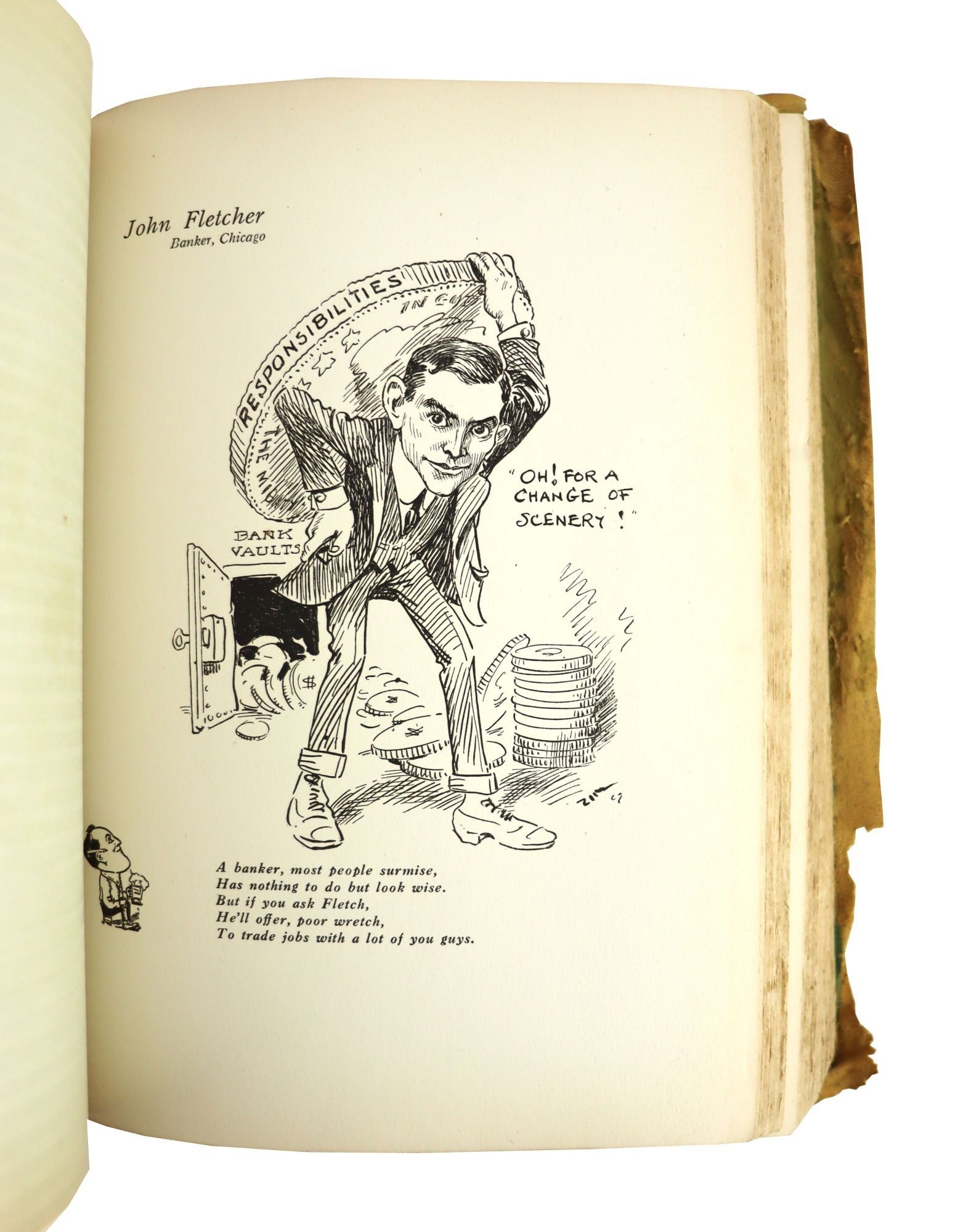 Chicago: Carbery & Reed, 1919. Very Good -. Chicago: [Carbery & Reed], 1919. First and Only Edition. Thick quarto (27.5cm); original cord-tied limp green reverse calf, upper cover lettered in gilt; [200]ll. printed on rectos only, interleaved with tissue guards; illus. throughout "by regular cartoonists." Binding quite worn and toned as usual with some stripping and brief loss to margins; a Good copy only, though contents remain clean and sound.
