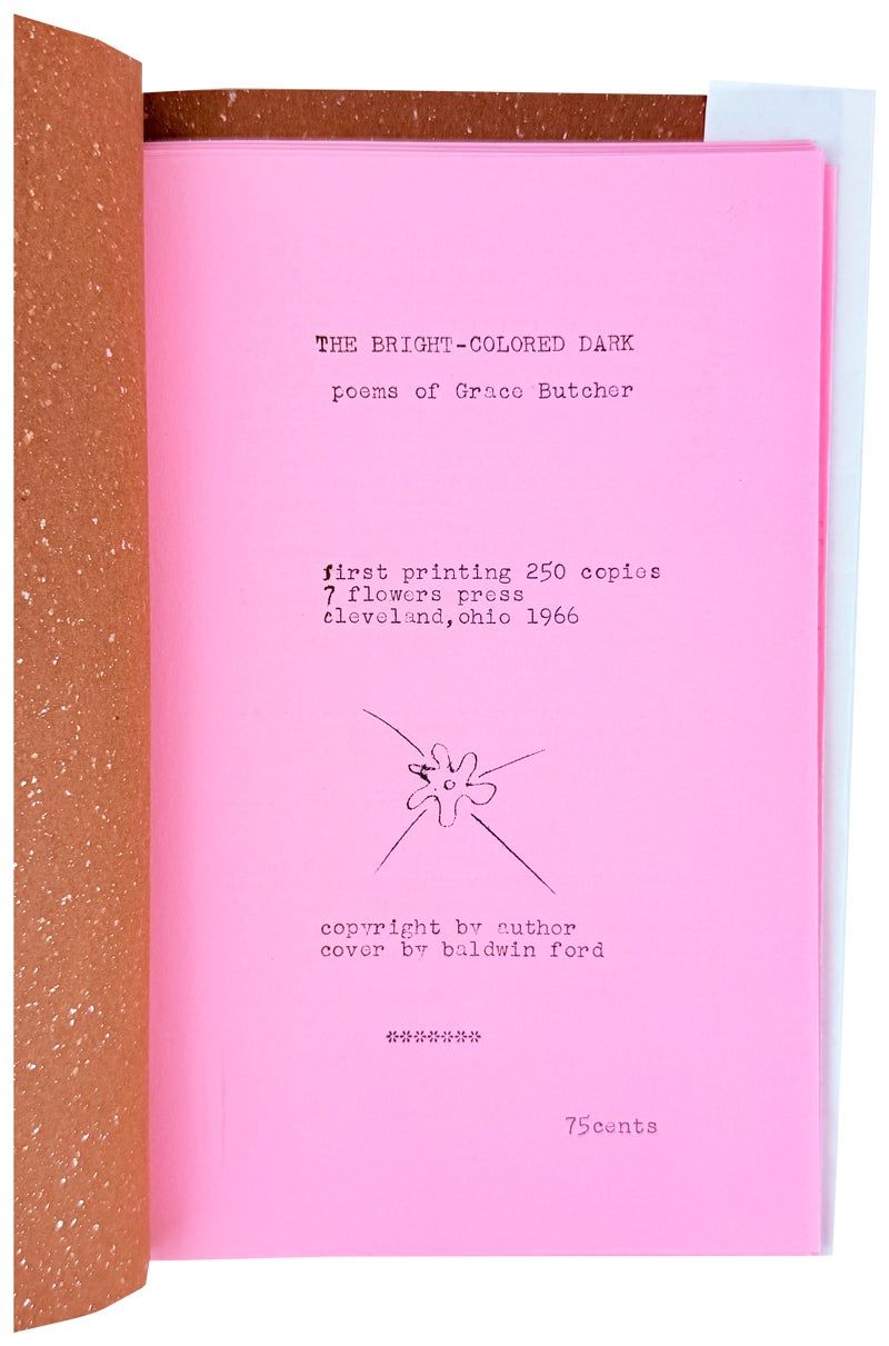 Cleveland, OH: 7 Flowers Press, 1966. Fine. Cleveland, OH: 7 Flowers Press, 1966. First Edition, Limited to 250 copies. Octavo; publisher's wrappers, with pictorial paste-on to upper cover; [22]pp. printed mimeograph on pink stock. A Fine example of this rare piece of Cleveland School poetry. With the distributor's rubber-stamp on rear wrapper, "Sold & Distributed by Asphodel Book Shop / 465 The Arcade / Cleveland, Ohio.