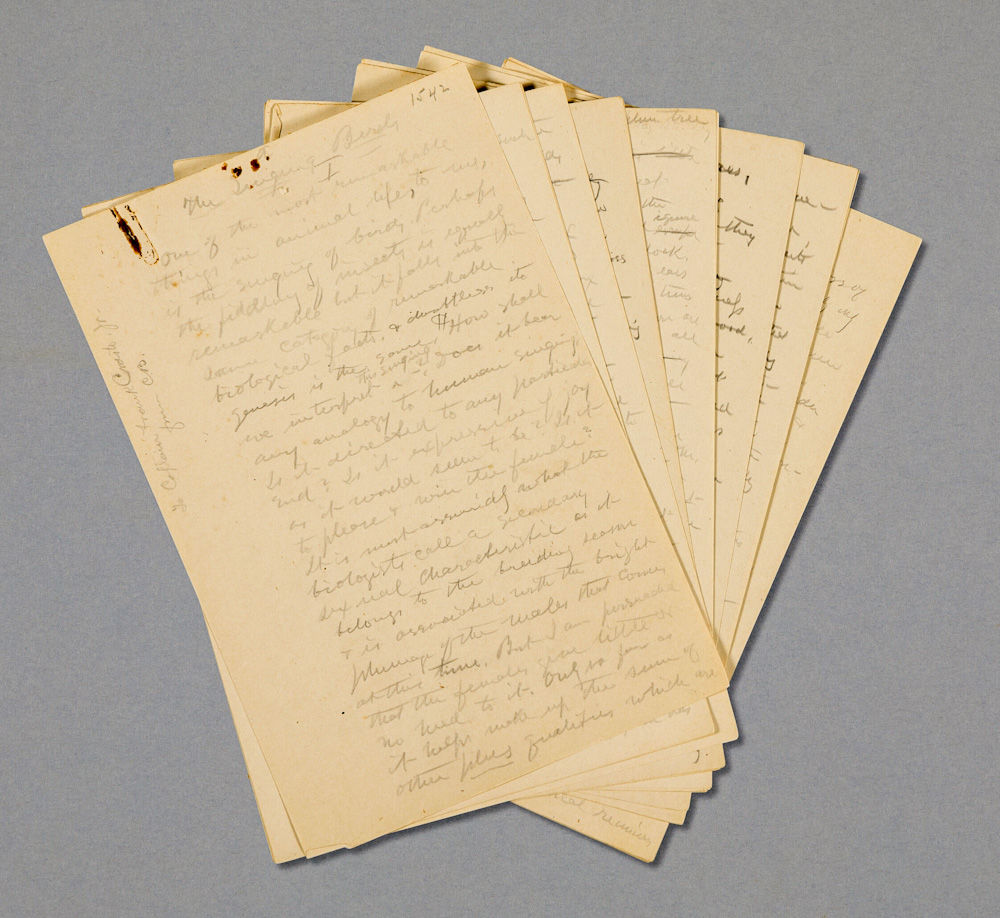 July 1917. Manuscript. A few rust stains at head of first leaf (and diminishing through the fourth leaf) and verso of final leaf; tiny puncture in blank area below title on first leaf; last leaf slightly worn at edges with a crease; pencil light on a few pages. Near Fine and desirable example of a Burroughs manuscript on one of his favorite subjects. Original manuscript of an essay titled The Singing Birds: 21-pages in pencil with corrections, mostly on rectos of 6" x 9" sheets, SIGNED and dated by Burroughs at the conclusion. Housed in a cloth chemise and green morocco-backed clamshell box. Written in two parts, the first section headed I contains 5 pages of manuscript which he has re-numbered from 1[-5] to a[-e] at head; the second section begins July 14 and is headed II containing 15 numbered pages and one inserted unnumbered sheet. The manuscript begins: One of the most remarkable things in animal life, to me, is the singing of birds. Perhaps the fiddling of insects is equally remarkable but it falls in the same category of remarkable biological facts, & doubtless its genesis is the same. How shall we interpret this singing? Does it bear any analogy to human singing? Is it directed to any particular end? According to a note, which is included, on an exhibition envelope from 1934 at the American Academy of Arts and Letters in New York, this manuscript was written by Burroughs at his home in Woodchuck Lodge, in Roxbury, New York during July of 1917.