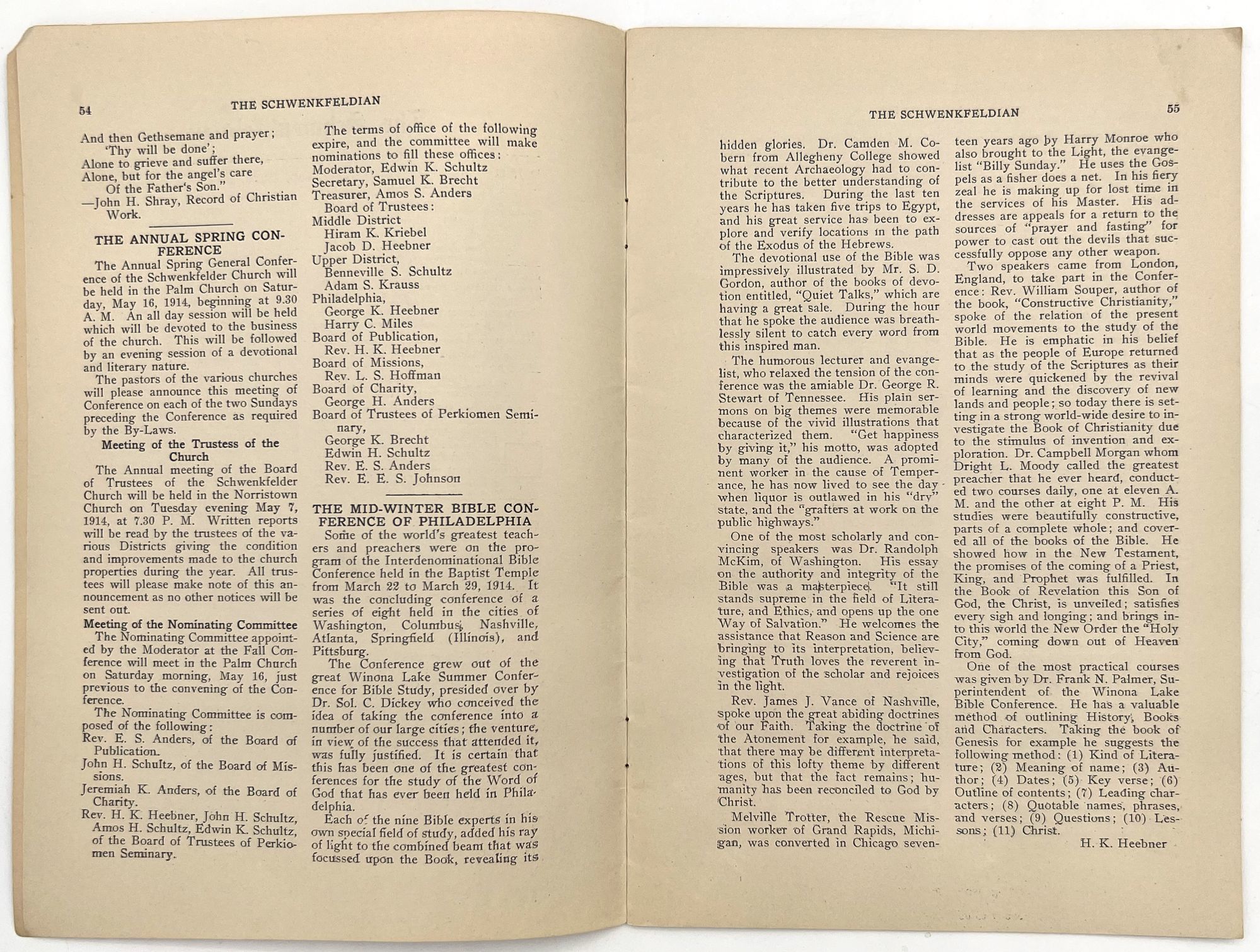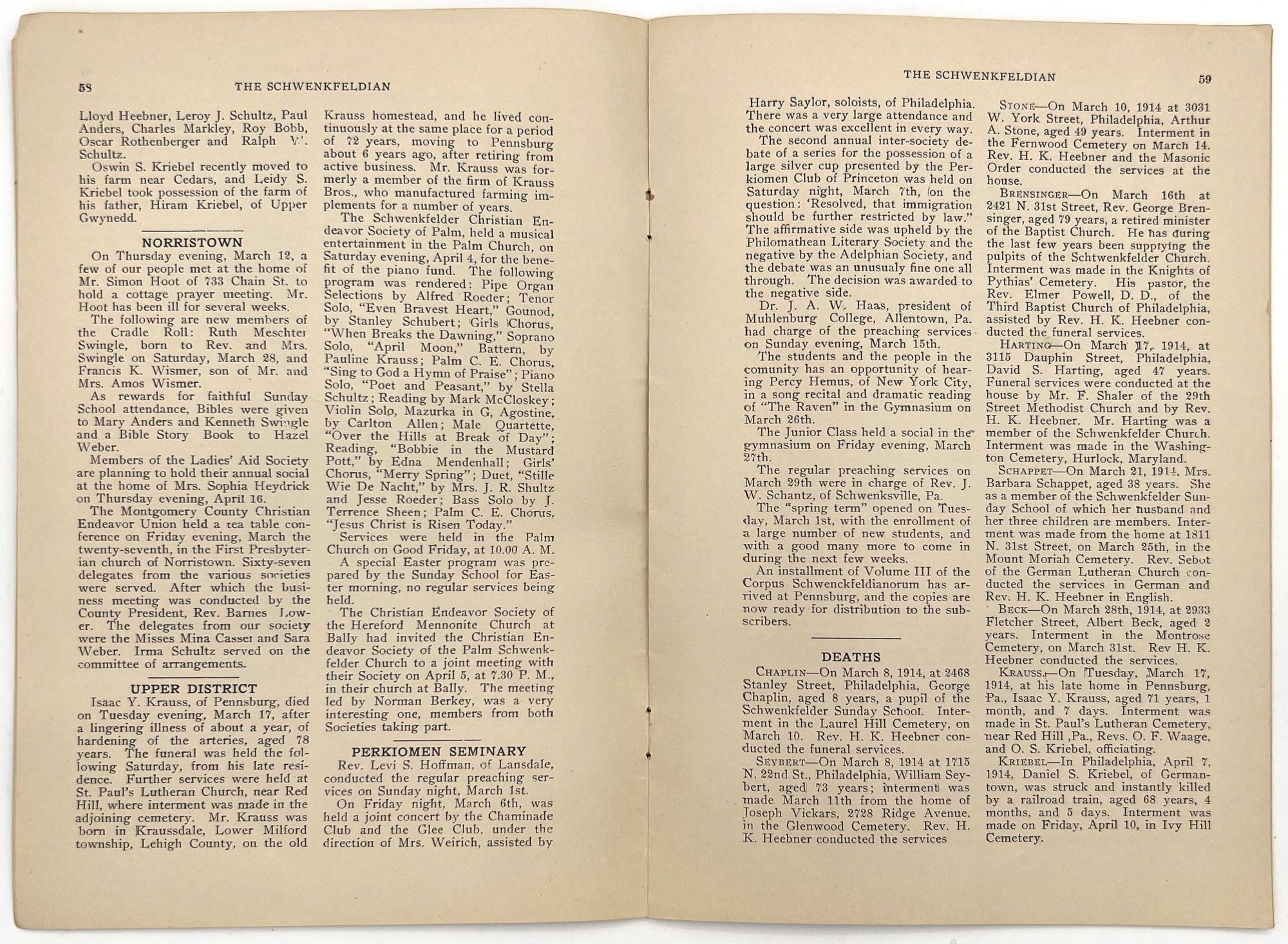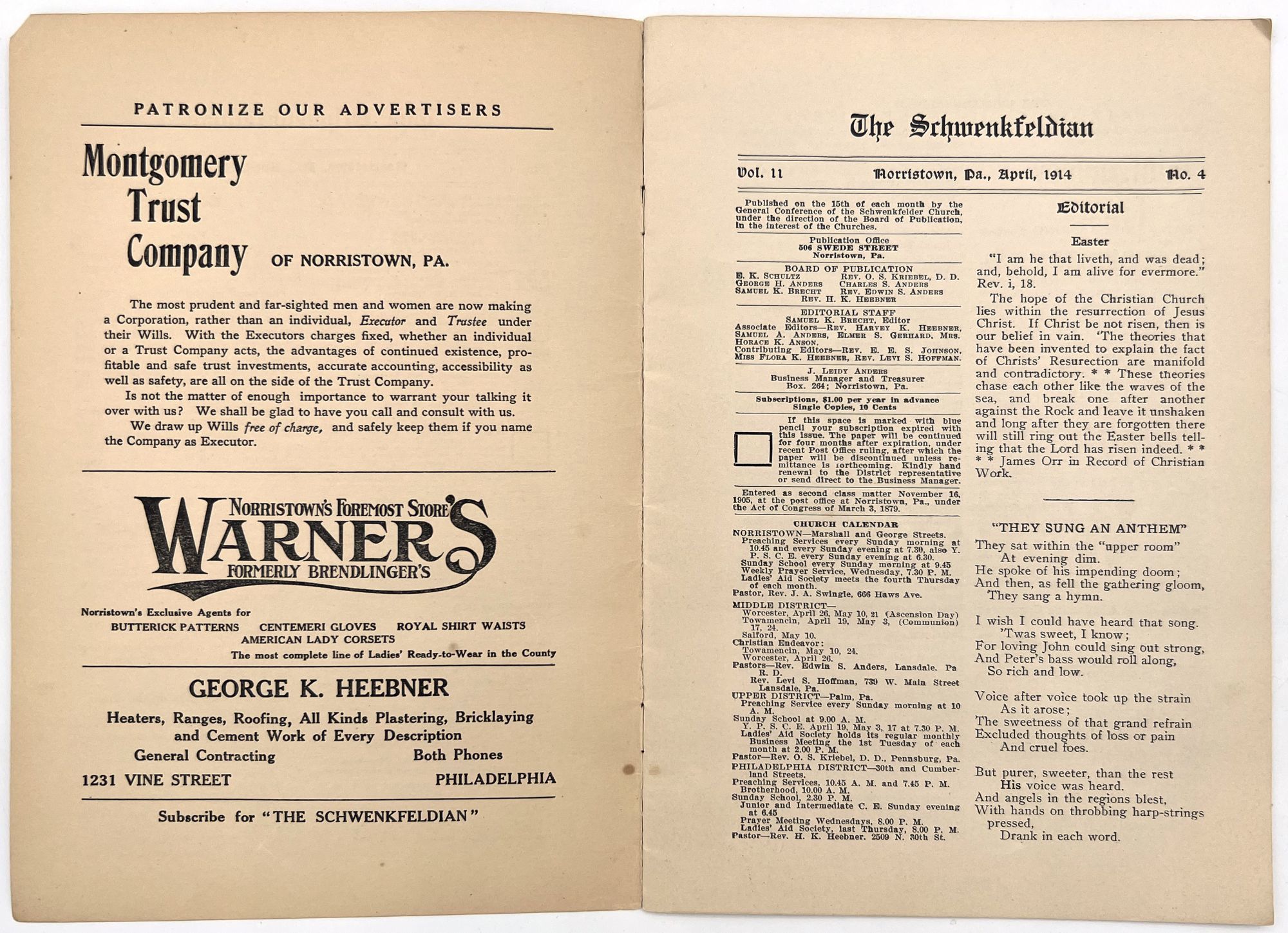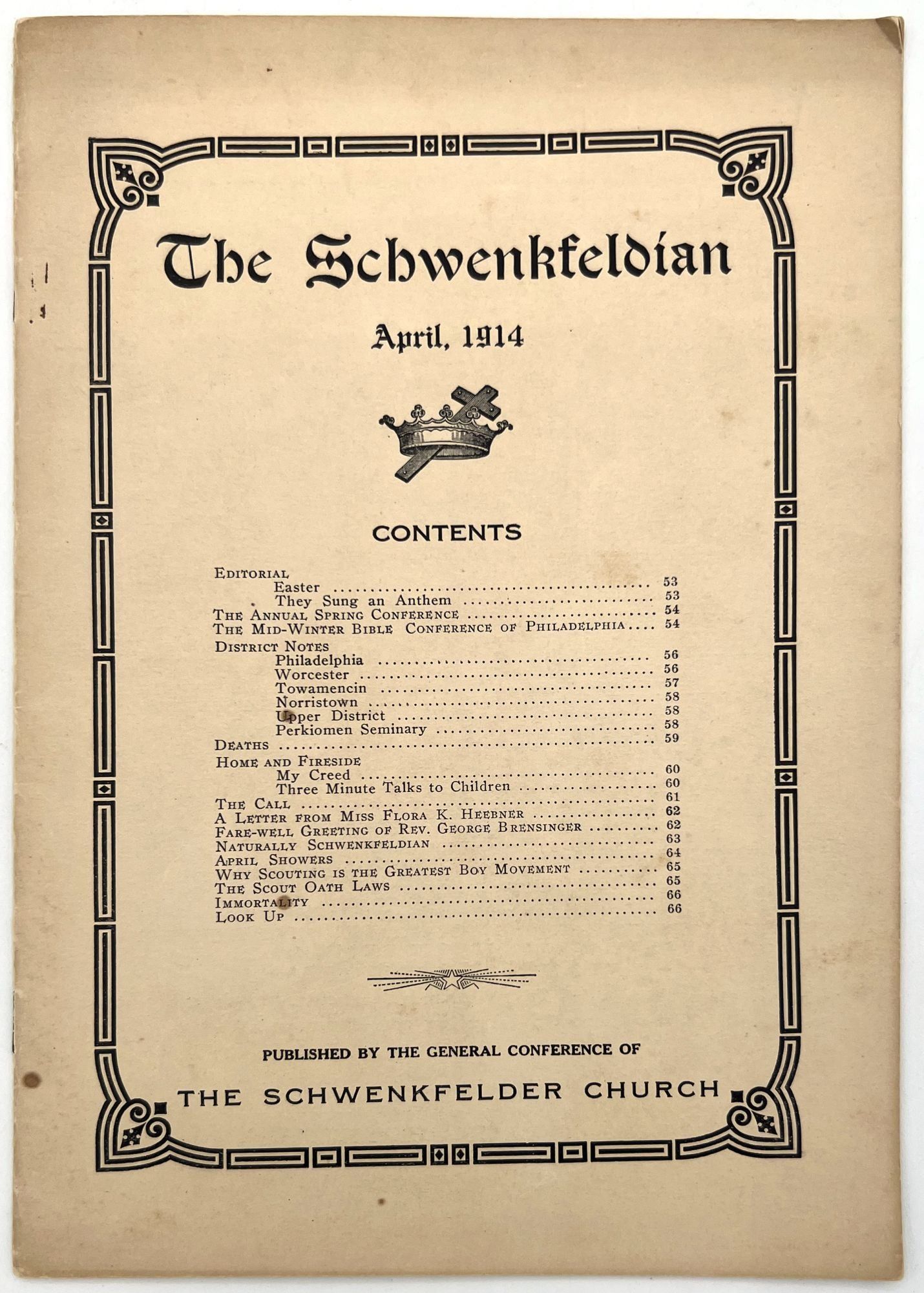 Norristown, Pennsylvania: Published by the General Conference of the Schwenkfelder Church, 1914. Very good. Minor rust staining from staples.. The April 1914 issue of "The Schwenkfeldian", a serial published "by the General Conference of the Schwenkfelder Church" in Pennsylvania. The Church was formed in the early 1900s and follows the teachings of the Protestant Reformation figure Caspar Schwenkfeld von Ossig (1489-1561). Schwenkfelders have existed in the United States since the 1700s. This issue of "The Schwenkfeldian" contains poetry, a report on their recent conferences, member news (e.g. recent deaths or meetings), an article on local Boy Scout groups, and a section titled "Home and Fireside" by "Mrs. H.K. Anson" with moral advice for children. Single vol. (10" by 6.75"), pp. [53]-68, stapled in original printed wrps.